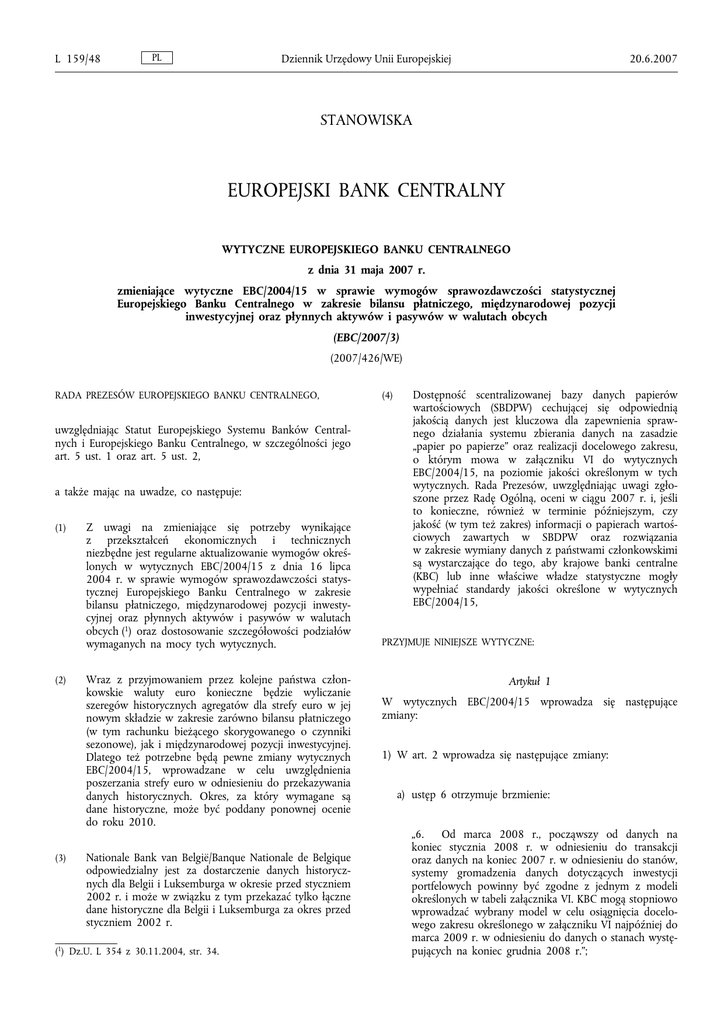 L 159/48 PL Dziennik Urzędowy Unii Europejskiej 20.6.2007 STANOWISKA EUROPEJSKI BANK CENTRALNY WYTYCZNE EUROPEJSKIEGO BANKU CENTRALNEGO z dnia 31 maja 2007 r. zmieniające wytyczne EBC/2004/15 w sprawie wymogów sprawozdawczości statystycznej Europejskiego Banku Centralnego w zakresie bilansu płatniczego, międzynarodowej pozycji inwestycyjnej oraz płynnych aktywów i pasywów w walutach obcych (EBC/2007/3) (2007/426/WE) RADA PREZESÓW EUROPEJSKIEGO BANKU CENTRALNEGO, uwzględniając Statut Europejskiego Systemu Banków Centralnych i Europejskiego Banku Centralnego, w szczególności jego art. 5 ust. 1 oraz art. 5 ust. 2, a także mając na uwadze, co następuje: (1) (2) (3) Z uwagi na zmieniające się potrzeby wynikające z przekształceń ekonomicznych i technicznych niezbędne jest regularne aktualizowanie wymogów określonych w wytycznych EBC/2004/15 z dnia 16 lipca 2004 r. w sprawie wymogów sprawozdawczości statystycznej Europejskiego Banku Centralnego w zakresie bilansu płatniczego, międzynarodowej pozycji inwestycyjnej oraz płynnych aktywów i pasywów w walutach obcych (1) oraz dostosowanie szczegółowości podziałów wymaganych na mocy tych wytycznych. Wraz z przyjmowaniem przez kolejne państwa członkowskie waluty euro konieczne będzie wyliczanie szeregów historycznych agregatów dla strefy euro w jej nowym składzie w zakresie zarówno bilansu płatniczego (w tym rachunku bieżącego skorygowanego o czynniki sezonowe), jak i międzynarodowej pozycji inwestycyjnej. Dlatego też potrzebne będą pewne zmiany wytycznych EBC/2004/15, wprowadzane w celu uwzględnienia poszerzania strefy euro w odniesieniu do przekazywania danych historycznych. Okres, za który wymagane są dane historyczne, może być poddany ponownej ocenie do roku 2010. Nationale Bank van België/Banque Nationale de Belgique odpowiedzialny jest za dostarczenie danych historycznych dla Belgii i Luksemburga w okresie przed styczniem 2002 r. i może w związku z tym przekazać tylko łączne dane historyczne dla Belgii i Luksemburga za okres przed styczniem 2002 r. (1) Dz.U. L 354 z 30.11.2004, str. 34. (4) Dostępność scentralizowanej bazy danych papierów wartościowych (SBDPW) cechującej się odpowiednią jakością danych jest kluczowa dla zapewnienia sprawnego działania systemu zbierania danych na zasadzie „papier po papierze” oraz realizacji docelowego zakresu, o którym mowa w załączniku VI do wytycznych EBC/2004/15, na poziomie jakości określonym w tych wytycznych. Rada Prezesów, uwzględniając uwagi zgłoszone przez Radę Ogólną, oceni w ciągu 2007 r. i, jeśli to konieczne, również w terminie późniejszym, czy jakość (w tym też zakres) informacji o papierach wartościowych zawartych w SBDPW oraz rozwiązania w zakresie wymiany danych z państwami członkowskimi są wystarczające do tego, aby krajowe banki centralne (KBC) lub inne właściwe władze statystyczne mogły wypełniać standardy jakości określone w wytycznych EBC/2004/15, PRZYJMUJE NINIEJSZE WYTYCZNE: Artykuł 1 W wytycznych EBC/2004/15 wprowadza się następujące zmiany: 1) W art. 2 wprowadza się następujące zmiany: a) ustęp 6 otrzymuje brzmienie: „6. Od marca 2008 r., począwszy od danych na koniec stycznia 2008 r. w odniesieniu do transakcji oraz danych na koniec 2007 r. w odniesieniu do stanów, systemy gromadzenia danych dotyczących inwestycji portfelowych powinny być zgodne z jednym z modeli określonych w tabeli załącznika VI. KBC mogą stopniowo wprowadzać wybrany model w celu osiągnięcia docelowego zakresu określonego w załączniku VI najpóźniej do marca 2009 r. w odniesieniu do danych o stanach występujących na koniec grudnia 2008 r.”; 20.6.2007 PL Dziennik Urzędowy Unii Europejskiej b) dodaje się ustęp 7 w następującym brzmieniu: „7. a) W odniesieniu do państwa członkowskiego, które przyjmie walutę euro w dniu 1 stycznia 2007 r. lub po tej dacie, zarówno KBC tego państwa członkowskiego, jak i KBC wszystkich pozostałych uczestniczących państw członkowskich przekazują do EBC, w chwili przyjęcia przez to państwo członkowskie waluty euro, dane historyczne zgodnie z wymogami określonymi w tabelach 1–8 załącznika II w celu umożliwienia wytworzenia agregatów statystycznych obejmujących strefę euro w jej nowym składzie. KBC przekazują dane historyczne za okresy wyszczególnione poniżej, z wyjątkiem podziałów wymienionych w tabeli 13, dla których zakres przekazania danych określono w tej tabeli. Wszystkie dane historyczne mogą być przygotowane w oparciu o najlepsze dostępne oszacowania. i) jeżeli państwo członkowskie, które przyjmuje walutę euro, przystąpiło do UE przed majem 2004 r., dane historyczne obejmują co najmniej okres od 1999 r.; ii) jeżeli państwo członkowskie, które przyjmuje walutę euro, przystąpiło do UE w maju 2004 r., dane historyczne obejmują co najmniej okres od 2004 r.; iii) jeżeli państwo członkowskie, które przyjmuje walutę euro, przystąpiło do UE po maju 2004 r., dane historyczne obejmują co najmniej okres od dnia przystąpienia do UE; b) jeśli dane historyczne, o których mowa w lit. a), nie obejmują obserwacji miesięcznych za okres pięciu lat dla każdej z czterech głównych pozycji rachunku bieżącego bilansu płatniczego, a mianowicie towarów, usług, dochodów i transferów bieżących, wówczas KBC zapewnią, aby przekazane przez nie dane zawierały te obserwacje; c) Na mocy odstępstwa od postanowień lit. a) Banque centrale du Luxembourg nie ma obowiązku przekazania danych historycznych za okres do końca grudnia 2001 r., a Nationale Bank van België/Banque Nationale de Belgique przekazuje dane łączne dla Belgii i Luksemburga za okres kończący się w grudniu 2001 r.”. L 159/49 2) W artykule 3 wprowadza się następujące zmiany: ustęp 6 otrzymuje następujące brzmienie: „6. Dane o transakcjach i stanach dla dłużnych papierów wartościowych w podziale według waluty 