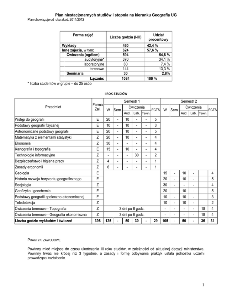 Plan niestacjonarnych studiów I stopnia na kierunku Geografia UG 1