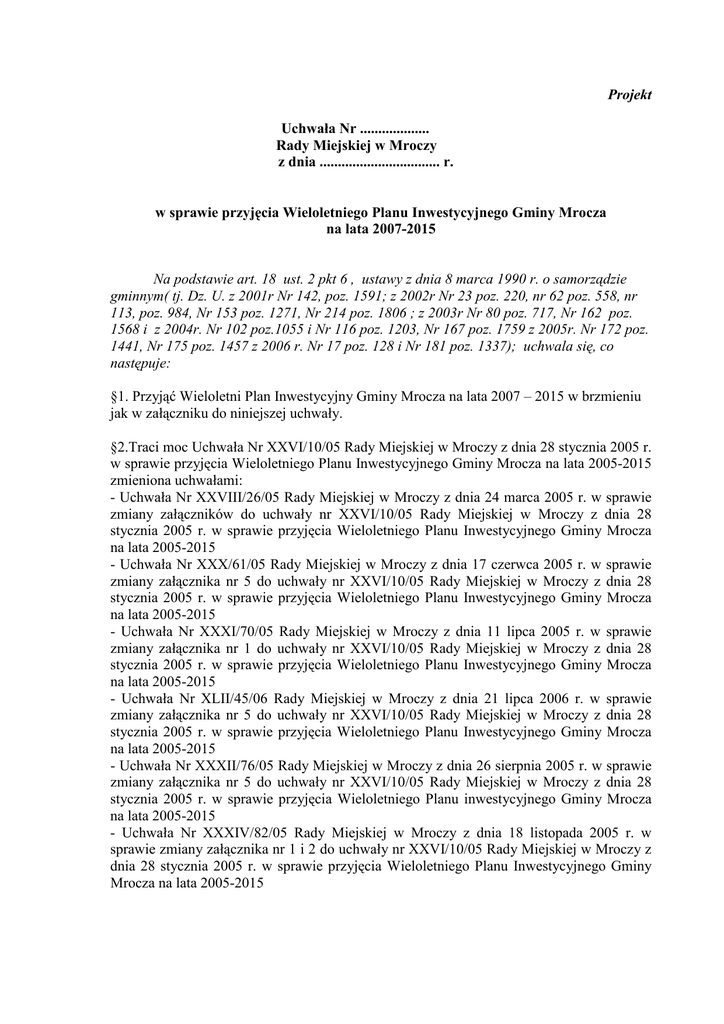 Projekt Uchwała Nr ................... Rady Miejskiej w Mroczy z dnia ................................. r. w sprawie przyjęcia Wieloletniego Planu Inwestycyjnego Gminy Mrocza na lata 2007-2015 Na podstawie art. 18 ust. 2 pkt 6 , ustawy z dnia 8 marca 1990 r. o samorządzie gminnym( tj. Dz. U. z 2001r Nr 142, poz. 1591; z 2002r Nr 23 poz. 220, nr 62 poz. 558, nr 113, poz. 984, Nr 153 poz. 1271, Nr 214 poz. 1806 ; z 2003r Nr 80 poz. 717, Nr 162 poz. 1568 i z 2004r. Nr 102 poz.1055 i Nr 116 poz. 1203, Nr 167 poz. 1759 z 2005r. Nr 172 poz. 1441, Nr 175 poz. 1457 z 2006 r. Nr 17 poz. 128 i Nr 181 poz. 1337); uchwala się, co następuje: §1. Przyjąć Wieloletni Plan Inwestycyjny Gminy Mrocza na lata 2007 – 2015 w brzmieniu jak w załączniku do niniejszej uchwały. §2.Traci moc Uchwała Nr XXVI/10/05 Rady Miejskiej w Mroczy z dnia 28 stycznia 2005 r. w sprawie przyjęcia Wieloletniego Planu Inwestycyjnego Gminy Mrocza na lata 2005-2015 zmieniona uchwałami: - Uchwała Nr XXVIII/26/05 Rady Miejskiej w Mroczy z dnia 24 marca 2005 r. w sprawie zmiany załączników do uchwały nr XXVI/10/05 Rady Miejskiej w Mroczy z dnia 28 stycznia 2005 r. w sprawie przyjęcia Wieloletniego Planu Inwestycyjnego Gminy Mrocza na lata 2005-2015 - Uchwała Nr XXX/61/05 Rady Miejskiej w Mroczy z dnia 17 czerwca 2005 r. w sprawie zmiany załącznika nr 5 do uchwały nr XXVI/10/05 Rady Miejskiej w Mroczy z dnia 28 stycznia 2005 r. w sprawie przyjęcia Wieloletniego Planu Inwestycyjnego Gminy Mrocza na lata 2005-2015 - Uchwała Nr XXXI/70/05 Rady Miejskiej w Mroczy z dnia 11 lipca 2005 r. w sprawie zmiany załącznika nr 1 do uchwały nr XXVI/10/05 Rady Miejskiej w Mroczy z dnia 28 stycznia 2005 r. w sprawie przyjęcia Wieloletniego Planu Inwestycyjnego Gminy Mrocza na lata 2005-2015 - Uchwała Nr XLII/45/06 Rady Miejskiej w Mroczy z dnia 21 lipca 2006 r. w sprawie zmiany załącznika nr 5 do uchwały nr XXVI/10/05 Rady Miejskiej w Mroczy z dnia 28 stycznia 2005 r. w sprawie przyjęcia Wieloletniego Planu Inwestycyjnego Gminy Mrocza na lata 2005-2015 - Uchwała Nr XXXII/76/05 Rady Miejskiej w Mroczy z dnia 26 sierpnia 2005 r. w sprawie zmiany załącznika nr 5 do uchwały nr XXVI/10/05 Rady Miejskiej w Mroczy z dnia 28 stycznia 2005 r. w sprawie przyjęcia Wieloletniego Planu inwestycyjnego Gminy Mrocza na lata 2005-2015 - Uchwała Nr XXXIV/82/05 Rady Miejskiej w Mroczy z dnia 18 listopada 2005 r. w sprawie zmiany załącznika nr 1 i 2 do uchwały nr XXVI/10/05 Rady Miejskiej w Mroczy z dnia 28 stycznia 2005 r. w sprawie przyjęcia Wieloletniego Planu Inwestycyjnego Gminy Mrocza na lata 2005-2015 - Uchwała Nr XLII/45/06 Rady Miejskiej w Mroczy z dnia 21 lipca 2006 r. w sprawie zmiany załącznika nr 5 do uchwały nr XXVI/10/05 Rady Miejskiej w Mroczy z dnia 28 stycznia 2005 r. w sprawie przyjęcia Wieloletniego Planu Inwestycyjnego Gminy Mrocza na lata 2005-2015 §3. Wykonanie uchwały powierzyć Burmistrzowi Miasta i Gminy Mrocza §3. Uchwała wchodzi w Ŝycie z dniem podjęcia i podlega ogłoszeniu w sposób zwyczajowo przyjęty na terenie Gminy Mrocza. UZASADNIENIE do uchwały w sprawie Inwestycyjnego Gminy Mrocza na lata 2007-2015 przyjęcia Wieloletniego Planu Wobec duŜego zakresu potrzeb rzeczowych i równocześnie przy ograniczonych zasobach środków finansowych realizacja planów rozwojowych Miasta i Gminy Mrocza wymaga się szczególnej racjonalizacji procesów decyzyjnych w programowaniu inwestycji. Wieloletniego Planu Inwestycyjnego (WPI), jest instrumentem organizującym prace nad określeniem potrzeb inwestycyjnych, ich uzasadnienie, ocenę i kwalifikację do realizacji w ramach planu inwestycyjnego. Uzasadnienie wdroŜenia Wieloletniego Planu Inwestycyjnego wynika z zakresu i charakteru prac prowadzonych w trakcie tworzenia tego dokumentu i funkcji po jego uchwaleniu. Wieloletni Plan Inwestycyjny jest dokumentem: - - porządkującym fazy procesu inwestycyjnego, począwszy od prac przygotowawczych obejmujących opracowanie koncepcji, studiów programowych, rozwianie problemów terenowo-prawnych poprzez opracowanie dokumentacji wykonawczej do etapu realizacji inwestycji, optymalizującym zakres rzeczowych potrzeb inwestycyjnych wobec moŜliwości finansowych Gminy Mrocza, umoŜliwiającym starania bądź pomocnym w uzyskaniu środków finansowych na inwestycje ze źródeł zewnętrznych, wykorzystywanym jako instrument komunikacji społecznej władz Gminy Mrocza ze społecznością lokalną, uczestniczącą w perspektywicznym programowaniu rozwoju Gminy.