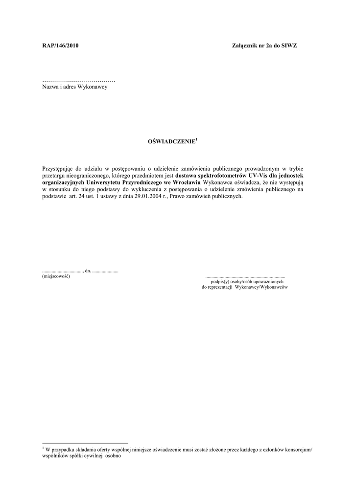 Załącznik nr 2a do SIWZ RAP/146/2010 ………………………………. Nazwa i adres Wykonawcy OŚWIADCZENIE1 Przystępując do udziału w postępowaniu o udzielenie zamówienia publicznego prowadzonym w trybie przetargu nieograniczonego, którego przedmiotem jest dostawa spektrofotometrów UV-Vis dla jednostek organizacyjnych Uniwersytetu Przyrodniczego we Wrocławiu Wykonawca oświadcza, że nie występują w stosunku do niego podstawy do wykluczenia z postępowania o udzielenie zmówienia publicznego na podstawie art. 24 ust. 1 ustawy z dnia 29.01.2004 r., Prawo zamówień publicznych. .................................., dn. ...................... (miejscowość) 1 ................................................................... podpis(y) osoby/osób upoważnionych do reprezentacji Wykonawcy/Wykonawców W przypadku składania oferty wspólnej niniejsze oświadczenie musi zostać złożone przez każdego z członków konsorcjum/ wspólników spółki cywilnej osobno