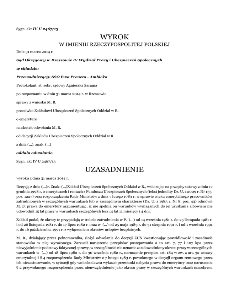 Sygn. akt IV U 2467/13 WYROK W IMIENIU RZECZYPOSPOLITEJ POLSKIEJ Dnia 31 marca 2014 r. Sąd Okręgowy w Rzeszowie IV Wydział Pracy i Ubezpieczeń Społecznych w składzie: Przewodniczący: SSO Ewa Preneta - Ambicka Protokolant: st. sekr. sądowy Agnieszka Sarama po rozpoznaniu w dniu 31 marca 2014 r. w Rzeszowie sprawy z wniosku M. B. przeciwko Zakładowi Ubezpieczeń Społecznych Oddział w R. o emeryturę na skutek odwołania M. B. od decyzji Zakładu Ubezpieczeń Społecznych Oddział w R. z dnia (...). znak (...) oddala odwołanie. Sygn. akt IV U 2467/13 UZASADNIENIE wyroku z dnia 31 marca 2014 r. Decyzją z dnia (...)r. Znak: (...)Zakład Ubezpieczeń Społecznych Oddział w R., wskazując na przepisy ustawy z dnia 17 grudnia 1998 r. o emeryturach i rentach z Funduszu Ubezpieczeń Społecznych (tekst jednolity Dz. U. z 2009 r. Nr 153, poz. 1227) oraz rozporządzenia Rady Ministrów z dnia 7 lutego 1983 r. w sprawie wieku emerytalnego pracowników zatrudnionych w szczególnych warunkach lub w szczególnym charakterze (Dz. U. z 1983 r. Nr 8, poz. 43) odmówił M. B. prawa do emerytury argumentując, iż nie spełnia on warunków wymaganych do jej uzyskania albowiem nie udowodnił 15 lat pracy w warunkach szczególnych lecz 14 lat 11 miesięcy i 4 dni. Zakład podał, że okresy te przypadają w trakcie zatrudnienia w P. (...) od 14 września 1981 r. do 25 listopada 1981 r. i od 26 listopada 1981 r. do 17 lipca 1982 r. oraz w (...) od 25 maja 1983 r. do 31 sierpnia 1991 r. i od 1 września 1991 r. do 16 października 1991 r. z wyłączeniem okresów urlopów bezpłatnych. M. B., działający przez pełnomocnika, złożył odwołanie do decyzji ZUS kwestionując prawidłowość i zasadność stanowiska w niej wyrażonego. Zarzucił naruszenie przepisów postępowania a to art. 7, 77 i 107 kpa przez niewyjaśnienie podstawy faktycznej sprawy, w szczególności nie uznanie za udowodniony okresu pracy w szczególnych warunkach w (...) od 18 lipca 1982 r. do 30 września 1982 r., naruszenie przepisu art. 184 w zw. z art. 32 ustawy emerytalnej i § 4 rozporządzenia Rady Ministrów z 7 lutego 1983 r. powołanego w decyzji organu rentowego przez ich niezastosowanie, w sytuacji gdy wnioskodawca wykazał przesłanki nabycia prawa do emerytury oraz naruszenie § 2 przywołanego rozporządzenia przez nieuwzględnienie jako okresu pracy w szczególnych warunkach czasokresu zatrudnienia od 18 lipca 1982 r. do 30 września 1982 r. pomimo przedstawienia na okoliczność uprzedniego świadectwa pracy. Wskazując na powyższe odwołujący domagał się zmiany decyzji ZUS i przyznania prawa do emerytury oraz zasądzenia na swą rzecz kosztów zastępstwa procesowego. W odpowiedzi na odwołanie organ rentowy wnosił o jego oddalenie z przyczyn tożsamych co wyrażone w zaskarżonej decyzji. Wskazał, że okres przypadający po powrocie wnioskodawcy z kontraktu zagranicznego do czasu podjęcia pracy w firmie (...) nie stanowi okresu składkowego w rozumieniu art. 6 ustawy o emeryturach i rentach z FUS ani też okresu nieskładkowego. Raz jeszcze Zakład podkreślił, że nie ma podstaw do uwzględnienia roszczenia i przyznania M. B. prawa do emerytury w trybie art. 184 ustawy emerytalnej. Poza sporem pozostaje, że M. B. na dzień 1 stycznia 1999 r. udowodnił ponad 25 lat okresów składkowych i nieskładkowych oraz 14 lat 11 miesięcy i 4 dni pracy wykonywanej w szczególnych warunkach w P. (...) od 14 września 1981 r. do 25 listopada 1981 r. i od 26 listopada 1981 r. do 17 lipca 1982 r. oraz w (...) od 25 maja 1983 r. do 31 sierpnia 1991 r. i od 1 września 1991 r. do 16 października 1991 r. Nie jest członkiem Otwartego Funduszu Emerytalnego. Sąd ustalił następujący stan faktyczny: M. B. urodził się (...). W okresie od 6 stycznia 1978 r. do 19 maja 1983 r. zatrudniony był w (...) S., później P. – (...). W okresie od 26 listopada 1981 r. do 17 lipca 1982 r. wnioskodawca przebywał na budowie eksportowej w I.. 18 lipca do 24 lipca 1982 r. nastąpił powrót w/w do kraju, od 26 lipca do 24 sierpnia 1982 r. wnioskodawca korzystał z urlopu wypoczynkowego dewizowego, od 25 sierpnia do 7 września 1982 r. z dni wolnych po eksporcie z tytułu różnic czasu pracy. Następnie od 3 września do 30 września 1982 r. przebywał na zwolnieniu lekarskim a od 1 października do 10 października 1982 r. na urlopie bezpłatnym. Do pracy po eksporcie M. B. powrócił 11 października 1982 r. Pracodawca wydał w/w świadectwo potwierdzające wykonywanie pracy w warunkach szczególnych przy montażu konstrukcji metalowych na wysokości od 14 września 1981 r. do 25 listopada 1981 r. oraz od 26 listopada 1981 r. do 10 października 1982 r. z wyłączeniem okresu urlopu bezpłatnego przypadającego od 1 do 10 października 1982 r. Następnie M. B. od 25 maja 1983 r. do 16 października 1998 r. zatrudniony był w (...) S.A. Również za ten okres zatrudnienia posiada świadectwo pracy w warunkach szczególnych wystawione przez pracodawcę. M. B. w dniu 29 sierpnia 2013 r. złożył w ZUS wniosek o przyznanie mu prawa do emerytury, dołączając posiadane dokumenty. Decyzją z dnia 18 września 2013 r. ZUS odmówił wnioskodawcy przyznania prawa do emerytury na podstawie art. 184 ustawy o emeryturach i rentach z FUS, podając, że na dzień 31 grudnia1998r. nie wykazał on 15 lat zatrudnienia w szczególnych warunkach. Powyższy stan faktyczny Sąd ustalił w oparciu o dowody z dokumentów zgromadzonych w postępowaniu przez organem rentowym, których treść i forma nie budziły wątpliwości oraz akta osobowe wnioskodawcy. Sąd zważył, co następuje: Odwołanie M. B. nie jest uzasadnione skutkiem czego nie mogło wpłynąć na rewizję przez Sąd stanowiska ZUS wyrażonego w zaskarżonej decyzji. W ocenie Sądu organ rentowy zasadnie nie uwzględnił przy ustalaniu stażu pracy wnioskodawcy w warunkach szczególnych okresu tzw. rozliczeń po eksporcie przypadającego od 18 lipca 1982 r. do 30 września 198