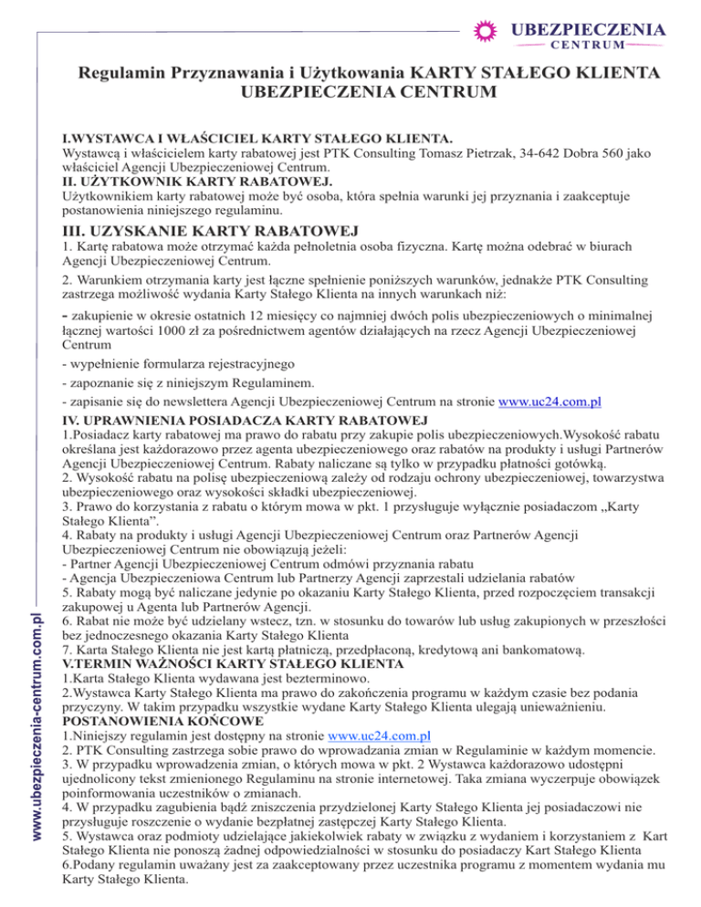 Regulamin Przyznawania i Użytkowania KARTY STAŁEGO KLIENTA UBEZPIECZENIA CENTRUM I.WYSTAWCA I WŁAŚCICIEL KARTY STAŁEGO KLIENTA. Wystawcą i właścicielem karty rabatowej jest PTK Consulting Tomasz Pietrzak, 34-642 Dobra 560 jako właściciel Agencji Ubezpieczeniowej Centrum. II. UŻYTKOWNIK KARTY RABATOWEJ. Użytkownikiem karty rabatowej może być osoba, która spełnia warunki jej przyznania i zaakceptuje postanowienia niniejszego regulaminu. III. UZYSKANIE KARTY RABATOWEJ 1. Kartę rabatowa może otrzymać każda pełnoletnia osoba fizyczna. Kartę można odebrać w biurach Agencji Ubezpieczeniowej Centrum. 2. Warunkiem otrzymania karty jest łączne spełnienie poniższych warunków, jednakże PTK Consulting zastrzega możliwość wydania Karty Stałego Klienta na innych warunkach niż: - zakupienie w okresie ostatnich 12 miesięcy co najmniej dwóch polis ubezpieczeniowych o minimalnej łącznej wartości 1000 zł za pośrednictwem agentów działających na rzecz Agencji Ubezpieczeniowej Centrum - wypełnienie formularza rejestracyjnego - zapoznanie się z niniejszym Regulaminem. - zapisanie się do newslettera Agencji Ubezpieczeniowej Centrum na stronie www.uc24.com.pl IV. UPRAWNIENIA POSIADACZA KARTY RABATOWEJ 1.Posiadacz karty rabatowej ma prawo do rabatu przy zakupie polis ubezpieczeniowych.Wysokość rabatu określana jest każdorazowo przez agenta ubezpieczeniowego oraz rabatów na produkty i usługi Partnerów Agencji Ubezpieczeniowej Centrum. Rabaty naliczane są tylko w przypadku płatności gotówką. 2. Wysokość rabatu na polisę ubezpieczeniową zależy od rodzaju ochrony ubezpieczeniowej, towarzystwa ubezpieczeniowego oraz wysokości składki ubezpieczeniowej. 3. Prawo do korzystania z rabatu o którym mowa w pkt. 1 przysługuje wyłącznie posiadaczom „Karty Stałego Klienta”. 4. Rabaty na produkty i usługi Agencji Ubezpieczeniowej Centrum oraz Partnerów Agencji Ubezpieczeniowej Centrum nie obowiązują jeżeli: - Partner Agencji Ubezpieczeniowej Centrum odmówi przyznania rabatu - Agencja Ubezpieczeniowa Centrum lub Partnerzy Agencji zaprzestali udzielania rabatów 5. Rabaty mogą być naliczane jedynie po okazaniu Karty Stałego Klienta, przed rozpoczęciem transakcji zakupowej u Agenta lub Partnerów Agencji. 6. Rabat nie może być udzielany wstecz, tzn. w stosunku do towarów lub usług zakupionych w przeszłości bez jednoczesnego okazania Karty Stałego Klienta 7. Karta Stałego Klienta nie jest kartą płatniczą, przedpłaconą, kredytową ani bankomatową. V.TERMIN WAŻNOŚCI KARTY STAŁEGO KLIENTA 1.Karta Stałego Klienta wydawana jest bezterminowo. 2.Wystawca Karty Stałego Klienta ma prawo do zakończenia programu w każdym czasie bez podania przyczyny. W takim przypadku wszystkie wydane Karty Stałego Klienta ulegają unieważnieniu. POSTANOWIENIA KOŃCOWE 1.Niniejszy regulamin jest dostępny na stronie www.uc24.com.pl 2. PTK Consulting zastrzega sobie prawo do wprowadzania zmian w Regulaminie w każdym momencie. 3. W przypadku wprowadzenia zmian, o których mowa w pkt. 2 Wystawca każdorazowo udostępni ujednolicony tekst zmienionego Regulaminu na stronie internetowej. Taka zmiana wyczerpuje obowiązek poinformowania uczestników o zmianach. 4. W przypadku zagubienia bądź zniszczenia przydzielonej Karty Stałego Klienta jej posiadaczowi nie przysługuje roszczenie o wydanie bezpłatnej zastępczej Karty Stałego Klienta. 5. Wystawca oraz podmioty udzielające jakiekolwiek rabaty w związku z wydaniem i korzystaniem z Kart Stałego Klienta nie ponoszą żadnej odpowiedzialności w stosunku do posiadaczy Kart Stałego Klienta 6.Podany regulamin uważany jest za zaakceptowany przez uczestnika programu z momentem wydania mu Karty Stałego Klienta. FORMULARZ Rejestracyjny- Karta Stałego Klienta Załącznik nr 1 Ankieta Ubezpieczeniowa Z jakich produktów ubezpieczeniowych Pan/Pani obecnie korzysta? 1. -........................................................................ 2. -........................................................................ 3. -........................................................................ 4. -........................................................................ 5. -........................................................................ Kiedy kończy się okres ochrony ubezpieczeniowej na te produkty(mm-rok)? 1. -........................................................................ 2. -........................................................................ 3. -........................................................................ 4. -........................................................................ 5. -........................................................................ Czy interesuje Pana/Panią inne rozwiązania ubezpieczeniowe ? 1. Tak Jakie?.................................................................................................................... 1. Nie imię i nazwisko..................................................................... telefon................................................................................... e-mail.................................................................................... wydano Kartę Stałego Klienta o nr.................................... Wyrażam zgodę na otrzymywanie ofert drogą elektroniczną, telefoniczną bądź tradycyjną przez firmę PTK Consulting Tomasz Pietrzak (przyp. właściciela Agencji Centrum) w ramach prowadzonej działalności. Podpis Posiadacza Karty Stałego Klienta