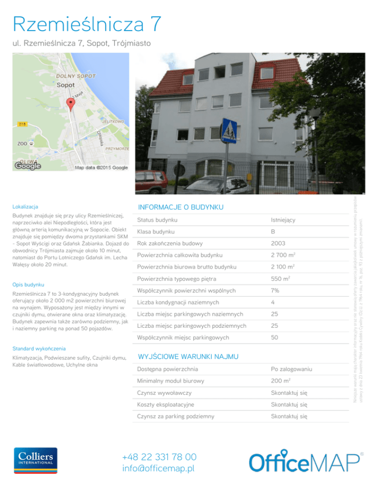 Rzemieślnicza 7 Lokalizacja INFORMACJE O BUDYNKU Budynek znajduje się przy ulicy Rzemieślniczej, naprzeciwko alei Niepodległości, która jest główną arterią komunikacyjną w Sopocie. Obiekt znajduje się pomiędzy dwoma przystankami SKM - Sopot Wyścigi oraz Gdańsk Żabianka. Dojazd do obwodnicy Trójmiasta zajmuje około 10 minut, natomiast do Portu Lotniczego Gdańsk im. Lecha Wałęsy około 20 minut. Status budynku Istniejący Klasa budynku B Rok zakończenia budowy 2003 Powierzchnia całkowita budynku 2 700 m2 Powierzchnia biurowa brutto budynku 2 100 m2 Powierzchnia typowego piętra 550 m2 Współczynnik powierzchni wspólnych 7% Liczba kondygnacji naziemnych 4 Liczba miejsc parkingowych naziemnych 25 Liczba miejsc parkingowych podziemnych 25 Współczynnik miejsc parkingowych 50 Opis budynku Rzemieślnicza 7 to 3-kondygnacyjny budynek oferujący około 2 000 m2 powierzchni biurowej na wynajem. Wyposażony jest między innymi w czujniki dymu, otwierane okna oraz klimatyzację. Budynek zapewnia także zarówno podziemny, jak i naziemny parking na ponad 50 pojazdów. Standard wykończenia Klimatyzacja, Podwieszane sufity, Czujniki dymu, Kable światłowodowe, Uchylne okna WYJŚCIOWE WARUNKI NAJMU Dostępna powierzchnia Po zalogowaniu Minimalny moduł biurowy 200 m2 Czynsz wywoławczy Skontaktuj się Koszty eksploatacyjne Skontaktuj się Czynsz za parking podziemny Skontaktuj się +48 22 331 78 00 [email protected] Niniejsze warunki mają charakter informacyjny oraz nie stanowią oferty zawarcia jakiejkolwiek umowy w rozumieniu przepisów ustawy z dnia 23 kwietnia 1964 roku Kodeks Cywilny (Dz.U. z 1964 roku, nr 16, poz. 93 z późniejszymi zmianami). ul. Rzemieślnicza 7, Sopot, Trójmiasto