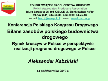 POLSKI ZWIĄZEK PRODUCENTÓW KRUSZYW Polish Aggregates Producers Association Biuro Zarządu: 25-501 KIELCE ul. Sienkiewicza 48/50 tel./fax (041) 344-66-88 kom 0603 84-75-48 e-mail: [email protected] www: www.kruszpol.pl Konferencja Polskiego Kongresu Drogowego Bilans zasobów polskiego budownictwa drogowego Rynek kruszyw w Polsce w perspektywie realizacji programu drogowego w Polsce Aleksander Kabziński 14 października 2010 r. Baza surowcowa do produkcji kruszyw • Dla kruszyw naturalnych: złoża surowców skalnych, - dla kruszyw naturalnych łamanych – złoża zwięzłych surowców skalnych, - dla kruszyw żwirowo – piaskowych – złoża luźnych surowców skalnych. • Dla kruszyw sztucznych: - składowiska odpadów z hut, elektrowni, kopalń węgla kamiennego, • Dla kruszyw z recyklingu: całe budownictwo. Proponowany przyszły podział kruszyw w Unii Europejskiej: • kruszywa naturalne: dla których bazę stanowią złoża zwięzłych surowców skalnych, • kruszywa wtórne: dla których bazę stanowią wszystkie inne zgromadzone przez człowieka i znajdujące użyteczne zastosowanie składowiska odpadów. - - Duży nacisk na wykorzystanie kruszyw wtórnych i oszczędność naturalnych dla przyszłych pokoleń. Stan zagospodarowania zasobów złóż kamieni łamanych i bocznych w Polsce w roku 2008 [mln ton] Stan zagospodarowania złóż piasków i żwirów Eksploatowane Udział (%) Liczba złóż Zasoby Udział w Zasoby Udziałw geologiczne zasobach przemysłowe zasobach bilansowe geologicznych (mln t) przemysłowych (mln t) bilansowych (%) (%) 233 35,3 3939,1 42,8 2541,9 88,0 Eksploatowane okresowo 45 6,8 390,9 4,2 310,2 10,7 Rozpoznane szczegółowo 179 27,1 2379,0 25,9 33,6 1,2 45 6,8 1884,9 20,0 - - 155 23,5 649,0 7,1 1,3 0,0 3 0,5 - - - - 660 100,0 9203,0 100,0 2887,0 100,0 Rozpoznane wstępnie Zaniechane Skreślone z bilansu zasobów w roku sprawozd. Razem Zagospodarowanie i wykorzystanie kopalin do produkcji kruszyw naturalnych łamanych stan na 2008 zasoby zagospodarowane - 47 % złóż, zasoby geologiczne zagospodarowane - 47 % zasobów krajowych zasoby przemysłowe - 99 % zasobów krajowych zaniechane - 24 % złóż, zasoby geologiczne zaniechane - 7 % zasobów krajowych wydobycie ponad - 50 mln ton. • Największe zasoby kopalin do produkcji kruszyw naturalnych łamanych występują w rejonie dolnośląskim, • przy aktualnym poziomie wydobycia, zasoby przemysłowe kopalin do produkcji kruszyw naturalnych łamanych wystarczą na ok.. 50 lat, • w najbliższych 5 latach zakończona zostanie eksploatacja ponad 20 złóż (w tym bazaltów i dolomitów) Możliwość zagospodarowania nowych złóż jest drastycznie ograniczana. Stan zagospodarowania zasobów złóż piasków i żwirów w Polsce w roku 2008 [mln ton] Stan zagospodarowania złóż piasków i żwirów Eksploatowane Liczba złóż Udział (%) Zasoby Udział w Zasoby Udziałw geologiczne zasobach przemysłowe zasobach bilansowe geologicznych (mln t) przemysłowych (mln t) bilansowych (%) (%) 1758 26,5 3354,8 21,4 1839,2 80,2 Eksploatowane okresowo 718 10,8 576,9 3,7 283,9 12,4 Rozpoznane szczegółowo 2249 33,9 3800,4 24,3 159,8 7,0 338 5,1 6767,1 43,2 9,7 0,4 1446 21,8 1149,5 7,3 1,3 0,1 116 1,8 0,0 0,0 0,0 0,0 6625 100,0 15648,7 100,0 2294,0 100,0 Rozpoznane wstępnie Zaniechane Skreślone z bilansu zasobów w roku sprawozd. Razem Zagospodarowanie i wykorzystanie kopalin do produkcji kruszyw naturalnych żwirowych i piaskowych stan na rok 2008. - zagospodarowane geodezyjno zagospodarowanych przemysłowe zagospodarowane zaniechane zaniechane bilansowe wydobycie - 37 % złóż, - 25 % zasobów krajowych - 93 % zasobów krajowych - 24 % złóż - 7 % zasobów krajowych ponad - 150 mln ton • największe zasoby do produkcji kruszyw naturalnych żwirowych i piaskowych występują w województwach dolnośląskim, opolskim, małopolskim i województwach Polski północnej. • Przy aktualnym poziomie wydobycia zasobów przemysłowych do produkcji kruszyw piaskowych i żwirowych wystarczy na 10 lat. Pilna potrzeba udokumentowania i zagospodarowania nowych zasobów. • Pogarszająca się jakość złóż, coraz wyższy punkt piaskowy, powodujący poważny problem zbywalności piasku kwalifikowanego (jedynie 20 -40%). Kopaliny do produkcji kruszyw naturalnych łamanych w roku 2009 Polska - województwo dolnośląskie - województwo świętokrzyskie - powiat kielecki - 66,2 mln ton - 100 % 28,1 mln ton - 42,4 % 20,3 mln ton - 30,7 % 12,5 mln ton - 18,9 % Całkowite wydobycie kopalin w Polsce - 414 mln ton - 100 % - województwo świętokrzyskie - 25 mln ton - 6,0 % - powiat kielecki - 15 mln ton - 3,6 % Powiat kielecki - ton kruszyw/mieszkańca - ton kruszyw/ 1 km2 - 55,44 ton/ha - 5,5 kg/m2 12461 000 : 199181 = 62,6 12461 000 : 2247,45 = 5544,50 „Wydajność powiatu kieleckiego z ha” ~= 55,4 ton/rok Wydobycie kopalin do produkcji kruszyw naturalnych łamanych i żwirowych według miejsc produkcji [mln ton] Kruszywa naturalne łamane Kruszywa naturalne żwirowe Razem Kruszywa naturalne Województwo 2007 % 2008 % 2009 % 2007 % 2008 % 2009 % Dolnośląskie Świętokrzyski e Małopolskie Mazowieckie Zachodnio – pomorskie 22,5 38,9 26,2 42,1 28,1 42,4 13,0 9,3 14,1 9,8 14,4 10,2 17,3 29,9 20,4 32,8 20,3 30,7 1,6 1,1 2,0 1,4 2,3 1,6 8,0 13,8 8,2 13,2 6,9 10,4 10,8 7,7 11,8 8,2 12,0 - - - - - - 17,8 12,9 18,1 12,6 - - - - - - 12,1 8,7 15,0 Śląskie Podlaskie Pomorskie Wielkopolskie Warmińsko – mazurskie 4,0 6,9 4,4 7,0 6,3 9,5 6,0 4,3 - - - - - - 13,0 - - - - - - - - - - - - - - - Łódzkie Opolskie Podkarpackie Kujawsko – Pomorsk 0,7 1,2 0,6 2,7 4,7 1,5 Lubuskie Lubelskie Razem % 2008 % 2009 % 35,5 18,0 40,3 19,7 42,3 20,4 18,9 9,6 22,4 4,3 22,6 10,9 8,5 18,8 9,5 20,0 9,6 21,9 10,6 14,3 10,1 17,8 9,0 18,1 8,7 14,3 6,9 10,4 12,6 8,9 12,1 6,1 15,0 4,6 12,6 6,1 8,0 5,5 6,8 4,8 10,0 5,1 12,4 5,9 13,1 6,3 9,3 11,5 8,0 9,0 6,4 13,0 6,6 11,5 5,5 9,0 4,3 10,6 7,6 11,1 7,7 12,1 8,6 10,6 5,4 11,1 5,3 12,1 5,8