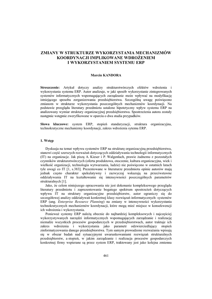 ZMIANY W STRUKTURZE WYKORZYSTANIA MECHANIZMÓW KOORDYNACJI IMPLIKOWANE WDROŻENIEM I WYKORZYSTANIEM SYSTEMU ERP Marcin KANDORA Streszczenie: Artykuł dotyczy analizy strukturotwórczych efektów wdrożenia i wykorzystania systemu ERP. Autor analizuje, w jaki sposób wykorzystanie zintegrowanych systemów informatycznych wspomagających zarządzanie może wpływać na modyfikację istniejącego sposobu zorganizowania przedsiębiorstwa. Szczególną uwagę poświęcono zmianom w strukturze wykorzystania poszczególnych mechanizmów koordynacji. Na podstawie przeglądu literatury przedmiotu ustalono hipotetyczny wpływ systemu ERP na analizowany wymiar struktury organizacyjnej przedsiębiorstwa. Spostrzeżenia autora zostały następnie wstępnie zweryfikowane w oparciu o dwa studia przypadków. Słowa kluczowe: system ERP, stopień standaryzacji, struktura technokratyczne mechanizmy koordynacji, zakres wdrożenia sytemu ERP. organizacyjna, 1. Wstęp Dyskusja na temat wpływu systemów ERP na strukturę organizacyjną przedsiębiorstwa, stanowi część szerszych rozważań dotyczących oddziaływania technologii informatycznych (IT) na organizacje. Jak piszą A. Kieser i P. Walgenlach, prawie żadnemu z pozostałych czynników strukturotwórczych (oferta produktowa, otoczenie, kultura organizacyjna, wiek i wielkość organizacji, technologia wytwarzania, ludzie) nie poświęcono w ostatnich latach tyle uwagi co IT [1, s.383]. Prezentowane w literaturze przedmiotu opinie autorów mają jednak często charakter spekulatywny i zazwyczaj wskazują na przeciwstawne oddziaływania IT na kształtowanie się intensywności poszczególnych parametrów strukturalnych [1]. Jako, że celem niniejszego opracowania nie jest dokonanie kompleksowego przeglądu literatury przedmiotu i zaprezentowanie bogatego spektrum spostrzeżeń dotyczących wpływu IT na struktury organizacyjne przedsiębiorstw, autor ograniczy się do szczegółowej analizy oddziaływań konkretnej klasy rozwiązań informatycznych: systemów ERP (ang. Enterprise Resource Planning) na zmiany w intensywności wykorzystania technokratycznych mechanizmów koordynacji, które mogą mieć miejsce w konsekwencji ich wdrożenia i wykorzystania. Ponieważ systemy ERP należą obecnie do najbardziej kompleksowych i najczęściej wykorzystywanych narzędzi informatycznych wspomagających zarządzanie i realizację niemalże wszystkich procesów gospodarczych w przedsiębiorstwach, autor traktuje ich zakres wdrożenia i wykorzystania jako parametr odzwierciedlający stopień zinformatyzowania danego przedsiębiorstwa. Tym samym prowadzone rozważania wpisują się w obszar badań nad sytuacyjnymi uwarunkowaniami rozwiązań strukturalnych przedsiębiorstw, a stopień, w jakim zarządzanie i realizacja procesów gospodarczych konkretnej firmy wspierane są przez system ERP, traktowany jest jako kolejna zmienna 461 kontekstowa. 2. Systemy ERP a wykorzystanie technokratycznych mechanizmów koordynacji W literaturze przedmiotu powszechnie przyjmuje się, że wdrożenie i wykorzystanie systemów ERP wywołuje wiele zmian organizacyjnych, które najczęściej dotyczą reorganizacji procesów gospodarczych i modyfikacji istniejących rozwiązań strukturalnych, a także zmian sprawności przedsiębiorstwa, (które w większości przypadków związane są z jej poprawą). Wydaje się ponadto, iż w wyniku implementacji systemu ERP modyfikacji ulega również istniejąca struktura wykorzystania poszczególnych mechanizmów koordynowania działań uczestników organizacji. Zdaniem autora, przejawia się to w zwiększeniu intensywności wykorzystania technokratycznych mechanizmów koordynacji. Zaangażowanie czynnika ludzkiego w procesach uzgadniania i harmonizowania działań pracowników traci na znaczeniu. Wzajemne uzgodnienia czy nadzór kierowniczy zastępowane są przez planowanie lub standaryzację przebiegu procesu. Klasyfikację mechanizmów koordynacji ze względu znaczenie czynnika ludzkiego w uzgadnianiu działań uczestników organizacji przedstawia rysunek 1. Niewielkie znaczenie czynnika - standaryzacja przebiegu procesu - planowanie Średnie znaczenie czynnika ludzkiego - standaryzacja wyników - rynek wewnętrzny Duże znaczenie czynnika ludzkiego - nadzór kierowniczy - wzajemne uzgodnienia - standaryzacja kwalifikacji Rys. 1. Podział mechanizmów koordynacji ze względu na znaczenie czynnika ludzkiego w uzgadnianiu działań uczestników organizacji Źródło: Opracowanie własne na podstawie [1, 2] Podejmując decyzję o wdrożeniu i wykorzystaniu systemu ERP, naczelne kierownictwo dąży najczęściej do poprawy sprawności organizacji. Akceptując natomiast zwiększenie intensywności wykorzystania technokratycznych mechanizmów harmonizowania działań podwładnych, jako konsekwencję implementacji systemu ERP, menedżerowie najwyższego szczebla zakładają, jak się wydaje, iż dzięki większemu stopniowi zdyscyplinowania i wewnętrznej integracji zarządzane przez nich przedsiębiorstwo będzie lepiej zaspokajać potrzeby otoczenia (tj. w sposób bardziej spójny z celami organizacji i przy relatywnie niższych kosztach). Zbyt duża dowolność w sposobach realizacji poszczególnych zadań wraz z brakiem rzetelności może być bowiem przyczyną marnotrawstwa w organizacji, które często ukrywa się pod postacią nadmiernych stanów magazynowych, wydłużonych cykli produkcyjnych czy niskiego poziomu obsługi klienta (nadmierny czas obsługi, problemy z terminowością i gotowością dostaw, nadmierna ilość pomyłek). Zdyscyplinowanie organizacji (jako konsekwencja implementacji systemu ERP) następuje, dlatego że realizacja procesów gospodarczych przy wykorzystaniu oprogramowania klasy ERP narzuca pewien rytm oraz schemat wykonania zadań [3 cyt. za 4]. Istotnym wydaje się jednak być, aby schemat ten, ukierunkowywał sposób 462 wykonania poszczególnych zadań na cele organizacji. Taki schemat powstaje z chwilą realiza
