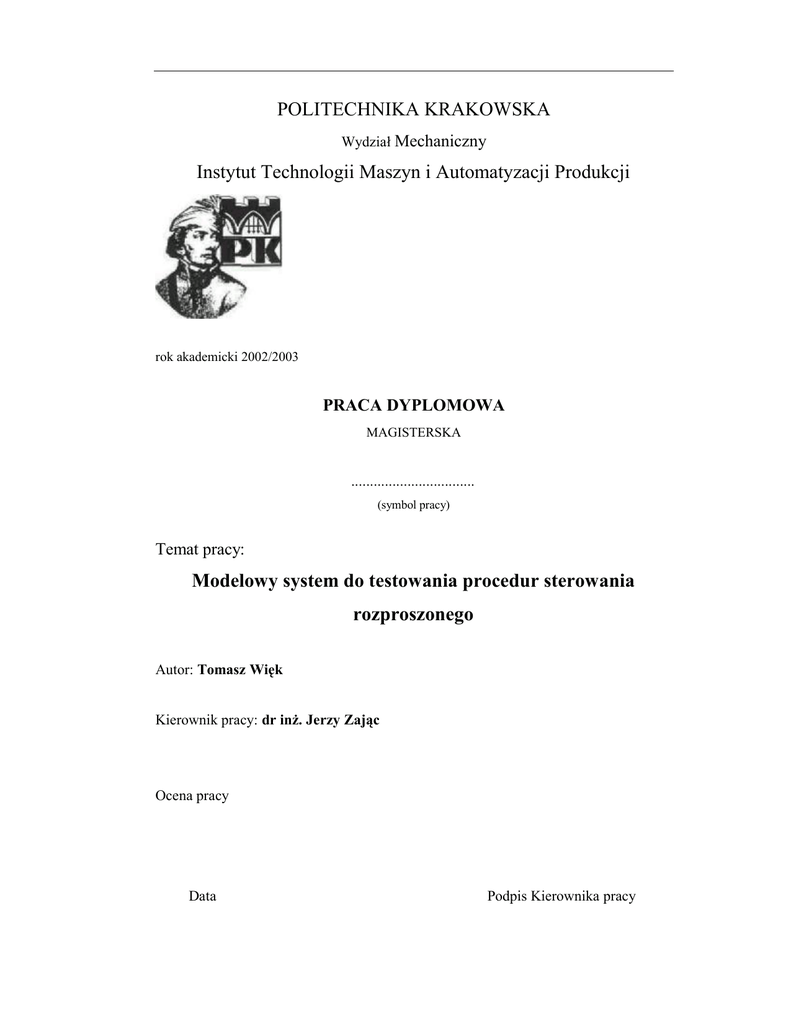 POLITECHNIKA KRAKOWSKA Wydział Mechaniczny Instytut Technologii Maszyn i Automatyzacji Produkcji rok akademicki 2002/2003 PRACA DYPLOMOWA MAGISTERSKA ................................. (symbol pracy) Temat pracy: Modelowy system do testowania procedur sterowania rozproszonego Autor: Tomasz Więk Kierownik pracy: dr inż. Jerzy Zając Ocena pracy Data Podpis Kierownika pracy -2- Symbol pracy: POLITECHNIKA KRAKOWSKA Wydział Mechaniczny Instytut Technologii Maszyn i Automatyzacji Produkcji Autor: Tomasz Więk Katedra Systemów Wytwarzania Kierownik pracy: dr inż. Jerzy Zając Data wydania tematu: 12.11.2002 Rok akademicki 2002/2003 sem. 10 Data przyjęcia pracy: Temat: Modelowy system do testowania procedur sterowania rozproszonego Kierownik pracy: dr inż. Jerzy Zając Dyrektor Instytutu: prof. dr hab. in ż. Jerzy Cyklis Wytyczne dla wykonania pracy: 1. Opracowanie koncepcji budowy minirobota mobilnego sterowanego komputerowo. 2. Opracowanie projektu minirobota. 3. Wykonanie i testowanie czterech minirobotów oraz oprogramowania sterującego. ....................................... Podpis Kierownika pracy -3- Lp. Treść konsultacji Data 1 Wydanie tematu pracy. 2 Dyskusja możliwych koncepcji wykonania minirobotów. 22.11.2002 3 Przyjęcie schematu kinematycznego 08.01.2003 4 Omówienie koncepcji komunikacji radiowej. 24.01.2003 5 Prezentacja pierwszego prototypu. Weryfikacja ze względu na małą prędkość i duże rozmiary. 12.11.2002 20.02.2003 6 Prezentacja nowego systemu napędowego. 11.03.2003 7 Omówienie systemy zasilającego. 27.03.2003 8 Dyskusja nad systemem wykrywania przeszkód. 09.04.2003 9 Prezentacja drugiego prototypu. Weryfikacja przedstawionego systemu sensorycznego. 06.05.2003 10 Dyskusja nad czujnikami zderzakowymi. 21.05.2003 11 Prezentacja trzeciego prototypu. 04.06.2003 12 Omówienie i przyjęcie poleceń minirobotów. 10.06.2003 13 Prezentacja i zatwierdzenie ostatecznej wersji urządzenia. Podpis 16.06.2003 14 Konsultacja treści pracy 06.08.2003 15 Poprawa treści pracy 29.08.2003 16 Końcowa weryfikacja treści pracy 04.09.2003 17 Oddanie pracy Opinia o pracy i ocena: Kierownik pracy: Dyrektor instytutu: -4- -5- Składam serdeczne podziękowania Promotorowi dr inż. Jerzemu Zającowi, którego cenne uwagi inspirowały mnie podczas realizacji tej pracy, a życzliwa pomoc przyczyniła się do ostatecznego jej kształtu. Pragnę również gorąco podziękować Dyrektorowi Instytutu Technologii Maszyn i Automatyzacji Produkcji Prof. dr hab. inż. Jerzemu Cyklisowi za finansowe wsparcie, bez którego nie byłoby możliwe wykonanie pracy. -6- Spis treści 1. WSTĘP. ...............................................................................................................7 2. CEL I ZAKRES PRACY. ...................................................................................9 3. MINIROBOTY..................................................................................................10 4. OPIS PRZYJĘTEGO ROZWIĄZANIA. .........................................................16 5. 4.1. OKREŚLENIE MODELU KINEMATYCZNEGO......................................................16 4.2. KONSTRUKCJA MECHANICZNA. .....................................................................19 4.3. UKŁAD NAPĘDOWY.......................................................................................23 4.4. SYSTEM STEROWANIA...................................................................................30 4.5. SYSTEM KOMUNIKACJI RADIOWEJ. ................................................................35 4.6. SYSTEM SENSORYCZNY.................................................................................39 4.7. SYSTEM ZASILANIA.......................................................................................47 OPROGRAMOWANIE STERUJĄCE. ...........................................................52 5.1. POLECENIA MINIROBOTA ...............................................................................52 5.2. OPROGRAMOWANIE WEWNĘTRZNE................................................................57 5.3. OPROGRAMOWANIE ZEWNĘTRZNE.................................................................64 6. MINIROBOT JAKO ELEMENT SYSTEMU ROZPROSZONEGO.............67 7. KOŃCOWE UWAGI I SPOSTRZEŻENIA. ...................................................71 8. DODATEK A – PARAMETRY MINIROBOTA.............................................76 9. DODATEK B – ELEMENTY SKŁADOWE PRACY. ....................................77 -7- 1. Wstęp. „Obserwując trendy rozwojowe współczesnych urządzeń wytwórczych można zauważyć, że dążenie do zwiększania ich funkcjonalności odbywa się zarówno poprzez stosowanie nowych rozwiązań konstrukcyjnych i technologicznych, jak i implementowanie coraz bardziej uniwersalnych otwartych układów sterowania, opartych na rozwiązaniach znanych z komputerów osobistych. Można więc sobie wyobrazić zbiór inteligentnych urządzeń wytwórczych, takich jak: obrabiarki, roboty, wózki czy magazyny, wyposażonych w uniwersalne, konfigurowalne systemy sterowania, które – wykorzystując wspólną magistralę komunikacyjną – tworzą system wytwarzania o charakterze samoorganizującym według technologii włącz i działaj (ang. plug and play). Tego typu rozwiązania wykorzystywane są z powodzeniem od kilku lat w procesie konfigurowania komputerów osobistych. Ważnym elementem systemów wytwarzania nowej generacji są ich rozproszone systemy sterowania. W systemach sterowania o strukturze rozproszonej opracować należy jedynie podstawowe (bazowe) reguły działania (indywidualnego i grupowego) elementarnych modułów tworzących skład systemu, a system sterowania – dzięki samoorganizacji – zapewni dostosowanie się do zaistniałej sytuacji. Podstawową zaletą podejścia zdecentralizowanego jest fakt, że skład systemu tworzą autonomiczne elementy, wyposażone w własne sterowniki i mogące wykonywać określony zbiór dzia