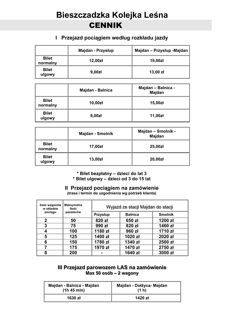 Bieszczadzka Kolejka Leśna CENNIK I Przejazd pociągiem według rozkładu jazdy Majdan - Przysłup Majdan – Przysłup -Majdan Bilet normalny 12,00zł 19,00zł Bilet ulgowy 9,00zł 13,00 zł Majdan - Balnica Majdan – Balnica Majdan Bilet normalny 10,00zł 15,00zł Bilet ulgowy 8,00zł 11,00zł Majdan - Smolnik Majdan – Smolnik Majdan Bilet normalny 17,00zł 25,00zł Bilet ulgowy 13,00zł 20,00zł * Bilet bezpłatny – dzieci do lat 3 * Bilet ulgowy – dzieci od 3 do 15 lat II Przejazd pociągiem na zamówienie (trasa i termin do uzgodnienia wg potrzeb klienta) Ilość wagonów w składzie pociągu 2 3 4 5 6 7 8 Maksymalna Ilość pasażerów 50 75 100 125 150 175 200 W Wyyjjaazzdd zzee ssttaaccjjii M Maajjddaann ddoo ssttaaccjjii Przysłup Balnica Smolnik 820 zł 990 zł 1180 zł 1400 zł 1780 zł 1970 zł - 650 zł 820 zł 960 zł 1020 zł 1340 zł 1470 zł 1640 zł 1200 zł 1460 zł 1710 zł 2020 zł 2500 zł 2750 zł 3000 zł IIIIII P wiieenniiee Prrzzeejjaazzdd ppaarroow woozzeem m LLA AS S nnaa zzaam móów M Maaxx 5500 oossóóbb –– 22 w waaggoonnyy Majdan - Balnica - Majdan (1h 45 min) Majdan - Dołżyca- Majdan (1 h) 1630 zł 1420 zł Bieszczadzka Kolejka Leśna CENNIK I Przejazd pociągiem według rozkładu jazdy Majdan - Przysłup Majdan – Przysłup -Majdan Bilet normalny 12,00zł 19,00zł Bilet ulgowy 9,00zł 13,00 zł Majdan - Balnica Majdan – Balnica Majdan Bilet normalny 10,00zł 15,00zł Bilet ulgowy 8,00zł 11,00zł Majdan - Smolnik Majdan – Smolnik Majdan Bilet normalny 17,00zł 25,00zł Bilet ulgowy 13,00zł 20,00zł * Bilet bezpłatny – dzieci do lat 3 * Bilet ulgowy – dzieci od 3 do 15 lat II Przejazd pociągiem na zamówienie (trasa i termin do uzgodnienia wg potrzeb klienta) Ilość wagonów w składzie pociągu 2 3 4 5 6 7 8 Maksymalna Ilość pasażerów 50 75 100 125 150 175 200 W Wyyjjaazzdd zzee ssttaaccjjii M Maajjddaann ddoo ssttaaccjjii Przysłup Balnica Smolnik 820 zł 990 zł 1180 zł 1400 zł 1780 zł 1970 zł - 650 zł 820 zł 960 zł 1020 zł 1340 zł 1470 zł 1640 zł 1200 zł 1460 zł 1710 zł 2020 zł 2500 zł 2750 zł 3000 zł IIIIII P wiieenniiee Prrzzeejjaazzdd ppaarroow woozzeem m LLA AS S nnaa zzaam móów M Maaxx 5500 oossóóbb –– 22 w waaggoonnyy Majdan - Balnica - Majdan (1h 45 min) Majdan - Dołżyca- Majdan (1 h) 1630 zł 1420 zł Bieszczadzka Kolejka Leśna CENNIK I Przejazd pociągiem według rozkładu jazdy Majdan - Przysłup Majdan – Przysłup -Majdan Bilet normalny 12,00zł 19,00zł Bilet ulgowy 9,00zł 13,00 zł Majdan - Balnica Majdan – Balnica Majdan Bilet normalny 10,00zł 15,00zł Bilet ulgowy 8,00zł 11,00zł Majdan - Smolnik Majdan – Smolnik Majdan Bilet normalny 17,00zł 25,00zł Bilet ulgowy 13,00zł 20,00zł * Bilet bezpłatny – dzieci do lat 3 * Bilet ulgowy – dzieci od 3 do 15 lat II Przejazd pociągiem na zamówienie (trasa i termin do uzgodnienia wg potrzeb klienta) Ilość wagonów w składzie pociągu 2 3 4 5 6 7 8 Maksymalna Ilość pasażerów 50 75 100 125 150 175 200 W Wyyjjaazzdd zzee ssttaaccjjii M Maajjddaann ddoo ssttaaccjjii Przysłup Balnica Smolnik 820 zł 990 zł 1180 zł 1400 zł 1780 zł 1970 zł - 650 zł 820 zł 960 zł 1020 zł 1340 zł 1470 zł 1640 zł 1200 zł 1460 zł 1710 zł 2020 zł 2500 zł 2750 zł 3000 zł IIIIII P wiieenniiee Prrzzeejjaazzdd ppaarroow woozzeem m LLA AS S nnaa zzaam móów M Maaxx 5500 oossóóbb –– 22 w waaggoonnyy Majdan - Balnica - Majdan (1h 45 min) Majdan - Dołżyca- Majdan (1 h) 1630 zł 1420 zł Bieszczadzka Kolejka Leśna CENNIK I Przejazd pociągiem według rozkładu jazdy Majdan - Przysłup Majdan – Przysłup -Majdan Bilet normalny 12,00zł 19,00zł Bilet ulgowy 9,00zł 13,00 zł Majdan - Balnica Majdan – Balnica Majdan Bilet normalny 10,00zł 15,00zł Bilet ulgowy 8,00zł 11,00zł Majdan - Smolnik Majdan – Smolnik Majdan Bilet normalny 17,00zł 25,00zł Bilet ulgowy 13,00zł 20,00zł * Bilet bezpłatny – dzieci do lat 3 * Bilet ulgowy – dzieci od 3 do 15 lat II Przejazd pociągiem na zamówienie (trasa i termin do uzgodnienia wg potrzeb klienta) Ilość wagonów w składzie pociągu 2 3 4 5 6 7 8 Maksymalna Ilość pasażerów 50 75 100 125 150 175 200 W Wyyjjaazzdd zzee ssttaaccjjii M Maajjddaann ddoo ssttaaccjjii Przysłup Balnica Smolnik 820 zł 990 zł 1180 zł 1400 zł 1780 zł 1970 zł - 650 zł 820 zł 960 zł 1020 zł 1340 zł 1470 zł 1640 zł 1200 zł 1460 zł 1710 zł 2020 zł 2500 zł 2750 zł 3000 zł IIIIII P wiieenniiee Prrzzeejjaazzdd ppaarroow woozzeem m LLA AS S nnaa zzaam móów M Maaxx 5500 oossóóbb –– 22 w waaggoonnyy Majdan - Balnica - Majdan (1h 45 min) Majdan - Dołżyca- Majdan (1 h) 1630 zł 1420 zł