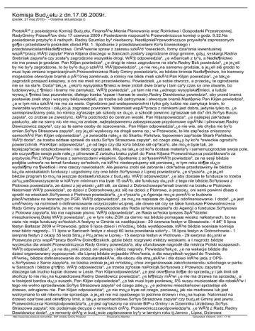 Komisja Bud¿etu z dn.17.06.2009r. (pi±tek, 21 maj 2010) - - Ostatnia aktualizacja () Protokó³ z posiedzenia Komisji Bud¿etu, Finansów,Mienia Planowania oraz Rolnictwa i Gospodarki Przestrzennej, RadyGminy Przewózw dniu 17 czerwca 2009 r.Posiedzenie rozpoczê³a Przewodnicz±ca komisji o godz. 9.32.Na posiedzenie przyby³o 4 radnych. Radny Szumiec by³ nieobecny. NastêpniePrzewodnicz±ca przywita³a zaproszonych go¶ci i przedstawi³a porz±dek obrad.Pkt. 1. Spotkanie z przedstawicielami Ko³a £owieckiego i przedstawicielamiNadle¶nictwa. Omówienie spraw z zakresu szkód ³owieckich, formy dzia³ania iewentualnej wspó³pracy.Wójt zapyta³ Pana Kiljana dlaczego w Sanicach zosta³y zagrodzone drogi gminne, gdy¿ s±skargi.Radna Srebniak zapyta³a czy zosta³y zagrodzone wszystkie drogi. Wójt odpowiedzia³, ¿e wSanicah z ty³u, a Nadle¶nictwo nie ma prawa je grodziæ. Pan Kiljan powiedzia³, ¿e drogi te nies± zagrodzone na sta³e.Radny B±k powiedzia³, ¿e je¿eli by nie by³y zagrodzone, to by by³o du¿o szkód. Wójtpowiedzia³, ¿e nie mo¿na samemu grodziæ, a je¿eli siê grodzi to musi byæ zmiana organizacjiruch.Przewodnicz±ca Rady Gminy powiedzia³a, ze bêdzie broniæ Nadle¶nictwo, bo kierowcy mog±sobie otworzyæ bramê a pó¼niej zamkn±æ, a rolnicy nie bêd± mieli szkód.Pan Kiljan powiedzia³, ¿e tak¿e zagrodzili przejazd kolejowy, a oni nie mieli nic przeciwkotemu. Powiedzieli, ¿e sobie otworz±, a przecie¿ te ogrodzenia nie s± na sta³e. Doda³ tak¿e, ¿eko³o wysypiska ¶mieci w lesie zrobili dwie bramy i tam ca³y czas s± one otwarte, bo ludziewywo¿± ¶mieci i bramy nie zamykaj±. Wójt powiedzia³, ¿e tam nie ma ¿adnego wysypiska¶mieci, a ludzie wywo¿± ¶mieci bez pozwolenia, dlatego trzeba ³apaæ i karaæ te osoby.Radny Dawidowicz powiedzia³, aby przed bram± postawiæ znak stop i wszyscy bêd±wiedzieli, ze trzeba siê zatrzymaæ i otworzyæ bramê.Nastêpnie Pan Kiljan powiedzia³, ¿e w tym roku szkód nie ma za wiele. Ogrodzone jest wielepowierzchni i tylko gdy ludzie nie zamykaj± bram, to zwierzêta wychodz± i ciê¿ko j± zagnaæz powrotem. Natomiast wspó³praca z rolnikami jest dobra, jedynie tylko to, ¿e samisprawdzamy pola, bo rolnicy zg³aszaj± jak szkody s± du¿e, a szkodê powinno zg³aszaæ siê do7 dni.So³tys Buczu zapyta³, co zrobiæ ze zwierzyn±, która podchodzi do centrum wioski. Pan Kiljanpowiedzia³, ¿e najlepiej zak³adaæ pastuchy, ale na sarny nic nie mo¿na zrobiæ, najlepiejsamemu zabezpieczaæ przydomowe ogródki i pilnowaæ.Radny Dawiczowicz zapyta³, czy s± te same osoby do szacowania.. Pan Kiljan odpowiedzia³,¿e nie wie, ale chyba nie by³o zmian.So³tys Straszowa zapyta³, czy je¿eli wyskoczy na drogê sarna np.; w Przewozie, to kto zap³aciza zniszczony samochód Pan Kiljan odpowiedzia³, ¿e zwierzêta nale¿± do Skarbu Pañstwa, topowinien zap³aciæ Skarb Pañstwa. Wójt doda³, ze trzeba oddaæ sprawê do s±du.So³tys Straszowa zapyta³, od czego zale¿y by ko³o ³owieckie ogrodzi³o powierzchniê. PanKiljan odpowiedzia³, ¿e od tego czy dla ko³a bêdzie siê op³aca³o, ale mo¿e byæ tak, ze lepiejzap³aciæ odszkodowanie i nie bêd± ogradzaæ. Mo¿na tak¿e od ko³a dostaæ materia³y i samemuogrodziæ swoje pole, ale oczywi¶cie swoje pole nale¿y pilnowaæ.Z zwi±zku braku pytañ do Pana Kiljana Przewodnicz±ca podziêkowa³a za przybycie.Pkt.2.Wspó³praca z samorz±dami wiejskimi. Spotkanie z so³tysamiWójt powiedzia³, ze na sesji bêdzie podjêta uchwa³a na temat funduszy so³eckich, na któr± niedecydujemy siê poniewa¿ w tym roku do¶æ du¿o wydali¶my na ¶wietlicê i inne rzeczy nawioskach. Ale jesieni± zrobi siê zebranie i dok³adnie przedstawimy ile bêdzie ka¿da wioskatakich funduszy i uzgodnimy czy one bêd±.So³tysowa z Lipnej powiedzia³a, ¿e s³ysza³a, ¿e je¿eli bêdzie program to mo¿na jeszcze dostaæfundusze z bud¿etu. Wójt odpowiedzia³, ¿e aby dostaæ te fundusze to trzeba za³o¿yæStowarzyszenie w którym minimum ma byæ 15 osób, ale funduszy du¿ych z tego nie bêdzie.So³tysowa z Piotrowa powiedzia³a, ze dzieci z jej wioski ¿alili siê, ze dzieci z Dobrochowapo³amali bramki na boisku w Piotrowie. Natomiast Wójt powiedzia³, ze dzieci z Dobrochowa¿al± siê na dzieci z Piotrowa, a przecie¿ oni sami powinni dbaæ o sprzêt na wioskach.So³tysowa z Piotrowa powiedzia³a, ¿e s³ysza³a ¿e Agencja mo¿e pomóc w budowie placówzabaw na terenach po PGR. Wójt odpowiedzia³, ze mo¿na napisaæ do Agencji odofinansowanie. I doda³, ¿e jest umówiony na rozmowê o dofinansowanie oczyszczalni wLipnej, ale dowie siê czy s± takie fundusze.Przewodnicz±ca Rady Gminy powiedzia³a, ze nic nie stoi na przeszkodzie aby Rada so³eckanapisa³a do Agencji o fundusze.So³tysowa z Potrowa zapyta³a, kto ma napisaæ pismo. Wójt odpowiedzia³, ze Rada so³ecka iprezes Spó³dzielni mieszkaniowej.Dalej Wójt powiedzia³, ¿e w tym roku ZGK za darmo raz bêdzie pomagaæ wiosk± nafestynach, bo na razie nie maja funduszy so³eckich.A festyny w Gminie s± nastêpuj±ce:- 20 czerwca festyn w Straszowie.- 4 – 5 lipca festyn Baltazar 2009 w Przewozie, gdzie 5 lipca dzieci i m³odzie¿ bêd± wystêpowaæ, które bêdzie oceniaæ komisja oraz bêd± nagrody.- 11 lipca w Sanicach festyn z okazji 60 lecia powstania szko³y.- 18 lipca festyn w Dobrochowie.- 1 sierpnia festyn z okazji 55 lecia Stra¿y Po¿arnej w Lipnej.- 15 sierpnia festyn w Piotrowie.- 29 sierpnia do¿ynki w Przewozie przy wspó³pracy Borów Dolno¶l±skich, gdzie bêd± rozgrywki miêdzy wioskami, a I nagrod± bêdzie wycieczka dla wioski.Przewodnicz±ca Rady Gminy powiedzia³a, aby ufundowaæ nagrodê dla mistrza Polski wzapasach. Wójt odpowiedzia³, ¿e na do¿ynki zrobi± oni pokazy i bêd± nagrody. Powiedzia³tak¿e, ¿e na wakacje bêdzie dla dzieci organizowany wypoczynek: dla Lipnej bêdzie wyjazddo Wroc³awia, a dla wszystkich wyjazd do Trzciela, równie¿ bêdzie dofinansowa