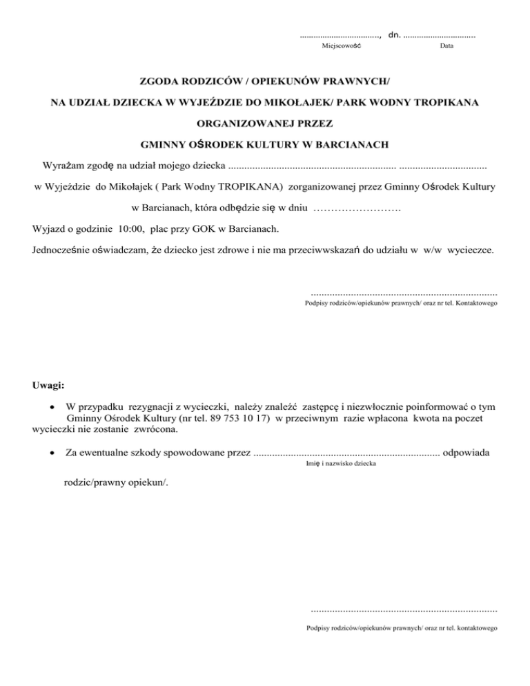 …………………………….., dn. ………………………….. Miejscowość Data ZGODA RODZICÓW / OPIEKUNÓW PRAWNYCH/ NA UDZIAŁ DZIECKA W WYJEŹDZIE DO MIKOŁAJEK/ PARK WODNY TROPIKANA ORGANIZOWANEJ PRZEZ GMINNY OŚRODEK KULTURY W BARCIANACH Wyrażam zgodę na udział mojego dziecka ............................................................... ................................. w Wyjeździe do Mikołajek ( Park Wodny TROPIKANA) zorganizowanej przez Gminny Ośrodek Kultury w Barcianach, która odbędzie się w dniu ……………………. Wyjazd o godzinie 10:00, plac przy GOK w Barcianach. Jednocześnie oświadczam, że dziecko jest zdrowe i nie ma przeciwwskazań do udziału w w/w wycieczce. ...................................................................... Podpisy rodziców/opiekunów prawnych/ oraz nr tel. Kontaktowego Uwagi: W przypadku rezygnacji z wycieczki, należy znaleźć zastępcę i niezwłocznie poinformować o tym Gminny Ośrodek Kultury (nr tel. 89 753 10 17) w przeciwnym razie wpłacona kwota na poczet wycieczki nie zostanie zwrócona. Za ewentualne szkody spowodowane przez ...................................................................... odpowiada Imię i nazwisko dziecka rodzic/prawny opiekun/. ...................................................................... Podpisy rodziców/opiekunów prawnych/ oraz nr tel. kontaktowego
