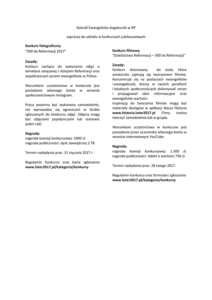 Kościół Ewangelicko-Augsburski w RP zaprasza do udziału w konkursach jubileuszowych Konkurs fotograficzny "500 lat Reformacji 2017" Zasady: Konkurs zachęca do wykonania zdjęć o tematyce związanej z dziejami Reformacji oraz współczesnym życiem ewangelików w Polsce. Warunkiem uczestnictwa w konkursie jest posiadanie własnego konta w serwisie społecznościowym Instagram. Praca powinna być wykonana samodzielnie, nie wprowadza się ograniczeń w liczbie zgłaszanych do konkursu zdjęć. Zdjęcia mogą być zdjęciami pojedynczymi lub stanowić jeden cykl. Nagrody: nagroda komisji konkursowej: 1000 zł nagroda publiczności: dysk zewnętrzny 2 TB Konkurs filmowy "Dziedzictwo Reformacji – 500 lat Reformacji” Zasady: Konkurs skierowany do osób, które amatorsko zajmują się tworzeniem filmów. Koncentruje się na postaciach ewangelików i ewangeliczek, którzy w swoich parafiach i lokalnych społecznościach dokonywali zmian i propagowali idee reformacyjne oraz ewangelickie wartości. Inspiracją do tworzenia filmów mogą być materiały dostępne w aplikacji Nasza Historia www.historia.luter2017.pl Filmy można tworzyć samodzielnie lub w grupie. Warunkiem uczestnictwa w konkursie jest posiadanie przez uczestnika własnego konta w serwisie internetowym YouTube. Termin nadsyłania prac: 31 stycznia 2017 r. Nagrody: nagroda komisji konkursowej: 1.500 zł. nagroda publiczności: tablet o wartości 750 zł. Regulamin konkursu oraz karta zgłoszenia www.luter2017.pl/kategoria/konkursy Termin nadsyłania prac: 28 lutego 2017. Regulamin konkursu oraz formularz zgłoszenia www.luter2017.pl/kategoria/konkursy