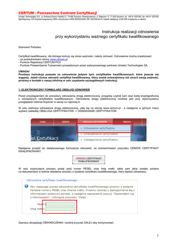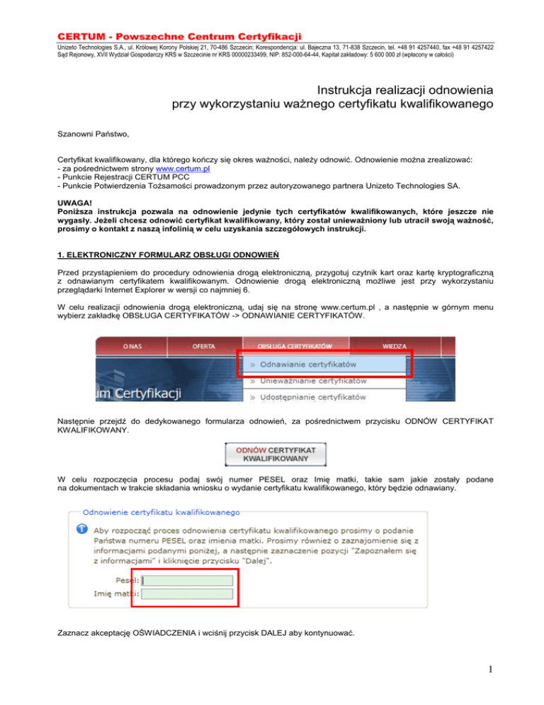 CERTUM - Powszechne Centrum Certyfikacji Unizeto Technologies S.A., ul. Królowej Korony Polskiej 21, 70-486 Szczecin; Korespondencja: ul. Bajeczna 13, 71-838 Szczecin, tel. +48 91 4257440, fax +48 91 4257422 Sąd Rejonowy, XVII Wydział Gospodarczy KRS w Szczecinie nr KRS 00000233499, NIP: 852-000-64-44, Kapitał zakładowy: 5 600 000 zł (wpłacony w całości) Instrukcja realizacji odnowienia przy wykorzystaniu waŜnego certyfikatu kwalifikowanego Szanowni Państwo, Certyfikat kwalifikowany, dla którego kończy się okres waŜności, naleŜy odnowić. Odnowienie moŜna zrealizować: - za pośrednictwem strony www.certum.pl - Punkcie Rejestracji CERTUM PCC - Punkcie Potwierdzenia ToŜsamości prowadzonym przez autoryzowanego partnera Unizeto Technologies SA. UWAGA! PoniŜsza instrukcja pozwala na odnowienie jedynie tych certyfikatów kwalifikowanych, które jeszcze nie wygasły. JeŜeli chcesz odnowić certyfikat kwalifikowany, który został uniewaŜniony lub utracił swoją waŜność, prosimy o kontakt z naszą infolinią w celu uzyskania szczegółowych instrukcji. 1. ELEKTRONICZNY FORMULARZ OBSŁUGI ODNOWIEŃ Przed przystąpieniem do procedury odnowienia drogą elektroniczną, przygotuj czytnik kart oraz kartę kryptograficzną z odnawianym certyfikatem kwalifikowanym. Odnowienie drogą elektroniczną moŜliwe jest przy wykorzystaniu przeglądarki Internet Explorer w wersji co najmniej 6. W celu realizacji odnowienia drogą elektroniczną, udaj się na stronę www.certum.pl , a następnie w górnym menu wybierz zakładkę OBSŁUGA CERTYFIKATÓW -> ODNAWIANIE CERTYFIKATÓW. Następnie przejdź do dedykowanego formularza odnowień, za pośrednictwem przycisku ODNÓW CERTYFIKAT KWALIFIKOWANY. W celu rozpoczęcia procesu podaj swój numer PESEL oraz Imię matki, takie sam jakie zostały podane na dokumentach w trakcie składania wniosku o wydanie certyfikatu kwalifikowanego, który będzie odnawiany. Zaznacz akceptację OŚWIADCZENIA i wciśnij przycisk DALEJ aby kontynuować. 1 CERTUM - Powszechne Centrum Certyfikacji Unizeto Technologies S.A., ul. Królowej Korony Polskiej 21, 70-486 Szczecin; Korespondencja: ul. Bajeczna 13, 71-838 Szczecin, tel. +48 91 4257440, fax +48 91 4257422 Sąd Rejonowy, XVII Wydział Gospodarczy KRS w Szczecinie nr KRS 00000233499, NIP: 852-000-64-44, Kapitał zakładowy: 5 600 000 zł (wpłacony w całości) W tym momencie rozpoczęty zostanie proces składania podpisu elektronicznego pod aneksem do umowy o świadczenie usług certyfikacyjnych. W pierwszej kolejności zapoznaj się z treścią aneksu. Następnie umieść w czytniku kartę kryptograficzną zawierającą dany certyfikat kwalifikowany i naciśnij przycisk PRZEJDŹ DO PODPISANIA ANEKSU. W kolejnym oknie zostanie ponownie zaprezentowany Aneks. W celu przejścia do jego podpisania naciśnij przycisk PODPISZ. 2 CERTUM - Powszechne Centrum Certyfikacji Unizeto Technologies S.A., ul. Królowej Korony Polskiej 21, 70-486 Szczecin; Korespondencja: ul. Bajeczna 13, 71-838 Szczecin, tel. +48 91 4257440, fax +48 91 4257422 Sąd Rejonowy, XVII Wydział Gospodarczy KRS w Szczecinie nr KRS 00000233499, NIP: 852-000-64-44, Kapitał zakładowy: 5 600 000 zł (wpłacony w całości) Z zaprezentowanej w kolejnym oknie listy wybierz certyfikat kwalifikowany, który zostanie wykorzystany do złoŜenia podpisu, po czym naleŜy wcisnąć przycisk WYBIERZ. NaleŜy wybrać ten sam certyfikat kwalifikowany, który jest odnawiany. W momencie pojawienia się okna PODPIS KWALIFIKOWANY, podaj KOD PIN odpowiedni dla danej karty kryptograficznej, a następnie naciśnij przycisk OK. Zostanie wyświetlony komunikat z informacją o złoŜeniu podpisu pod wcześniej zaprezentowanym aneksem do umowy. Wciśnięcie przycisku ZAMKNIJ zakończy proces składania podpisu Po powrocie na stronę z podpisanym juŜ Aneksem do umowy, naciśnij przycisk DALEJ. 3 CERTUM - Powszechne Centrum Certyfikacji Unizeto Technologies S.A., ul. Królowej Korony Polskiej 21, 70-486 Szczecin; Korespondencja: ul. Bajeczna 13, 71-838 Szczecin, tel. +48 91 4257440, fax +48 91 4257422 Sąd Rejonowy, XVII Wydział Gospodarczy KRS w Szczecinie nr KRS 00000233499, NIP: 852-000-64-44, Kapitał zakładowy: 5 600 000 zł (wpłacony w całości) W kolejnym kroku zweryfikuj dane korespondencyjne oraz popraw je jeŜeli uległy zmianie. JeŜeli posiadasz zestaw z serii Suscriptor Q 01 i chcesz zrezygnować z modułu uwierzytelniającego w postaci dodatkowego czytnika USB naleŜy zaznaczyć pole REZYGNUJĘ ZE SPRZĘTOWEGO MODUŁU UWIERZYTELNIAJĄCEGO. W celu zakończenia składania wniosku o odnowienie, wciśnij przycisk DALEJ. 2. ODESŁANIE ZAMÓWIENIA ORAZ LISTY IMIENNEJ Następnie na Twoją skrzynkę e-mail zostanie przesłana wiadomość z linkiem za pośrednictwem, którego moŜna pobrać podpisany elektronicznie aneks do umowy. Dodatkowo z http://www.certum.pl/certum/cert,certyfikaty_odnow_cert.xml naleŜy pobrać poniŜsze dokumenty: - lista imienna, - zamówienie. W celu kontynuowania procedury realizacji odnowienia, wszystkie wymienione powyŜej dokumenty naleŜy zweryfikować, wydrukować po jednym egzemplarzu, uzupełnić w wymaganych miejscach i podpisać. Dokumenty moŜna przekazać do CERTUM PCC: - w zeskanowanej formie pocztą elektroniczną: [email protected] - w formie papierowej, tradycyjną drogą pocztową na adres: CERTUM PCC ul. Bajeczna 13 71-838 SZCZECIN W ciągu 7 dni od daty otrzymania przez CERTUM PCC prawidłowo wypełnionych dokumentów, zostanie wysłana nowa karta kryptograficzna. Adres odbiorcy będzie taki sam jak adres do korespondencji wskazany w trakcie wypełnienia elektronicznego formularza obsługi odnowień (pkt. 1). Jednocześnie w ciągu 7 dni na podstawie podpisanego elektronicznie aneksu zostanie wydany certyfikat kwalifikowany. Powiadomienie o wydaniu certyfikatu kwalifikowanego zostanie przekazane na adres poczty elektronicznej podany w trakcie wypełniania elektronicznego formularza obsługi odnowień (pkt. 1). Po otrz