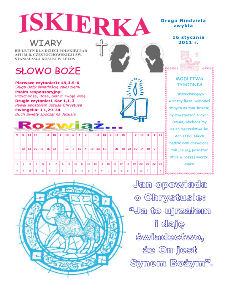 Druga Niedziela zwykła 16 stycznia 2011 r. WIARY BIULETYN DLA DZIECI POLSKIEJ PARAFII M.B. CZĘSTOCHOWSKIEJ I ŚW. STANISŁAWA KOSTKI W LEEDS SŁOWO BOŻE MODLITWA TYGODNIA Pierwsze czytanie:Iz 49,3.5-6 Sługa Boży światłością całej ziemi Psalm responsoryjny: Przychodzę, Boże, pełnić Twoją wolę. Drugie czytanie:1 Kor 1,1-3 Paweł apostołem Jezusa Chrystusa Ewangelia: J 1,29-34 Duch Święty spoczął na Jezusie Wszechmogący i wieczny Boże, wybrałeś słabych na tym świecie, by zawstydzać silnych. Dzisiaj obchodzimy dzień męczeństwa św. 9 5 14 18 3 10 1 10 6 4 2 3 18 7 11 15 2 14 8 1 11 Agnieszki. Niech będzie nam dozwolone, 12 13 10 17 16 22 12 1 16 4 19 23 11 21 20 22 10 14 10 9 tak jak jej, pozostać stale w naszej wierze. 1 2 3 4 5 6 7 8 9 10 11 12 13 14 15 16 17 18 19 20 21 22 23 r k B e O n ż ó “ a y g ł t , z d o c w ś i h Amen. Święta dziewica i męczenniczka (ok.290-304). Urodziła się około 290 roku w Rzymie w bardzo zamożnej rodzinie . Rodzice wychowali ją tak pobożnie, że w dziesiątym roku życia złożyła ślub czystości. Jej nadzwyczajna uroda zwracała na nią uwagę wielu synów najznakomitszych rodów rzymskich. Gdy ujrzał ją syn starosty Semproniusza, tak się mu spodobała, że chciał ją poślubić. Odprawiając starającego się o jej rękę, wyznała mu że jest chrześcijanką. Jako, że w prawie rzymskim nie można było skazać na śmierć dziewicy, starosta kazał ją wlec nagą do domu rozpusty. Dziewczyna modliła się tak gorąco, że w ciągu kilku chwil jej włosy tak urosły, że okryły ją niczym płaszcz. Wszyscy ci, którzy usiłowali pozbawić ją niewinności zostali oślepieni. Starosta kazał ją spalić na stosie, ale płomienie nie wyrządziły jej krzywdy. Rozgniewany nakazał ściąć jej głowę, dnia 21 stycznia 304 roku. Jej rodzice sami pogrzebali jej ciało, opłakując ją rzewnymi łzami. Wtedy ukazała im się św. Agnieszka w otoczeniu innych dziewic i pocieszyła ich. Na jej grobie modliła się córka jej mamki, św. Emerencjana, którą poganie ukamienowali za to, że nie chciała opuścić grobu i wyrzucała im zabicie swej mlecznej siostry. 21 STYCZNIA — ŚWIĘTA AGNIESZKA RZYMIANKA Paweł apostołem Jezusa Chrystusa 1. a. b. c. 2. a. b. c. 3. a. b. c. Kiedy św. Paweł Apostoł spotkał osobiście Jezusa? gdy Jezus wjeżdżał do Jerozolimy podczas procesu Jezusa nigdy osobiście nie spotkał Jezusa Kim był Paweł z Tarsu, zanim uwierzył w Jezusa i przyjął chrzest? faryzeuszem, prześladowcą chrześcijan członkiem sekty religijnej w Qumran na Pustyni Judzkiej Urzędnikiem rzymskim w Jerozolimie Św. Paweł Apostoł jest zwany Apostołem : Azji i Afryki Narodów Europy 4. a. b. c. Św. Paweł z Tarsu uważany jest za autora ich listów: trzynaście piętnaście siedemnaście 5. Podstawowym źródłem informacji o losach Pawła z Tarsu - oprócz jego Listów jest : Księga Przysłów Księga Apokalipsy Dzieje Apostolskie a. b. c. 6. W jaki sposób zmarł Św. Paweł: a. został ścięty b. został ukrzyżowany c. został ukamieniowany 1.c. 2.a. 3.b. 4.a. 5. c. 6. a