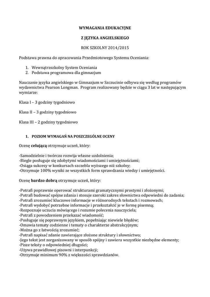 WYMAGANIA EDUKACYJNE Z JĘZYKA ANGIELSKIEGO ROK SZKOLNY 2014/2015 Podstawa prawna do opracowania Przedmiotowego Systemu Oceniania: 1. Wewnątrzszkolny System Oceniania 2. Podstawa programowa dla gimnazjum Nauczanie języka angielskiego w Gimnazjum w Szczucinie odbywa się według programów wydawnictwa Pearson Longman. Program realizowany będzie w ciągu 3 lat w następującym wymiarze: Klasa I – 3 godziny tygodniowo Klasa II – 3 godziny tygodniowo Klasa III – 2 godziny tygodniowo 1. POZIOM WYMAGAŃ NA POSZCZEGÓLNE OCENY Ocenę celującą otrzymuje uczeń, który: -Samodzielnie i twórczo rozwija własne uzdolnienia; -Biegle posługuje się zdobytymi wiadomościami i umiejętnościami; -Osiąga sukcesy w konkursach szczebla wyższego niż szkolny; -Otrzymuje 100% wyniki ze wszystkich form sprawdzania wiedzy i umiejętności. Ocenę bardzo dobrą otrzymuje uczeń, który: -Potrafi poprawnie operować strukturami gramatycznymi prostymi i złożonymi; -Potrafi budować spójne zdania i stosuje szeroki zakres słownictwa odpowiedni do zadania; -Potrafi zrozumieć kluczowe informacje w różnorodnych tekstach i rozmowach; -Potrafi wydobyć potrzebne informacje i przekształcić je w formę pisemną; -Rozpoznaje uczucia mówiącego i rozumie polecenia nauczyciela; -Potrafi z powodzeniem przekazać wiadomość; -Posługuje się poprawnym językiem, popełniając niewiele błędów; -Omawia tematy codzienne i tematy o charakterze abstrakcyjnym; -Można go z łatwością zrozumieć; -Potrafi napisać zdanie zawierające złożone struktury i słownictwo; -Jego tekst jest zorganizowany w sposób spójny i zawiera wszystkie niezbędne elementy; -Pisze teksty o odpowiedniej długości; -Używa prawidłowej pisowni i interpunkcji; -Otrzymuje minimum 90% z większości sprawdzianów. Ocenę dobrą otrzymuje uczeń, który: -Potrafi poprawnie operować większością struktur prostych i złożonych; -W większości wypadków buduje zdania spójne i używa szerokiego zakresu słownictwa odpowiedniego do zadania; -Potrafi zrozumieć większość kluczowych informacji w różnorodnych tekstach i rozmowach; -Wydobyć większość potrzebnych informacji i przekształcić je w formę pisemną; -Potrafi rozpoznać uczucia i reakcje mówiącego; -Potrafi rozróżnić dźwięki i zrozumieć polecenia nauczyciela; -Przeważnie potrafi z powodzeniem przekazać wiadomość; -Mówi spójnie z lekkim wahaniem; -Posługuje się w miarę poprawnym językiem, popełniając niekiedy zauważalne błędy, ale można go zazwyczaj zrozumieć bez trudności; -Potrafi omawiać tematy codzienne i niektóre abstrakcyjne; -Na ogół zabiera głos w dyskusji w naturalny sposób; -Pisze teksty na ogół dobrze zorganizowane i spójne, a w zadaniu pisemnym zawiera wszystkie istotne punkty, choć niektórym poświęca niewiele miejsca; -Pisze teksty nieco dłuższe lub krótsze od wymaganej długości oraz używa prawidłowej pisowni i interpunkcji. Ocenę dostateczną otrzymuje uczeń, który: -Potrafi operować niektórymi strukturami prostymi i złożonymi, budować niektóre zdania spójne; -Na ogół używa słownictwa odpowiedniego do zadania, ale tylko czasami o charakterze bardziej złożonym; -Potrafi czasem zrozumieć ogólny sens różnorodnych tekstów, rozmów i wydobywa część kluczowych informacji w tekstach i rozmowach; -Zazwyczaj rozpoznaje uczucia i reakcje mówiącego; -Potrafi rozróżnić większość dźwięków i zazwyczaj zrozumieć polecenia nauczyciela; -Czasem potrafi z powodzeniem przekazać wiadomość, mówi spójnie z wyraźnym wahaniem; -Posługuje się częściowo poprawnym językiem, ale popełnia sporo zauważalnych błędów; -Potrafi omawiać codzienne tematy, ale z abstrakcyjnymi ma wyraźne problemy; -Można go zazwyczaj zrozumieć; -Potrafi napisać zdanie zawierające proste struktury i słownictwo, w zadaniu pisemnym zawiera większość istotnych punktów, jednak tekst mógłby być bardziej spójny; -Używa czasem nieprawidłowej pisowni i interpunkcji; -Pisze teksty wyraźnie dłuższe lub krótsze od wymaganej długości. -Potrafi poprawnie operować niedużą ilością struktur prostych i złożonych, budować zdania, ale przeważnie niespójne; -dysponuje ograniczonym zakresem słownictwa odpowiedniego do zadania, czasami niepoprawnie używa codziennego słownictwa; -Potrafi od czasu do czasu zrozumieć ogólny sens różnorodnych tekstów i rozmów, wydobyć kilka kluczowych informacji w różnorodnych tekstach i rozmowach, zrozumieć niedużą część potrzebnych informacji i przekształcić je w formę pisemną; -Potrafi też czasami rozpoznać uczucia i reakcje mówiącego, rozróżnić niektóre dźwięki, a polecenia nauczyciela są dla niego zazwyczaj zrozumiałe chociaż może potrzebować pomocy lub podpowiedzi; -Czasami potrafi przekazać wiadomość, ale z wyraźnymi trudnościami; -Mówi czasem spójnie ale z częstym wahaniem; -Posługuje się czasami poprawnym językiem, ale popełnia wiele zauważalnych błędów; -Jego słownictwo jest bardzo ograniczone, potrafi omawiać codzienne tematy, ale rzadko podejmuje te o charakterze abstrakcyjnym, nieczęsto zabiera głos w rozmowie; -Można go zrozumieć, ale z pewną trudnością; -Próbuje pisać zdania zawierające proste struktury i słownictwo; -Jego tekst bywa spójny, ale brak mu organizacji; -W zadaniu pisemnym zawiera tylko niektóre istotne punkty; -Pisze teksty wyraźnie dłuższe lub krótsze od wymaganej długości, używa w większości nieprawidłowej pisowni i interpunkcji. Ocenę niedostateczną otrzymuje uczeń, który: -Nie potrafi operować nawet prostymi strukturami gramatycznymi; -Jego słownictwo jest rażąco ubogie, nie potrafi wykorzystać zdobytej wiedzy; -Nie potrafi zrozumieć ogólnego sensu różnorodnych tekstów i rozmów; -Polecenia nauczyciela są dla niego niezrozumiałe; -Nie może rozróżnić podstawowych dźwięków i uczuć mówiącego; -Rzadko potrafi przekazać wiadomoś
