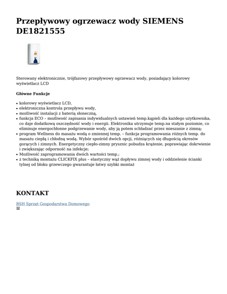 Przepływowy ogrzewacz wody SIEMENS DE1821555 Sterowany elektronicznie, trójfazowy przepływowy ogrzewacz wody, posiadający kolorowy wyświetlacz LCD Główne Funkcje ● ● ● ● ● ● ● kolorowy wyświetlacz LCD, elektroniczna kontrola przepływu wody, możliwość instalacji z baterią słoneczną, funkcja ECO – możliwość zapisania indywidualnych ustawień temp.kąpieli dla każdego użytkownika, co daje dodatkową oszczędność wody i energii. Elektronika utrzymuje temp.na stałym poziomie, co eliminuje energochłonne podgrzewanie wody, aby ją potem schładzać przez mieszanie z zimną; program Wellness do masażu wodą o zmiennej temp. – funkcja programowania różnych temp. do masażu ciepłą i chłodną wodą. Wybór spośród dwóch opcji, różniących się długością okresów gorących i zimnych. Energetyczny ciepło-zimny prysznic pobudza krążenie, poprawiając dokrwienie i zwiększając odporność na infekcje; Możliwość zaprogramowania dwóch wartości temp.; z techniką montażu CLICKFIX plus – elastyczny wąż dopływu zimnej wody i oddzielenie ścianki tylnej od bloku grzewczego gwarantuje łatwy szybki montaż KONTAKT BSH Sprzęt Gospodarstwa Domowego