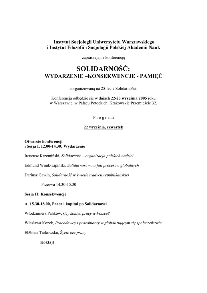 Instytut Socjologii Uniwersytetu Warszawskiego i Instytut Filozofii i Socjologii Polskiej Akademii Nauk zapraszają na konferencję SOLIDARNOŚĆ: WYDARZENIE –KONSEKWENCJE - PAMIĘĆ zorganizowaną na 25-lecie Solidarności. Konferencja odbędzie się w dniach 22-23 września 2005 roku w Warszawie, w Pałacu Potockich, Krakowskie Przemieście 32. Program 22 września, czwartek Otwarcie konferencji i Sesja I, 12.00-14.30: Wydarzenie Ireneusz Krzemiński, Solidarność – organizacja polskich nadziei Edmund Wnuk-Lipiński, Solidarność – na fali procesów globalnych Dariusz Gawin, Solidarność w świetle tradycji republikańskiej Przerwa 14.30-15.30 Sesja II: Konsekwencje A. 15.30-18.00, Praca i kapitał po Solidarności Włodzimierz Pańków, Czy koniec pracy w Polsce? Wiesława Kozek, Pracodawcy i pracobiorcy w globalizującym się społeczeństwie Elżbieta Tarkowska, Życie bez pracy Koktajl 23 września, piątek B. 10.00-12.30, Polityka i życie obywatelskie po Solidarności Tadeusz Szawiel, Solidarność jako wydarzenie i jako trwanie Mirosława Grabowska, „Jako błyskawica”. Problemy z polityczną instytucjonalizacją ruchu Solidarności Piotr Gliński, Samorządna Rzeczpospolita w III Rzeczypospolitej Przerwa 12.30-13.30 Sesja III: Pamięć A. 13.30-16. 00. W społeczeństwie Jadwiga Staniszkis, Moja pamięć Solidarności, czyli opowieść o odbudowie i ponownej utracie podmiotowości na tle dwóch koncepcji człowieka w kulturze europejskiej Elżbieta Hałas, Symboliczna konstrukcja Solidarności: konflikt interpretacji i polityka pamięci Zdzisław Krasnodębski, Solidarność w Europie 16.00- 16.30 Przerwa na kawę B. 16.30-19.00. W socjologii i myśli o społeczeństwie Antoni Sułek, Dlaczego socjologia nie przewidziała Solidarności i co z tego wynikło Joanna Kurczewska, Socjologia wobec i pod wpływem Solidarności Paweł Śpiewak, Solidarność, „wielki nieobecny” w myśli politycznej po roku 1889 19.00. Zamknięcie konferencji Serdecznie zapraszamy Prof. Antoni Sułek DYREKTOR IS UW Prof. Henryk Domański DYREKTOR IFiS PAN * Komitet programowy konferencji: Dariusz Gawin, Mirosława Grabowska, Andrzej Rychard, Antoni Sułek Dodatkowe informacje w sprawach organizacyjnych można uzyskać w sekretariacie Instytutu Socjologii UW: tel. (22) 827-85-99; e-mail:[email protected]