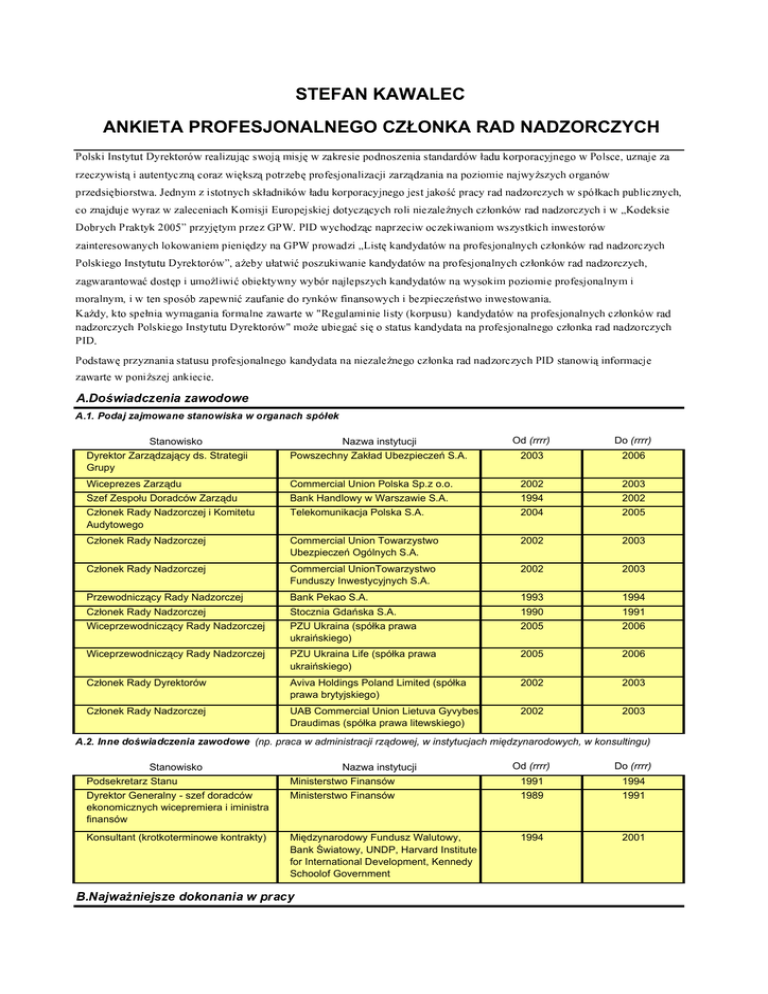 ANKIETA PROFESJONALNEGO CZŁONKA RAD NADZORCZYCH