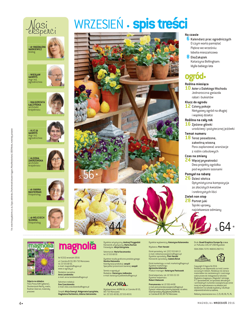 Nasi eksperci WRZESIEŃ . spis treści Na czasie 6 Kalendarz prac ogrodniczych O czym warto pamiętać Piękne we wrześniu: lobelia mieszańcowa 8 EkoZakątek Katarzyna Bellingham: Idylla babiego lata dr MAGDALENA NARKIEWICZ biolog ogród. WIESŁAW GAWRYŚ mgr inż. ogrodnictwa Roślina miesiąca 10 Aster z Dalekiego Wschodu Jednoroczna gwiazda rabat i bukietów Klucz do ogrodu 12 Cztery pokoje Nietypowy ogród na długiej i wąskiej działce MAŁGORZATA ŁĄCZYŃSKA architekt krajobrazu Roślina na cały rok Fot. www.thejoyofplants.co.uk, Edyta Jabłońska, Shutterstock/atsawin fugpan, MirasWonderland, 1000 Words, materiały prasowe 16 Zjeżone główki urodziwej i pożytecznej jeżówki ALICJA GAWRYŚ mgr inż. ogrodnictwa Temat numeru 18 Teraz posadzone, ALDONA ZAKRZEWSKA architekt krajobrazu zakwitną wiosną Pora zaplanować aranżacje z roślin cebulowych Czas na zmiany 24 Więcej prywatności Dwa projekty ogródka pod wysokimi sosnami s. 56. Pomysł na rabatę 26 Dzieci słońca Optymistyczna kompozycja ze złocistych kwiatów i srebrzystych liści Zieleń non stop Zi 28 Portret juki 2 Tajniki uprawy, najciekawsze odmiany dr HANNA MASTERNAK fitopatolog dr WOJCIECH SŁOMKA fitopatolog s. Nr 9 (53) wrzesień 2016 ul. Czerska 8/10, 00-732 Warszawa tel. 22 555 68 50, e-mail: [email protected] www.e-ogrody.pl Redaktor naczelna: Anna Landowska e-mail: [email protected] Zdjęcia na okładce: Flora Press/GWI (główne), Shutterstock/Neirfy, matin, Rudmer Zwerver, materiały prasowe 4 . 44. Dyrektor artystyczny: Andrzej Przygodzki Kierownik artystyczny: Marta Kochan Fotoedytor: Alicja Górzyńska Dyrektor wydawniczy: Katarzyna Kolanowska Sekretariat: Maria Kaczmarska tel. 22 555 68 50 Dział sprzedaży: tel. (22) 555 68 13 e-mail: [email protected] Dyrektor sprzedaży: Piotr Hendel Kierownik sprzedaży: Izabela Bziuk Dyrektor studia graficzno-produkcyjnego: Monika Makowska Koordynacja produkcji: zespół Specjaliści przestrzeni barwnej: zespół Serwis e-ogrody.pl Redaktor: Katarzyna Jodłowska e-mail: [email protected] Sekretarz redakcji: Ewa Czaczkowska e-mail: [email protected] Zespół: Alicja Gawryś, Małgorzata Łączyńska, Magdalena Narkiewicz, Aldona Zakrzewska s. Wydawnictwo: AGORA SA, ul. Czerska 8/10, 00-732 Warszawa tel. 22 555 40 00, 22 555 40 01 Wydawca: Piotr Hendel Dział marketingu: e-mail: [email protected] Dyrektor marketingu: Agnieszka Adamska Product manager: Katarzyna Pastuszek Dział kolportażu: tel. 22 555 53 33 Dyrektor kolportażu: Robert Małaszek Prenumerata: tel. 22 555 44 00 e-mail: [email protected] Pytania i reklamacje prosimy kierować na adres: Dział Sprzedaży Wysyłkowej AGORA SA, ul. Czerska 8/10, 00-732 Warszawa 64. Druk: Quad/Graphics Europe Sp. z o.o. ul. Pułtuska 120, 07-200 Wyszków ISSN 2084-7270 INDEKS 282715 Copyright © Agora SA 2016 Redakcja nie odpowiada za treść zamieszczanych reklam. Redakcja nie zwraca materiałów nie zamówionych i zastrzega sobie prawo do redagowania tekstów. Wydawca magazynu „Magnolia” ostrzega P.T. Sprzedawców, że sprzedaż aktualnych i archiwalnych numerów czasopisma po cenie innej niż wydrukowana na okładce jest działaniem na szkodę wydawcy i skutkuje odpowiedzialnością sądową. Reklamy nieoznaczone na s. 2, 23, 49, 59, 75, 76. . M A G N O L I A WRZESIEŃ 2016 Szkółkarze polecają 30 Hortensje na topie Sześć pięknych i odpornych hortensji bukietowych Rarytasy 32 Porcelanowe jagody Winnik zmienny – pnącze o urodziwych owocach Klinika roślin 34 Dlaczego gniją owoce – i jak temu zapobiec? Eksperci radzą 36 Zielone pogotowie Krajowe ryby w oczku wodnym Dzielimy i wysiewamy rudbekie Sadzimy krzewy zimozielone Nawierzchnie łatwe w utrzymaniu Żarnowce mogą przemarzać Gdy pleśń pokrywa ziemię Ogrody czytelników 40 Rabaty pełne owadów w kolorowym ogrodzie pani Weroniki Czech z Biecza Ze smakiem 42 Smak musztardy Mało znane, a smaczne warzywa liściowe 44 Gruszka z Japonii Nashi – tajniki uprawy i przepisy kulinarne balkon i taras. Inspiracje 56 U progu jesieni – kwiatowe kompozycje na balkon i taras Na medal 60 Sześć na jeden Nietypowy balkon urządzony przedmiotami z odzysku Rozrywka 50 Ogród jak marzenie Reality show „Dom Marzeń” – jak wygląda dzisiaj rezydencja powstająca na oczach widzów? 51 Krzyżówka ogrodnicza z nagrodami Wasze sukcesy 68 Pochwalcie się ogrodem, balkonem, rośliną! Wasz temat: Wyniosłe piękno lilii dom. Rarytas 64 Płonąca korona Glorioza – elegancki kwiat o niewielkich wymaganiach Co w trawie piszczy 70 Warto zobaczyć: Zrób to sam 66 Podarunki z kwiatów Piękne, choć nietrwałe 74 ciekawostki, kalendarium imprez Zielona poczta Męska robota 46 Na krawędzi Jak poskromić ekspansję trawy Serwis ogrodowy 52 Wybieramy kompostownik Przegląd modeli W stronę natury 54 Jak wygryźć gryzonie Zamiast zabijać, spróbujmy je wypłoszyć s. 52. s. 60. Het Loo – holenderski Wersal 71 Rynkowe nowości, s. 46. Słuchaj porad ekspertów „Magnolii” we wtorki 16 i 30 sierpnia o 7.40 w radiu Pogoda. " KUPON Z TYM KUPONEM OTRZYMASZ BILET WSTĘPU NA WYSTAWĘ W SOBOTĘ DNIA 3.09.2016 EXPO XXI WARSZAWA, UL. PRĄDZYŃSKIEGO 12/14 ZAPRASZAMY WSZYSTKICH MIŁOŚNIKÓW ROŚLIN I OGRODÓW W GODZ. 9.00-17.00