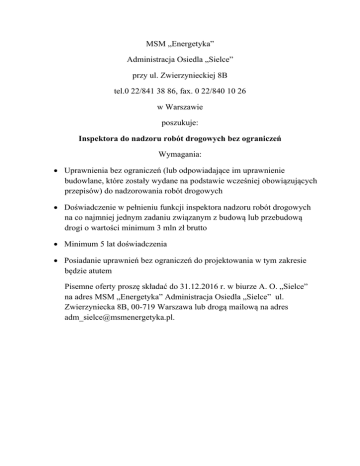 MSM „Energetyka” Administracja Osiedla „Sielce” przy ul. Zwierzynieckiej 8B tel.0 22/841 38 86, fax. 0 22/840 10 26 w Warszawie poszukuje: Inspektora do nadzoru robót drogowych bez ograniczeń Wymagania: Uprawnienia bez ograniczeń (lub odpowiadające im uprawnienie budowlane, które zostały wydane na podstawie wcześniej obowiązujących przepisów) do nadzorowania robót drogowych Doświadczenie w pełnieniu funkcji inspektora nadzoru robót drogowych na co najmniej jednym zadaniu związanym z budową lub przebudową drogi o wartości minimum 3 mln zł brutto Minimum 5 lat doświadczenia Posiadanie uprawnień bez ograniczeń do projektowania w tym zakresie będzie atutem Pisemne oferty proszę składać do 31.12.2016 r. w biurze A. O. „Sielce” na adres MSM „Energetyka” Administracja Osiedla „Sielce” ul. Zwierzyniecka 8B, 00-719 Warszawa lub drogą mailową na adres [email protected].