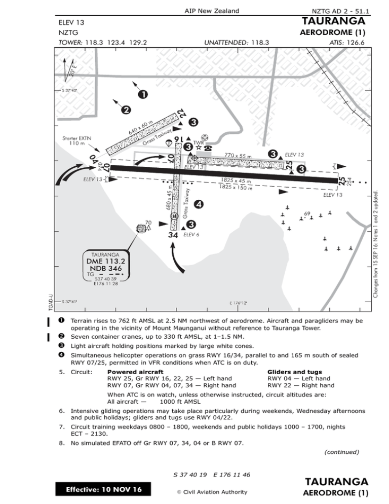 AIP New Zealand NZTG AD 2 - 51.1 TAURANGA ELEV 13 NZTG AERODROME (1) UNATTENDED: 118.3 ATIS: 126.6 Changes from 15 SEP 16: Notes 1 and 2 updated. TOWER: 118.3 123.4 129.2 Terrain rises to 762 ft AMSL at 2.5 NM northwest of aerodrome. Aircraft and paragliders may be operating in the vicinity of Mount Maunganui without reference to Tauranga Tower. 1.2.3.4. Seven container cranes, up to 330 ft AMSL, at 1–1.5 NM. Light aircraft holding positions marked by large white cones. Simultaneous helicopter operations on grass RWY 16/34, parallel to and 165 m south of sealed RWY 07/25, permitted in VFR conditions when ATC is on duty. 5. Circuit: Powered aircraft RWY 25, Gr RWY 16, 22, 25 — Left hand RWY 07, Gr RWY 04, 07, 34 — Right hand Gliders and tugs RWY 04 — Left hand RWY 22 — Right hand When ATC is on watch, unless otherwise instructed, circuit altitudes are: All aircraft — 1000 ft AMSL 6. Intensive gliding operations may take place particularly during weekends, Wednesday afternoons and public holidays; gliders and tugs use RWY 04/22. 7. Circuit training weekdays 0800 – 1800, weekends and public holidays 1000 – 1700, nights ECT – 2130. 8. No simulated EFATO off Gr RWY 07, 34, 04 or B RWY 07. (continued) S 37 40 19 Effective: 10 NOV 16 E 176 11 46 E Civil Aviation Authority TAURANGA AERODROME (1) NZTG AD 2 - 51.2 AIP New Zealand TAURANGA AERODROME (2) 9. Simultaneous parallel operations on paved and grass runways 07/25 permitted only for aircraft 2300 kg or less in VFR conditions and when ATC is on duty. D 10. CAUTION: Bird hazard. Feral pigeons, gulls, starlings, spur winged plovers and dotterels are common. Effective: 15 SEP 16 TAURANGA E Civil Aviation Authority AERODROME (2)