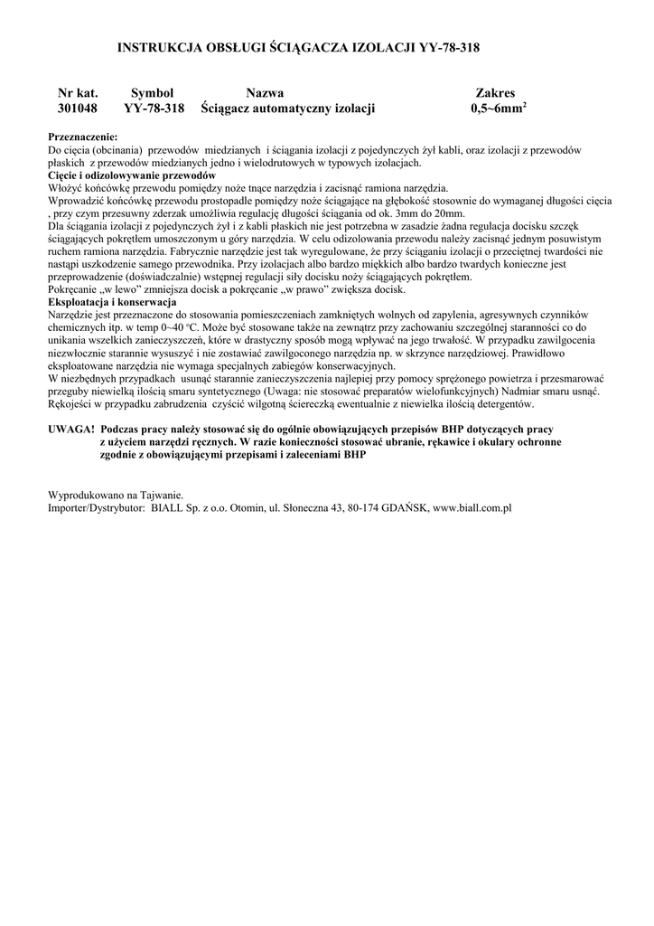 INSTRUKCJA OBSŁUGI ŚCIĄGACZA IZOLACJI YY-78-318 Nr kat. 301048 Symbol YY-78-318 Nazwa Ściągacz automatyczny izolacji Zakres 0,5~6mm2 Przeznaczenie: Do cięcia (obcinania) przewodów miedzianych i ściągania izolacji z pojedynczych żył kabli, oraz izolacji z przewodów płaskich z przewodów miedzianych jedno i wielodrutowych w typowych izolacjach. Cięcie i odizolowywanie przewodów Włożyć końcówkę przewodu pomiędzy noże tnące narzędzia i zacisnąć ramiona narzędzia. Wprowadzić końcówkę przewodu prostopadle pomiędzy noże ściągające na głębokość stosownie do wymaganej długości cięcia , przy czym przesuwny zderzak umożliwia regulację długości ściągania od ok. 3mm do 20mm. Dla ściągania izolacji z pojedynczych żył i z kabli płaskich nie jest potrzebna w zasadzie żadna regulacja docisku szczęk ściągających pokrętłem umoszczonym u góry narzędzia. W celu odizolowania przewodu należy zacisnąć jednym posuwistym ruchem ramiona narzędzia. Fabrycznie narzędzie jest tak wyregulowane, że przy ściąganiu izolacji o przeciętnej twardości nie nastąpi uszkodzenie samego przewodnika. Przy izolacjach albo bardzo miękkich albo bardzo twardych konieczne jest przeprowadzenie (doświadczalnie) wstępnej regulacji siły docisku noży ściągających pokrętłem. Pokręcanie „w lewo” zmniejsza docisk a pokręcanie „w prawo” zwiększa docisk. Eksploatacja i konserwacja Narzędzie jest przeznaczone do stosowania pomieszczeniach zamkniętych wolnych od zapylenia, agresywnych czynników chemicznych itp. w temp 0~40 oC. Może być stosowane także na zewnątrz przy zachowaniu szczególnej staranności co do unikania wszelkich zanieczyszczeń, które w drastyczny sposób mogą wpływać na jego trwałość. W przypadku zawilgocenia niezwłocznie starannie wysuszyć i nie zostawiać zawilgoconego narzędzia np. w skrzynce narzędziowej. Prawidłowo eksploatowane narzędzia nie wymaga specjalnych zabiegów konserwacyjnych. W niezbędnych przypadkach usunąć starannie zanieczyszczenia najlepiej przy pomocy sprężonego powietrza i przesmarować przeguby niewielką ilością smaru syntetycznego (Uwaga: nie stosować preparatów wielofunkcyjnych) Nadmiar smaru usnąć. Rękojeści w przypadku zabrudzenia czyścić wilgotną ściereczką ewentualnie z niewielka ilością detergentów. UWAGA! Podczas pracy należy stosować się do ogólnie obowiązujących przepisów BHP dotyczących pracy z użyciem narzędzi ręcznych. W razie konieczności stosować ubranie, rękawice i okulary ochronne zgodnie z obowiązującymi przepisami i zaleceniami BHP Wyprodukowano na Tajwanie. Importer/Dystrybutor: BIALL Sp. z o.o. Otomin, ul. Słoneczna 43, 80-174 GDAŃSK, www.biall.com.pl