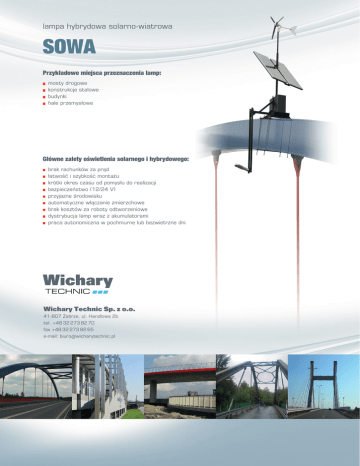 lampa hybrydowa solarno-wiatrowa SOWA Przykładowe miejsca przeznaczenia lamp: mosty drogowe konstrukcje stalowe budynki hale przemysłowe Główne zalety oświetlenia solarnego i hybrydowego: brak rachunków za prąd łatwość i szybkość montażu krótki okres czasu od pomysłu do realizacji bezpieczeństwo (12/24 V) przyjazne środowisku automatyczne włączanie zmierzchowe brak kosztów za roboty odtworzeniowe dystrybucja lamp wraz z akumulatorami praca autonomiczna w pochmurne lub bezwietrzne dni Wichary Technic Sp. z o.o. 41-807 Zabrze, ul. Handlowa 2b tel. +48 32 273 82 70 fax +48 32 273 82 65 e-mail: [email protected] turbina wiatrowa 1500 mm 800 mm panel słoneczny komora akumulatorowa głowica LED lampa hybrydowa solarno-wiatrowa SOWA Parametry techniczne: wysokość źródła światła LED moc źródła światła LED strumień świetlny barwa światła (biała chłodna) trwałość źródeł światła regulowany kąt świecenia głowicy LED napięcie zasilania prędkość startowa turbiny moc turbiny wiatrowej wariant bez turbiny wiatrowej pojemność akumulatorów warunki pracy temperatura wilgotność moc modułu fotowoltanicznego mikroprocesorowy regulator pracy lampy stopień ochrony czas ładowania akumulatorów lato zima okres autonomii systemu przy naładowanych akumulatorach kolor podstawowy możliwość innego koloru (zgodnie z RAL) sterowanie programatorem czasu pracy www.wicharytechnic.pl 8m 56 W (2 x 28) 5900 lm 5000 ÷ 7000 K 30 000 h 30º 24 V 0,8 m/s 300 / 600 W tak min 200 Ah –20ºC ÷ 45ºC 10% ÷ 95% 2 x 190 W tak IP 67 4h 12 h 2-3 dni czarny tak opcja
