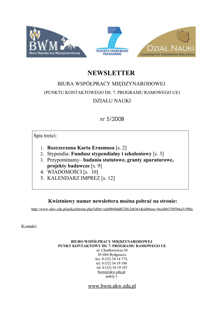 NEWSLETTER BIURA WSPÓŁPRACY MIĘDZYNARODOWEJ (PUNKTU KONTAKTOWEGO DS. 7. PROGRAMU RAMOWEGO UE) DZIAŁU NAUKI nr 5/2008 Spis treści: 1. Rozrzerzona Karta Erasmusa [s. 2] 2. Stypendia: Fundusz stypendialny i szkoleniowy [s. 3] 3. Przypominamy– badania statutowe, granty aparaturowe, projekty badawcze [s. 9] 4. WIADOMOŚCI [s. 10] 5. KALENDARZ IMPREZ [s. 12] Kwietniowy numer newslettera można pobrać na stronie: http://www.ukw.edu.pl/pokazStrone.php?idStr=eab9b04dd8220c2ab361&idMenu=9ecd6b370f5b6a31f90a Kontakt: BIURO WSPÓŁPRACY MIĘDZYNARODOWEJ PUNKT KONTAKTOWY DS. 7. PROGRAMU RAMOWEGO UE ul. Chodkiewicza 30 85-064 Bydgoszcz fax. 0 (52) 34 14 773, tel. 0 (52) 34 19 108 tel. 0 (52) 34 19 107 [email protected] pokój 5 www.bwm.ukw.edu.pl Rozszerzona Karta Uczelni Erasmusa (extended Erasmus University Charter) „Following the evaluation of your application for the Erasmus University Charter with the assistance of independent experts, I am pleased to inform you that your institution has been awarded a charter EXTENDED until the academic year 2013/2014”. Z radością informujemy, że Uniweryt Kazimierza Wielkiego otrzymał rozszerzoną Kartę Uczelni Erasmusa. Rozszerzona Karta Uczelni Erasmusa uprawnia do składania wniosków o przyznanie funduszy na praktyki dla studentów w zagranicznych przedsiębiorstwach, instytucjach. W programie Erasmus można ubiegać się o dwa rodzaje wyjazdów: • wyjazd na część studiów – do zagranicznej uczelni współpracującej z uczelnią macierzystą; • wyjazd na praktykę – do zagranicznej instytucji nieakademickiej. KTO może skorzystać z wyjazdów studenckich Erasmusa? Aby ubiegać się o wyjazd w ramach Erasmusa, należy: • być studentem uczelni, która posiada Kartę Uczelni Erasmusa i prowadzi wymianę studentów, • być zarejestrowanym na studiach prowadzących do uzyskania stopnia/dyplomu (licencjata, inżyniera, magistra lub doktora); • mieć ukończony pierwszy rok studiów pierwszego stopnia (licencjackich, inżynierskich); • być obywatelem kraju uczestniczącego w Erasmusie (albo mieć status uchodźcy lub kartę stałego pobytu w kraju uczestniczącym). NA JAK DŁUGO można wyjechać na praktykę? Na okres od 3 do 12 miesięcy, w obrębie jednego – tego samego – roku akademickiego. Szczegółowe informacje na temat wyjazdów na praktyki można znaleźć na stronie programu Erasmus:http://www.erasmus.org.pl/index.php/ida/44/. Zachęcamy pracowników naukowych i dydaktycznych do nawiązywania współpracy z instytucjami nieakademickimi, które mogłyby przyjąć studentów UKW na praktyki. Biuro Współpracy Międzynarodowej oraz Koordynator Uczelniany Programu Erasmusa dr Katarzyna Lubiewska udzielają wszelkiej pomocy koniecznej do przygotowaniu projektów. We wcześniejszej edycji programu UCZENIE SIĘ PRZEZ CAŁE ŻYCIE (LLP) praktyki dla studentów organizowano w ramach programu Leonardo da Vinci. W latach 2007-2013 należą do programu Erasmus. Uczelniana strona Erasmusa: www.erasmus.ukw.edu.pl Fundusz Stypendialny i Szkoleniowy Fundacja Rozwoju Systemu Edukacji pełniąca rolę Operatora Funduszu Stypendialnego i Szkoleniowego ogłasza otwarty nabór wniosków w ramach pierwszej edycji 2008. Fundusz Stypendialny i Szkoleniowy ustanowiony w ramach Mechanizmu Finansowego EOG oraz Norweskiego Mechanizmu ma na celu zwiększenie spójności społecznej i ekonomicznej w ramach Europejskiego Obszaru Gospodarczego poprzez działania w obszarze edukacji pomiędzy Polską a państwami-darczyńcami (Norwegia, Islandia i Liechtenstein). Typy działań wspierane w ramach Funduszu Stypendialnego i Szkoleniowego: I. Mobilność Studentów i Pracowników Szkół Wyższych II. Kursy Językowe III. Stypendia Indywidualne IV. Współpraca Instytucjonalna V. Rozwój Polskich Uczelni W ramach FSS można uzyskać dofinansowanie na: ✔ studia i praktyki studenckie, staże i praktyki pracowników uczelni, ✔ kursy języka i kultury polskiej oraz kursy języka i kultury państw-darczyńców, ✔ wyjazdy i przyjazdy doktorantów w celu realizacji projektu badawczego i młodych naukowców w celu przeprowadzenia badań naukowych w instytucjach badawczych, ✔ indywidualne wizyty studyjne przedstawicieli instytucji działających w sektorze szkolnictwa podstawowego, średniego, wyższego, kształcenia zawodowego i osób dorosłych, ✔ działania na rzecz wzmocnienia współpracy pomiędzy instytucjami działającymi w sferze edukacji w Polsce i w państwach - darczyńcach, ✔ działania mające na celu zwiększenie udziału polskich instytucji edukacyjnych w programach międzynarodowych, programach wymiany uczniów i studentów oraz możliwości organizowania imprez i wydarzeń międzynarodowych, ✔ działania zmierzające do poprawy jakości nauczania i zasobów dydaktycznych polskiego szkolnictwa i oświaty. ✔ działania służące rozwojowi oferty dydaktycznej, ✔ działania na rzecz poprawy jakości kształcenia na polskich uczelniach, ✔ działania na rzecz poprawy jakości programów studiów w językach obcych oferowanych przez polskie uczelnie. Wnioski należy przesłać pocztą na adres FRSE Najbliższy termin upływa 30 czerwca 2008 Szczegółowe informacje nt. naboru, formularze wniosków i przewodniki są dostępne na stronie internetowej http://www.fss.org.pl. Działanie I Mobilność Studentów i Pracowników Mobilność studentów: • Wyjazdy polskich studentów oraz przyjazdy studentów zagranicznych na okres studiów od 3 do 12 miesięcy (w jednym roku akademickim), wliczając przygotowanie językowe (udział w intensywnym kursie językowym w kraju docelowym przed lub w trakcie okresu studiowania), • Wyjazdy polskich studentów na praktyki do współpracujących instytucji, firm lub organizacji na okres od 3 do 12 miesięcy (w trakcie jednego roku akademickiego), wliczając przygotowanie językowe (udział w intensywnym kursie językowym w kraju państwa darczyńcy przed lub w trakcie okresu studiowania). M