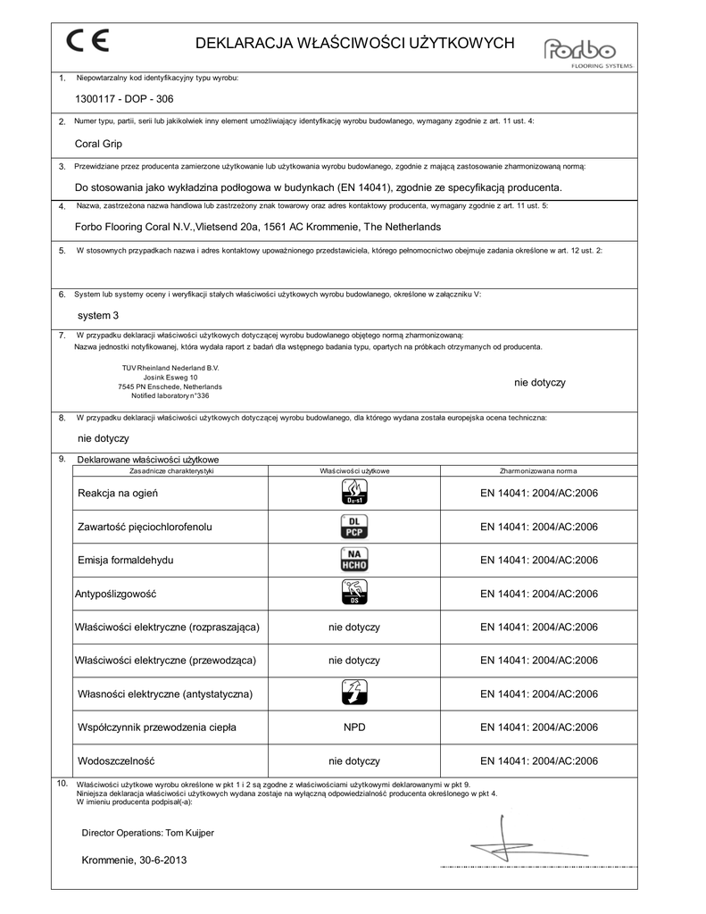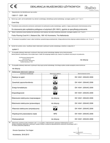 DEKLARACJA WŁAŚCIWOŚCI UŻYTKOWYCH 1. Niepowtarzalny kod identyfikacyjny typu wyrobu: 1300117 - DOP - 306 2. Numer typu, partii, serii lub jakikolwiek inny element umożliwiający identyfikację wyrobu budowlanego, wymagany zgodnie z art. 11 ust. 4: Coral Grip 3. Przewidziane przez producenta zamierzone użytkowanie lub użytkowania wyrobu budowlanego, zgodnie z mającą zastosowanie zharmonizowaną normą: Do stosowania jako wykładzina podłogowa w budynkach (EN 14041), zgodnie ze specyfikacją producenta. 4. Nazwa, zastrzeżona nazwa handlowa lub zastrzeżony znak towarowy oraz adres kontaktowy producenta, wymagany zgodnie z art. 11 ust. 5: Forbo Flooring Coral N.V.,Vlietsend 20a, 1561 AC Krommenie, The Netherlands 5. W stosownych przypadkach nazwa i adres kontaktowy upoważnionego przedstawiciela, którego pełnomocnictwo obejmuje zadania określone w art. 12 ust. 2: 6. System lub systemy oceny i weryfikacji stałych właściwości użytkowych wyrobu budowlanego, określone w załączniku V: system 3 7. W przypadku deklaracji właściwości użytkowych dotyczącej wyrobu budowlanego objętego normą zharmonizowaną: Nazwa jednostki notyfikowanej, która wydała raport z badań dla wstępnego badania typu, opartych na próbkach otrzymanych od producenta. TÜV Rheinland Nederland B.V. Josink Esweg 10 7545 PN Enschede, Netherlands Notified laboratory n°336 8. nie dotyczy W przypadku deklaracji właściwości użytkowych dotyczącej wyrobu budowlanego, dla którego wydana została europejska ocena techniczna: nie dotyczy 9. Deklarowane właściwości użytkowe Zasadnicze charakterystyki Reakcja na ogień Właściwości użytkowe V Zharmonizowana norma EN 14041: 2004/AC:2006 Zawartość pięciochlorofenolu EN 14041: 2004/AC:2006 Emisja formaldehydu EN 14041: 2004/AC:2006 Z EN 14041: 2004/AC:2006 Właściwości elektryczne (rozpraszająca) nie dotyczy EN 14041: 2004/AC:2006 Właściwości elektryczne (przewodząca) nie dotyczy EN 14041: 2004/AC:2006 Własności elektryczne (antystatyczna) L EN 14041: 2004/AC:2006 NPD EN 14041: 2004/AC:2006 nie dotyczy EN 14041: 2004/AC:2006 Antypoślizgowość Współczynnik przewodzenia ciepła Wodoszczelność 10. Właściwości użytkowe wyrobu określone w pkt 1 i 2 są zgodne z właściwościami użytkowymi deklarowanymi w pkt 9. Niniejsza deklaracja właściwości użytkowych wydana zostaje na wyłączną odpowiedzialność producenta określonego w pkt 4. W imieniu producenta podpisał(-a): Director Operations: Tom Kuijper Krommenie, 30-6-2013