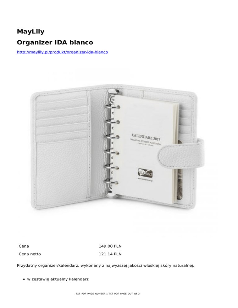 MayLily Organizer IDA bianco http://maylily.pl/produkt/organizer-ida-bianco Cena 149.00 PLN Cena netto 121.14 PLN Przydatny organizer/kalendarz, wykonany z najwyższej jakości włoskiej skóry naturalnej. w zestawie aktualny kalendarz TXT_PDF_PAGE_NUMBER 1 TXT_PDF_PAGE_OUT_OF 2 można do niego wpiąć notatnik posiada miejsce na wizytówki/karty kredytowe i zdjęcie rozmiar pozwala na przenoszenie w torebce zapinany na zatrzask wymiary: 14x10 cm TXT_PDF_PAGE_NUMBER 2 TXT_PDF_PAGE_OUT_OF 2