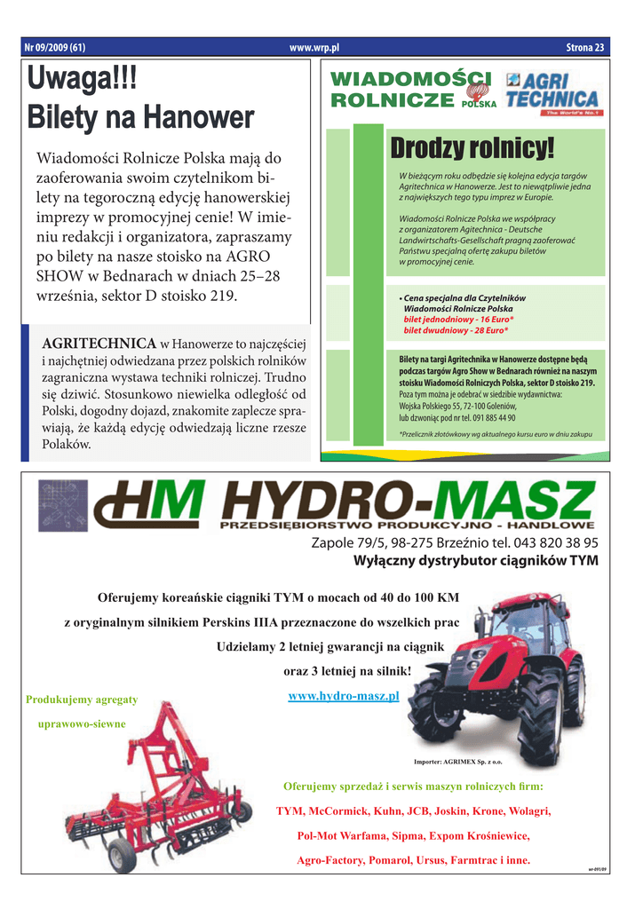Nr 09/2009 (61) Uwaga!!! bilety na Hanower www.wrp.pl Strona 23 Drodzy rolnicy! Wiadomości Rolnicze Polska mają do zaoferowania swoim czytelnikom bilety na tegoroczną edycję hanowerskiej imprezy w promocyjnej cenie! W imieniu redakcji i organizatora, zapraszamy po bilety na nasze stoisko na AGRO SHOW w Bednarach w dniach 25–28 września, sektor D stoisko 219. W bieżącym roku odbędzie się kolejna edycja targów Agritechnica w Hanowerze. Jest to niewątpliwie jedna z największych tego typu imprez w Europie. Wiadomości Rolnicze Polska we współpracy z organizatorem Agitechnica - Deutsche Landwirtschafts-Gesellschaft pragną zaoferować Państwu specjalną ofertę zakupu biletów w promocyjnej cenie. AGRITECHNICA w Hanowerze to najczęściej i najchętniej odwiedzana przez polskich rolników zagraniczna wystawa techniki rolniczej. Trudno się dziwić. Stosunkowo niewielka odległość od Polski, dogodny dojazd, znakomite zaplecze sprawiają, że każdą edycję odwiedzają liczne rzesze Polaków. • Cena specjalna dla Czytelników Wiadomości Rolnicze Polska bilet jednodniowy - 16 Euro* bilet dwudniowy - 28 Euro* Bilety na targi Agritechnika w Hanowerze dostępne będą podczas targów Agro Show w Bednarach również na naszym stoisku Wiadomości Rolniczych Polska, sektor D stoisko 219. Poza tym można je odebrać w siedzibie wydawnictwa: Wojska Polskiego 55, 72-100 Goleniów, lub dzwoniąc pod nr tel. 091 885 44 90 *Przelicznik złotówkowy wg aktualnego kursu euro w dniu zakupu Zapole 79/5, 98-275 Brzeźnio tel. 043 820 38 95 Wyłączny dystrybutor ciągników TYM Oferujemy koreańskie ciągniki TYM o mocach od 40 do 100 KM z oryginalnym silnikiem Perskins IIIA przeznaczone do wszelkich prac Udzielamy 2 letniej gwarancji na ciągnik oraz 3 letniej na silnik! Produkujemy agregaty www.hydro-masz.pl uprawowo-siewne Oferujemy sprzedaż i serwis maszyn rolniczych firm: TYM, McCormick, Kuhn, JCB, Joskin, Krone, Wolagri, Pol-Mot Warfama, Sipma, Expom Krośniewice, Agro-Factory, Pomarol, Ursus, Farmtrac i inne. wr-091/09