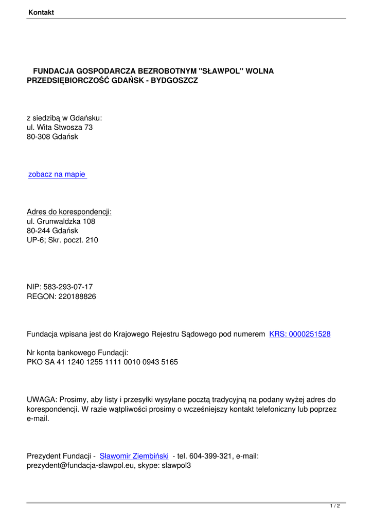 Kontakt FUNDACJA GOSPODARCZA BEZROBOTNYM "SŁAWPOL" WOLNA PRZEDSIĘBIORCZOŚĆ GDAŃSK - BYDGOSZCZ z siedzibą w Gdańsku: ul. Wita Stwosza 73 80-308 Gdańsk zobacz na mapie Adres do korespondencji: ul. Grunwaldzka 108 80-244 Gdańsk UP-6; Skr. poczt. 210 NIP: 583-293-07-17 REGON: 220188826 Fundacja wpisana jest do Krajowego Rejestru Sądowego pod numerem KRS: 0000251528 Nr konta bankowego Fundacji: PKO SA 41 1240 1255 1111 0010 0943 5165 UWAGA: Prosimy, aby listy i przesyłki wysyłane pocztą tradycyjną na podany wyżej adres do korespondencji. W razie wątpliwości prosimy o wcześniejszy kontakt telefoniczny lub poprzez e-mail. Prezydent Fundacji - Sławomir Ziembiński - tel. 604-399-321, e-mail: [email protected], skype: slawpol3 1/2 Kontakt Rada Fundacji w składzie: Przewodniczący Rady Fundacji : Jerzy Woronecki Zapisz Członek Rady Fundacji - Grzegorz Błaszkowski Członek Rady Fundacji - Sławomir Ziembiński (zawieszony na czas pełnienia funkcji Prezydenta w Zarządzie Fundacji) Administrator Strony WWW: e-mail: [email protected] 2/2