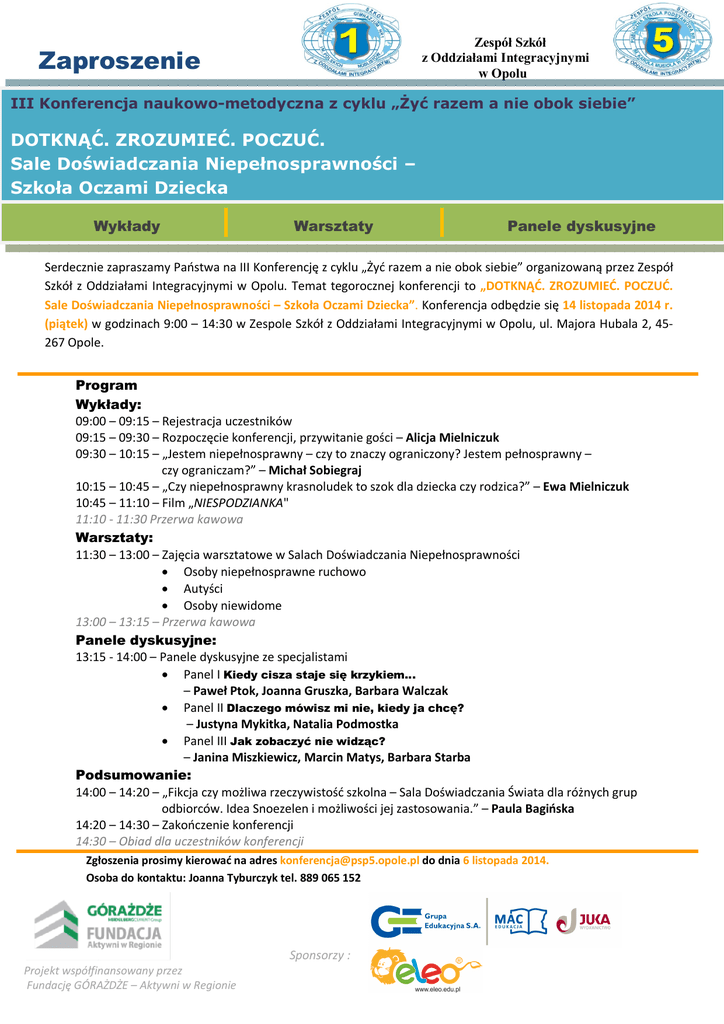 Zespół Szkół z Oddziałami Integracyjnymi w Opolu Zaproszenie III Konferencja naukowo-metodyczna z cyklu „Żyć razem a nie obok siebie” DOTKNĄĆ. ZROZUMIEĆ. POCZUĆ. Sale Doświadczania Niepełnosprawności – Szkoła Oczami Dziecka Wykłady Warsztaty Panele dyskusyjne Serdecznie zapraszamy Państwa na III Konferencję z cyklu „Żyć razem a nie obok siebie” organizowaną przez Zespół Szkół z Oddziałami Integracyjnymi w Opolu. Temat tegorocznej konferencji to „DOTKNĄĆ. ZROZUMIEĆ. POCZUĆ. Sale Doświadczania Niepełnosprawności – Szkoła Oczami Dziecka”. Konferencja odbędzie się 14 listopada 2014 r. (piątek) w godzinach 9:00 – 14:30 w Zespole Szkół z Oddziałami Integracyjnymi w Opolu, ul. Majora Hubala 2, 45267 Opole. Program Wykłady: 09:00 – 09:15 – Rejestracja uczestników 09:15 – 09:30 – Rozpoczęcie konferencji, przywitanie gości – Alicja Mielniczuk 09:30 – 10:15 – „Jestem niepełnosprawny – czy to znaczy ograniczony? Jestem pełnosprawny – czy ograniczam?” – Michał Sobiegraj 10:15 – 10:45 – „Czy niepełnosprawny krasnoludek to szok dla dziecka czy rodzica?” – Ewa Mielniczuk 10:45 – 11:10 – Film „NIESPODZIANKA" 11:10 - 11:30 Przerwa kawowa Warsztaty: 11:30 – 13:00 – Zajęcia warsztatowe w Salach Doświadczania Niepełnosprawności Osoby niepełnosprawne ruchowo Autyści Osoby niewidome 13:00 – 13:15 – Przerwa kawowa Panele dyskusyjne: 13:15 - 14:00 – Panele dyskusyjne ze specjalistami Panel I Kiedy cisza staje się krzykiem… – Paweł Ptok, Joanna Gruszka, Barbara Walczak Panel II Dlaczego mówisz mi nie, kiedy ja chcę? – Justyna Mykitka, Natalia Podmostka Panel III Jak zobaczyć nie widząc? – Janina Miszkiewicz, Marcin Matys, Barbara Starba Podsumowanie: 14:00 – 14:20 – „Fikcja czy możliwa rzeczywistość szkolna – Sala Doświadczania Świata dla różnych grup odbiorców. Idea Snoezelen i możliwości jej zastosowania.” – Paula Bagińska 14:20 – 14:30 – Zakończenie konferencji 14:30 – Obiad dla uczestników konferencji Zgłoszenia prosimy kierować na adres [email protected] do dnia 6 listopada 2014. Osoba do kontaktu: Joanna Tyburczyk tel. 889 065 152 Sponsorzy : Projekt współfinansowany przez Fundację GÓRAŻDŻE – Aktywni w Regionie
