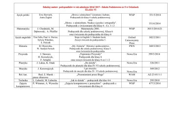 Język polski Ewa Horwath, Anita Żegleń „Słowa z uśmiechem” Literatura i kultura. Podręcznik do klasy 6 szkoły podstawowej. oraz „Słowa z uśmiechem. Nauka o języku i ortografia”. Podręcznik z ćwiczeniami dla klasy 6 . Cz. 1 i 2 Matematyka 2001. Podręcznik dla szkoły podstawowej. Klasa 6 oraz ćwiczenia do podręcznika do klasy 6 Matematyka J. Chodnicki, M. Dąbrowski, A. Pfeiffer Język angielski Tim Falla, Paul A. Davies, Sylwia Wheldon, E. Palczak Steps in English 3. Students book. Zeszyt ćwiczeń do podręcznika 3. Historia B. Olszewska, W. Surdyk-Fertsch „My i historia” Historia i społeczeństwo. Podręcznik dla szkoły podstawowej. Klasa 5. oraz ćwiczenia do podręcznika Przyroda Plastyka J. Stawarz, H. Kowalczyk, F. Szlajfer J. Lukas, K. Onak „Tajemnice Przyrody” Podręcznik dla klasy 6 oraz zeszyt ćwiczeń do klasy 6 cz.1 i 2 „Do dzieła”. Podręcznik do plastyki dla klas IV-VI szkoły podstawowej. Muzyka J. Korowajczyk I gra muzyka. Podręcznik do muzyki dla klas IV- VI szkoły podstawowej. Rel. kat. Technika Zajęcia komputerowe Red. Z. Marek – praca zbiorowa L. Łabecki, M. Łabecka P. Wimmer, A. Wysocka WSiP 551/5/2014 551/6/2014 WSiP 303/3/2014/Z1 Oxford Uniwersytety Press PWN 302/2/2011 Nowa Era 399/3/2014 Nowa Era 326/2011 369/3/2013 569/2012 „Przemienieni przez Boga” Nowa Era WAM AZ-23-01/1-1 „Jak to działa” – podręcznik dla klas 4-6 „Zajęcia komputerowe z pomysłem” - podręcznik z ćwiczeniami dla klasy 6 Nowa Era WSiP 295/2010 477/3/2014