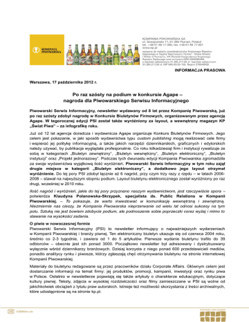 INFORMACJA PRASOWA Warszawa, 17 października 2012 r. Po raz szósty na podium w konkursie Agape – nagroda dla Piwowarskiego Serwisu Informacyjnego Piwowarski Serwis Informacyjny, newsletter wydawany od 8 lat przez Kompanię Piwowarską, już po raz szósty zdobył nagrodę w Konkursie Biuletynów Firmowych, organizowanym przez agencję Agape. W tegorocznej edycji PSI został także wyróżniony za layout, a wewnętrzny magazyn KP „Świat Piwa” – za infografikę roku. Już od 12 lat agencja doradcza i wydawnicza Agape organizuje Konkurs Biuletynów Firmowych. Jego celem jest pokazanie, w jaki sposób wydawnictwa typu custom publishing mogą realizować cele firmy i wspierać jej politykę informacyjną, a także jakich narzędzi dziennikarskich, graficznych i edytorskich należy używać, by publikacja wyglądała profesjonalnie. Co roku kilkadziesiąt firm i instytucji rywalizuje ze sobą w kategoriach „Biuletyn zewnętrzny”, „Biuletyn wewnętrzny”, „Biuletyn elektroniczny”, „Biuletyn instytucji” oraz „Projekt jednorazowy”. Podczas tych dwunastu edycji Kompania Piwowarska zgromadziła za swoje wydawnictwa wyjątkową ilość wyróżnień. Piwowarski Serwis Informacyjny w tym roku zajął drugie miejsce w kategorii „Biuletyn elektroniczny”, a dodatkowo jego layout otrzymał wyróżnienie. Do tej pory PSI zdobył łącznie aż 6 nagród, przy czym trzy razy z rzędu – w latach 20062008 – stawał na najwyższym stopniu podium. Layout biuletynu elektronicznego został wyróżniony po raz drugi, wcześniej w 2010 roku. Ilość nagród i wyróżnień, jakie do tej pory przyznano naszym wydawnictwom, jest rzeczywiście spora – potwierdza Klaudyna Polanowska-Skrzypek, specjalista ds. Public Relations w Kompanii Piwowarskiej. – To pokazuje, że warto inwestować w komunikację wewnętrzną i zewnętrzną. Niezmiernie nas cieszy, że Kompania Piwowarska nieprzerwanie od wielu lat odnosi sukcesy na tym polu. Sztuką nie jest bowiem zdobycie podium, ale podnoszenie sobie poprzeczki coraz wyżej i mimo to stawanie na wysokości zadania. O piwie w nowoczesnej formie Piwowarski Serwis Informacyjny (PSI) to newsletter informujący o najważniejszych wydarzeniach w Kompanii Piwowarskiej i branży piwnej. Ten elektroniczny biuletyn ukazuje się od czerwca 2004 roku, średnio co 2-3 tygodnie, i zawiera od 1 do 5 artykułów. Pierwsze wydanie biuletynu trafiło do 39 odbiorców – obecnie jest ich ponad 3000. Początkowo newsletter był adresowany i dystrybuowany wyłącznie wśród dziennikarzy branżowych. Dzisiaj korzysta z niego ponad 600 przedstawicieli mediów, ponadto analitycy rynku i piwosze, którzy zgłaszają chęć otrzymywania biuletynu na stronie internetowej Kompanii Piwowarskiej. Materiały do biuletynu redagowane są przez pracowników działu Corporate Affairs. Głównym celem jest dostarczanie informacji na temat firmy: jej produktów, promocji, kampanii, inwestycji oraz rynku piwa w Polsce. Ostatnio w newsletterze pojawiają się także artykuły o charakterze edukacyjnym, dotyczące kultury piwnej. Teksty, zdjęcia w wysokiej rozdzielczości oraz filmy zamieszczane w PSI są wolne od jakichkolwiek obciążeń z tytułu praw autorskich. Istnieje też możliwość skorzystania z treści archiwalnych, które udostępnione są na stronie kp.pl. Jak pokazać piwo z tanka? W tym roku Kompanii Piwowarskiej przypadło jeszcze jedno wyróżnienie – za infografikę ilustrującą tekst „Prosto z tanka. Jak to działa?”, który ukazał się w majowym numerze miesięcznika „Świat Piwa”. Magazyn pracowników KP ma na swoim koncie długą listę nagród przyznawanych przez Agape – kolejno przez siedem lat (2003-2009) znajdował się wśród trzech najlepszych biuletynów wewnętrznych, przeważnie na pierwszym miejscu. Dodatkowo wyróżniane były jego poszczególne elementy, np. okładka (2009), layout (2008) czy właśnie infografika. „Świat Piwa" to wewnętrzny miesięcznik wydawany przez Kompanię Piwowarską od 1999 roku. Magazyn trafia do ok. 3200 osób we wszystkich browarach oraz centrach dystrybucji na terenie całego kraju. Dedykowany jest wszystkim osobom zatrudnionym w firmie, a dodatkowo udostępniany emerytowanym pracownikom, wybranym pracownikom koncernu na świecie, gościom KP oraz osobom zainteresowanym (dziennikarzom, kolekcjonerom). Miesięcznik przede wszystkim jest źródłem informacji o tym, co dzieje się w Kompanii Piwowarskiej, jej oddziałach i otoczeniu (wyniki firmy, zmiany organizacyjne, ważne decyzje kierownictwa, nowe produkty, projekty i działania związane z zarządzaniem, a także informacje dotyczące głównego udziałowca – koncernu SABMiller). Kolejną ważną funkcją wydawnictwa jest edukowanie pracowników na temat marek, rynku piwa, kanałów sprzedaży oraz w zakresie postaw ekologicznych i odpowiedzialnego spożywania alkoholu. Poprzez poszerzanie wiedzy na temat produktów, metod produkcji, sposobów serwowania czy ciekawostek piwnych magazyn promuje postawę „Ambasadora Piwa” wśród pracowników. Ponadto wspiera dwustronną komunikację poprzez odnośniki do portalu społecznościowego „Małe Piwo”, gdzie pracownicy znajdują pogłębione wersje artykułów opublikowanych w miesięczniku, zdjęcia oraz materiały video, jak również dostarcza rozrywki, promując wydarzenia sportowe i kulturalne. Zespół redakcyjny „Świata Piwa” reprezentuje różne działy firmy, współpracuje również z innymi pracownikami KP. Do redaktora: Kompania Piwowarska – Lider branży piwowarskiej w Polsce Kompania Piwowarska jest największym przedsiębiorstwem piwowarskim w Polsce. Kilkusetletnie doświadczenia w warzeniu piwa, nowoczesne technologie i rygorystyczne przestrzeganie zasad produkcji na światowym poziomie gwarantują najwyższą jakość naszych produktów. Do portfela marek KP należą najpopularniejsze polskie piwa – m.in. Tyskie, Żubr, Lech, Dębowe Mocne, Redd's, a także mi