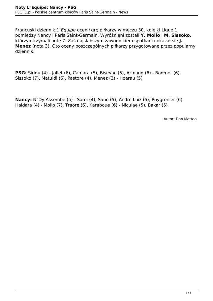 Noty L`Equipe: Nancy - PSG PSGFC.pl - Polskie centrum kibiców Paris Saint-Germain - News Francuski dziennik L`Equipe ocenił grę piłkarzy w meczu 30. kolejki Ligue 1, pomiędzy Nancy i Paris Saint-Germain. Wyróżnieni zostali Y. Mollo i M. Sissoko, którzy otrzymali notę 7. Zaś najsłabszym zawodnikiem spotkania okazał się J. Menez (nota 3). Oto oceny poszczególnych piłkarzy przygotowane przez popularny dziennik: PSG: Sirigu (4) - Jallet (6), Camara (5), Bisevac (5), Armand (6) - Bodmer (6), Sissoko (7), Matuidi (6), Pastore (4), Menez (3) - Hoarau (5) Nancy: N`Dy Assembe (5) - Sami (4), Sane (5), Andre Luiz (5), Puygrenier (6), Haidara (4) - Mollo (7), Traore (6), Karaboue (6) - Niculae (5), Bakar (5) Autor: Don Matteo 1/1 Powered by TCPDF (www.tcpdf.org)