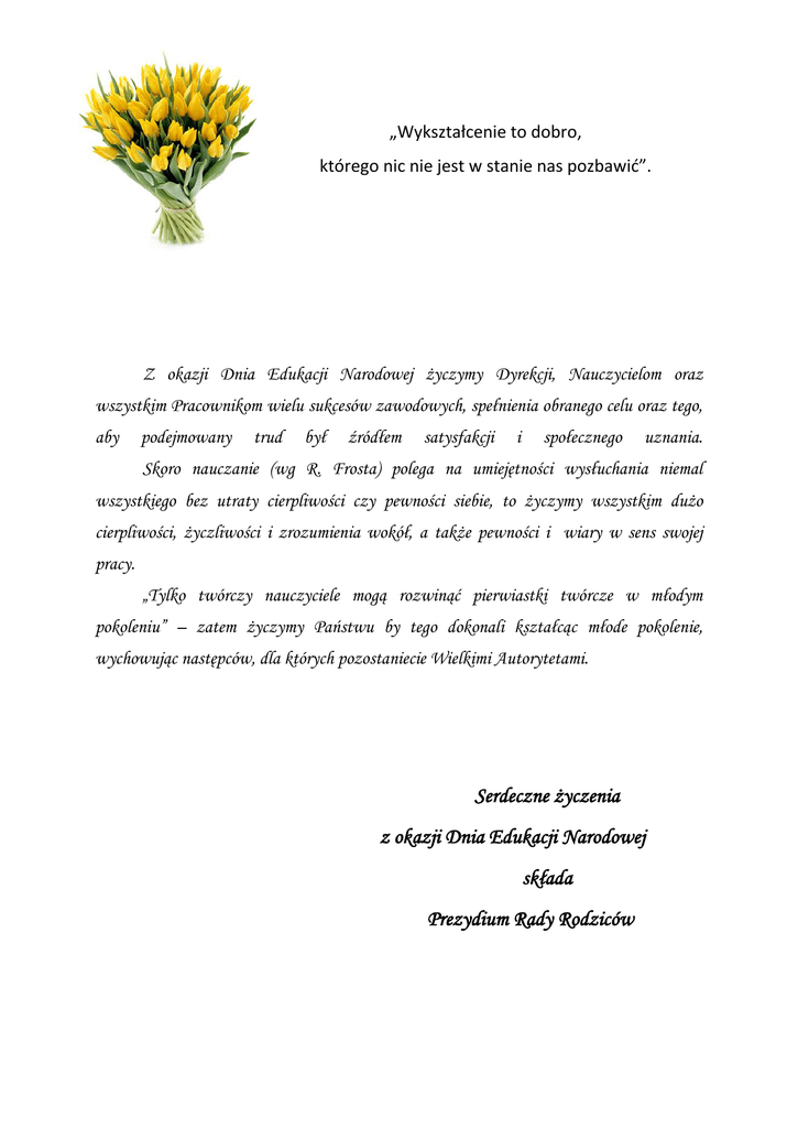 „Wykształcenie to dobro, którego nic nie jest w stanie nas pozbawid”. Z okazji Dnia Edukacji Narodowej życzymy Dyrekcji, Nauczycielom oraz wszystkim Pracownikom wielu sukcesów zawodowych, spełnienia obranego celu oraz tego, aby podejmowany trud był źródłem satysfakcji i społecznego uznania. Skoro nauczanie (wg R. Frosta) polega na umiejętności wysłuchania niemal wszystkiego bez utraty cierpliwości czy pewności siebie, to życzymy wszystkim dużo cierpliwości, życzliwości i zrozumienia wokół, a także pewności i wiary w sens swojej pracy. „Tylko twórczy nauczyciele mogą rozwinąć pierwiastki twórcze w młodym pokoleniu” – zatem życzymy Państwu by tego dokonali kształcąc młode pokolenie, wychowując następców, dla których pozostaniecie Wielkimi Autorytetami. Serdeczne życzenia z okazji Dnia Edukacji Narodowej składa Prezydium Rady Rodziców