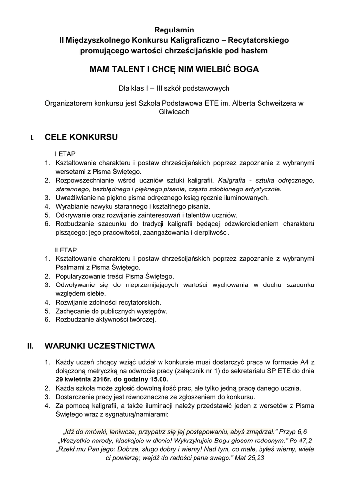Regulamin II Międzyszkolnego Konkursu Kaligraficzno – Recytatorskiego promującego wartości chrześcijańskie pod hasłem MAM TALENT I CHCĘ NIM WIELBIĆ BOGA Dla klas I – III szkół podstawowych Organizatorem konkursu jest Szkoła Podstawowa ETE im. Alberta Schweitzera w Gliwicach I. CELE KONKURSU 1. 2. 3. 4. 5. 6. 1. 2. 3. 4. 5. 6. II. I ETAP Kształtowanie charakteru i postaw chrześcijańskich poprzez zapoznanie z wybranymi wersetami z Pisma Świętego. Rozpowszechnianie wśród uczniów sztuki kaligrafii. Kaligrafia - sztuka odręcznego, starannego, bezbłędnego i pięknego pisania, często zdobionego artystycznie. Uwrażliwianie na piękno pisma odręcznego ksiąg ręcznie iluminowanych. Wyrabianie nawyku starannego i kształtnego pisania. Odkrywanie oraz rozwijanie zainteresowań i talentów uczniów. Rozbudzanie szacunku do tradycji kaligrafii będącej odzwierciedleniem charakteru piszącego: jego pracowitości, zaangażowania i cierpliwości. II ETAP Kształtowanie charakteru i postaw chrześcijańskich poprzez zapoznanie z wybranymi Psalmami z Pisma Świętego. Popularyzowanie treści Pisma Świętego. Odwoływanie się do nieprzemijających wartości wychowania w duchu szacunku względem siebie. Rozwijanie zdolności recytatorskich. Zachęcanie do publicznych występów. Rozbudzanie aktywności twórczej. WARUNKI UCZESTNICTWA 1. Każdy uczeń chcący wziąć udział w konkursie musi dostarczyć prace w formacie A4 z dołączoną metryczką na odwrocie pracy (załącznik nr 1) do sekretariatu SP ETE do dnia 29 kwietnia 2016r. do godziny 15.00. 2. Każda szkoła może zgłosić dowolną ilość prac, ale tylko jedną pracę danego ucznia. 3. Dostarczenie pracy jest równoznaczne ze zgłoszeniem do konkursu. 4. Za pomocą kaligrafii, a także iluminacji należy przedstawić jeden z wersetów z Pisma Świętego wraz z sygnaturą/namiarami: „Idź do mrówki, leniwcze, przypatrz się jej postępowaniu, abyś zmądrzał.” Przyp 6,6 „Wszystkie narody, klaskajcie w dłonie! Wykrzykujcie Bogu głosem radosnym.” Ps 47,2 „Rzekł mu Pan jego: Dobrze, sługo dobry i wierny! Nad tym, co małe, byłeś wierny, wiele ci powierzę; wejdź do radości pana swego.” Mat 25,23 „Albowiem łaską zbawieni jesteście przez wiarę, i to nie z was: Boży to dar; Nie z uczynków, aby się kto nie chlubił.” Ef 2, 8-9 „Wszystkich, którzy są nazwani moim imieniem i których ku swojej chwale stworzyłem, których ukształtowałem i uczyniłem.” Iz 43,7 5. Napisany werset można wzbogacić drobnymi i odpowiednio dobranymi elementami plastycznymi. Praca konkursowa powinna być wykonana na papierze formatu A4, piórem lub ołówkiem. Zdobienia wersetu można wykonywać piórem, ołówkiem i kredkami. 6. Nie wolno używać mazaków! 7. Zgłoszone prace nie podlegają zwrotowi. 8. Prace w nieodpowiednim formacie oraz z błędnie napisaną treścią nie będą brały udziału w konkursie. 9. Kwestie organizacyjne konkursu będą dostępne na stronie internetowej www.szkolyete.pl w zakładce konkursu. III. ORGANIZACJA I PRZEBIEG KONKURSU 1. Prace biorące udział w I etapie konkursu należy dostarczyć do 29 kwietnia 2016r. do godziny 15.00 na adres SP ETE ul. Franciszkańska 5b 44-100 Gliwice. 2. Jury wyłoni zwycięzców I etapu, którzy wezmą udział w II etapie konkursu. 3. Wyniki będą zamieszczone na stronie internetowej szkoły SP ETE dnia 6 maja 2016r. 4. Etap II odbędzie się 19 maja 2016r. o godzinie 9.00 w auli SP ETE. 5. Uczniowie będą recytowali jeden z wybranych Psalmów zamieszczonych na stronie internetowej naszej szkoły. Występ może zostać wzbogacony w obecność rekwizytu lub przebrania. 6. Po wystąpieniach uczestnicy konkursu udadzą się na poczęstunek, w tym czasie będą miały miejsce obrady jury. 7. Jury ogłosi wyniki konkursu oraz wręczy nagrody. 8. Decyzja jury jest ostateczna i nie podlega zmianie. 9. Każdy uczeń, który przeszedł do drugiego etapu otrzyma dyplom oraz upominek. Laureaci oraz wyróżnieni otrzymają nagrody rzeczowe. 10. Organizatorzy proszą o przyniesienie obuwia zmiennego. IV. KRYTERIA OCENY 1. 2. 3. 4. I Etap kaligraficzny Uczniowie będą oceniani w 2 przedziałach wiekowych: I uczniowie klas pierwszych; II uczniowie klas drugich i trzecich. Kryteria oceny: Ogólne wrażenie estetyczne. Prawidłowe rozmieszczenie tekstu. Staranność i oryginalność tekstów graficznych. Samodzielność pracy. II Etap recytatorski Uczniowie będą oceniani w 2 przedziałach wiekowych: I uczniowie klas pierwszych; II uczniowie klas drugich i trzecich. Kryteria oceny: 1. Ogólny wyraz artystyczny. 2. Interpretacja utworu. 3. Kultura słowa. Wszystkie informację związane z konkursem będą zamieszczane na stronie internetowej szkoły: www.szkolyete.pl Organizatorzy: Żaneta Sojka [email protected] Hanna Witecy [email protected] Sandra Schubert [email protected] tel: 32 331 52 33 e-mail: [email protected] Serdecznie zapraszamy do wspólnej zabawy! Załącznik nr 1 METRYCZKA Imię i nazwisko Nazwa szkoły oraz adres Imię i nazwisko nauczyciela Telefon kontaktowy oraz e-mail nauczyciela Oświadczam, że zapoznałem się z regulaminem konkursu Wyrażam zgodę na przetwarzanie danych osobowych zawartych w niniejszym formularzu na potrzeby konkursu zgodnie z ustawą z dnia 29.08.1997r. o ochronie danych osobowych (Dz. U. z 2002r., Nr 101, poz. 926 z póź. zm.) w zakresie koniecznym do prawidłowego przeprowadzenia konkursu oraz na publikację danych a także wizerunku na stronie internetowej szkoły SP ETE. ……………………………………………………… Imię i nazwisko dziecka …………………………………………………… podpis rodzica