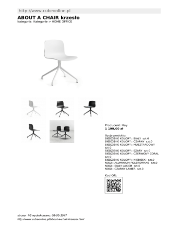 http://www.cubeonline.pl ABOUT A CHAIR krzesło kategoria: Kategorie > HOME OFFICE Producent: Hay 1 199,00 zł Opcje produktu: SIEDZISKO KOLORY:: BIAŁY szt.0 SIEDZISKO KOLORY:: CZARNY szt.0 SIEDZISKO KOLORY:: MUSZTARDOWY szt.0 SIEDZISKO KOLORY:: SZARY szt.0 SIEDZISKO KOLORY:: CZERWONY CORAL szt.0 SIEDZISKO KOLORY:: NIEBIESKI szt.0 NOGI:: ALUMINIUM POLEROWANE szt.0 NOGI:: BIAŁY LAKIER szt.0 NOGI:: CZARNY LAKIER szt.0 Kod QR: strona: 1/2 wydrukowano: 08-03-2017 http://www.cubeonline.pl/about-a-chair-krzeslo.html Krzesło, które dobrze wygląda przy stole jadalnym, wokół stołu konferencyjnego, w stołówce lub w biurze. Ambicją projektantów Hee Welling było osiągnąć wyższy poziom kombinacją formy, funkcji, komfort, szczegóły i estetykę. Siedzisko może być także tapicerowane z przodu lub w całości siedzisko. WYMIARY (cm): wysokość siedziska- 46 wysokość całkowita- 78 szerokość- 52 głębokość- 52 MATERIAŁ: siedzisko: tworzywo- polypropylen stelaż- aluminium lakierowana UWAGI: krzesło obrotowe Inne produkty Hay: http://www.cubeonline.pl/manufacturer/hay Inne produkty projektanta: http://www.cubeonline.pl/designer/hee-welling-and-hay strona: 2/2 wydrukowano: 08-03-2017 http://www.cubeonline.pl/about-a-chair-krzeslo.html