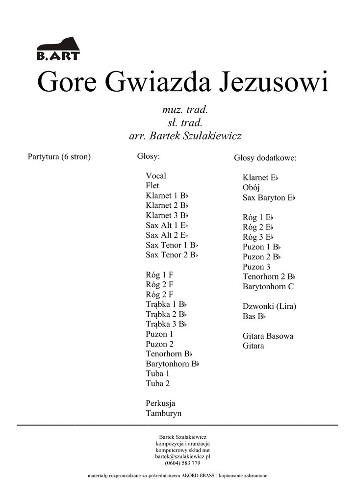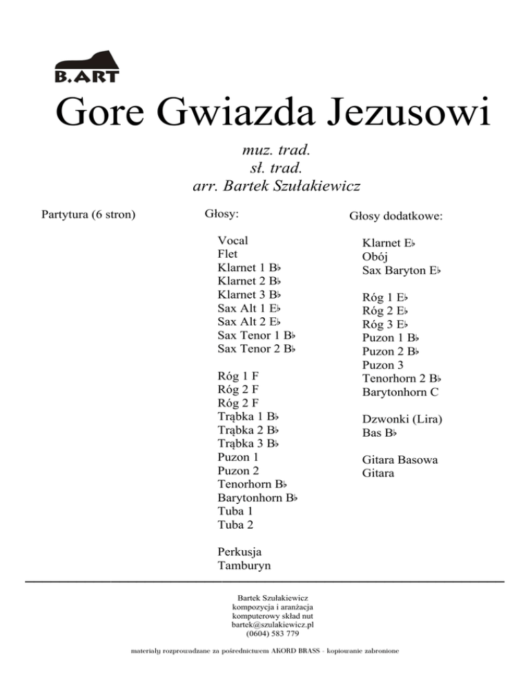Gore Gwiazda Jezusowi muz. trad. sł. trad. arr. Bartek Szułakiewicz Partytura (6 stron) Głosy: Vocal Flet Klarnet 1 B b Klarnet 2 B b Klarnet 3 B b Sax Alt 1 E b Sax Alt 2 E b Sax Tenor 1 B b Sax Tenor 2 B b Róg 1 F Róg 2 F Róg 2 F Trąbka 1 B b Trąbka 2 B b Trąbka 3 B b Puzon 1 Puzon 2 Tenorhorn B b Barytonhorn B b Tuba 1 Tuba 2 Głosy dodatkowe: Klarnet E b Obój Sax Baryton E b Róg 1 E b Róg 2 E b Róg 3 E b Puzon 1 B b Puzon 2 B b Puzon 3 Tenorhorn 2 B b Barytonhorn C Dzwonki (Lira) Bas B b Gitara Basowa Gitara Perkusja Tamburyn ________________________________________________________ Bartek Szułakiewicz kompozycja i aranżacja komputerowy skład nut [email protected] (0604) 583 779 materiały rozprowadzane za pośrednictwem AKORD BRASS - kopiowanie zabronione Gore Gwiazda Jezusowi Vocal Flet Klarnet 1 B b &b C &b C # & C Klarnet 2 B b & Klarnet 3 B b & Sax Alt 1 E b Sax Alt 2 E b Sax Tenor 2 B b & Róg 1 F & Róg 2 F & Róg 3 F & Trąbka 1 B b & Trąbka 2 B b & & Puzon 1 ? Puzon 2 ? Barytonhorn B b Tuba Perkusja Tamburyn # C # & # C & Tenorhorn B b C # & # C Sax Tenor 1 B b Trąbka 3 B b # # C # C # # # b b h = 80 ∑ ∑ ∑ œ^ œ^ œ^ # œ^ œ^ œ^ œ^ ‰J ‰J ‰ J‰J f œ. #œ œ œ œ œ œ œ œ œ bœ œ œ œ œ solo œ œ œ #œ œ œ œ œ œ œ f3 œ^ ‰ œ^ ‰ œ^ œ^ œ^ ‰ œ^ ‰ œ^ œ^ # œ^ ‰ œ^ ‰ œ^ œ^ J J J J J J f ^ ^ ^ ^ ^ ^ ^ ^ ^ ^ ^ ^ œ ‰ œ ‰ œ œ œ ‰ œJ ‰ Jœ œ œ ‰ œj ‰ œj œ J J f œ^ ‰ œ^ ‰ œ^ œ^ œ^ ‰ œ^ ‰ œ^ œ^ œ^ ‰ œ^ ‰ œ^ œ^ J J J J J J f ^ ^ ^ ^ ^ ^ ^ ^ ^ ^ ^ ^ œ ‰ œ ‰ œ œ œ ‰ œ ‰ œ œ # œ ‰ œj ‰ œj œ J J J J f ^ ^ ^ ^ ^ ^ ^ ^ ^ ^ ^ ^ œ ‰ œ ‰ œ œ œ ‰ œJ ‰ Jœ œ œ ‰ œ ‰ œ œ J J J J f ^ ^ ^ ^ ^ ^ ^ ^ ^ ^ ^ ^ ‰ j‰ j ‰ œj ‰ œj œ œ ‰ œj ‰ œj œ œ œ œ œ œ f œ^ ^ C œ f ^ C œ f ^ C œ f ^ C œ f ^ C œ f ^ C œ f œ^ C f ^ C œ f œ^ œ^ œ^ ‰J‰J œ^ ^ ^ ^ ‰œ‰œ œ J J ^ ^ ^ ‰ œj ‰ œj œ œ^ ^ œ ^ ^ ^ ‰ œJ ‰ Jœ œ ^ ^ ^ ‰ œj ‰ œj œ ^ ^ ^ ‰ œj ‰ œj œ ^ œ ^ ^ ^ ‰ œj ‰ œj œ ^ ^ ^ ‰ œJ ‰ Jœ œ œ^ ^ ^ ^ ‰ œJ ‰ Jœ œ # œ^ ‰ œ^ ‰ œ^ œ^ J J ^ ^ ^ ‰œ‰œ œ J J œ^ ^ ^ ^ ‰ œJ ‰ Jœ œ ^ ^ ^ ^ œ ‰ œ‰œ œ J J œ^ œ^ œ^ ‰J‰J œ^ ^ ^ ^ ‰ œj ‰ œj œ ^ ^ ^ ‰ Jœ ‰ Jœ œ ^ œ œ^ ^j ^j ^ ‰œ‰œœ œ^ œ^ œ^ ‰J ‰J ^ ^ ^ ‰ œJ ‰ Jœ œ ^ ^ ^ ^ œ ‰ œ‰œ œ J J ^ ^j ^j ^ #œ ‰ œ ‰ œ œ ^ ^j ^j ^ œ ‰ œ‰œ œ ^j ^j ^ ^ œ ‰ œ‰œ œ # œ^ œ^ œ^ œ^ ‰ J‰J œ^ ‰ œ^ ‰ œ^ œ^ J J œ^ ∑ Œ # >˙ > œ Œ n˙ œ^ Œ >˙ ∑ muz. trad. sł. trad. arr. Bartek Szułakiewicz ∑ ∑ œ^ œ^ œ^ œ^ œ^ ‰J ‰J ‰ J œ. #œ œ œ œ œ œ œ œ œ bœ œ œ œ #œ œ œ œ œ œ œ œ^ œ^ ^ œ Œ ˙ > œ^ Œ >˙ ^ œ ^ œ Œ #˙ > > ^ œ Œ ˙ ^ œ œ^ ^ œ 3 œ^ œ^ œ^ ‰J‰J œ^ ^ ^ ^ ‰ œJ ‰ Jœ œ œ^ ^ ^ ^ ‰œ‰œ œ J J œ^ ^ ^ ^ ‰ œJ ‰ Jœ œ œ^ ^ ^ ^ ‰œ‰œ œ J J ^ œ ^ ^ ^ ‰ œJ ‰ Jœ œ ^ ^ ^ ‰ œJ ‰ Jœ œ ^ ^ ^ ‰ œJ ‰ Jœ œ # œ^ ‰ œ^ ‰ œ^ œ^ J J ^j ^j ^ ^ œ ‰ œ‰œ œ ^ ^ ^ ‰œ‰œœ J J ^ ^ ^ ‰ œJ ‰ Jœ œ ^ ^ ^ ‰ œj ‰ œj œ ^ ^ ^ ^ œ ‰ œ‰œ œ J J ^j ^j ^ ^ œ ‰ œ‰œ œ ^ ^ ^ ^ œ ‰ œ‰œ œ J J ^ ^j ^j ^ #œ ‰ œ ‰ œ œ œ^ œ^ ^ œ ^ ^ ^ ‰ œJ ‰ Jœ œ ^ ^ ^ ‰ œj ‰ œj œ ^ œ Œ ˙ > ^ œ ^ œ Œ #˙ > ^ œ Œ ˙ > ^ œ ^ ^ ^ ‰œ‰œ œ J J ^ ^ ^ ‰ œj ‰ œj œ ^ œ ^ ^ ^ ‰ œj ‰ œj œ ^ œ ^ ^ ^ ‰ œj ‰ œj œ œ^ Œ # >˙ œ^ ^ ^ ^ ‰ œJ ‰ Jœ œ œ^ ^ ^ ^ ‰ œJ ‰ Jœ œ # œ^ ‰ œ^ ‰ œ^ œ^ J J ^ œ Œ ˙ > ^ œ ^ ^ ^ ‰œ‰œ œ J J œ^ ^ ^ ^ ‰ œJ ‰ Jœ œ ^ ^ ^ ^ œ ‰ œ‰œ œ J J œ^ œ^ œ^ ‰J‰J œ^ œ^ Œ >˙ ^ œ Œ ˙ > œ^ # >˙ Œ œ^ Œ >˙ œ^ ^ œ œ^ œ^ ^ ^ ^ ‰ œj ‰ œj œ ^ ^ ^ ‰ œJ ‰ Jœ œ ^ œ œ^ ^j ^j ^ ‰œ‰œœ œ^ œ^ œ^ ‰J ‰J ^ ^ ^ ‰ œJ ‰ Jœ œ ^ ^j ^j ^ œ ‰ œ‰œ œ ^j ^j ^ ^ œ ‰ œ‰œ œ # œ^ œ^ œ^ œ^ ‰ J ‰J œ^ ‰ œ^ ‰ œ^ œ^ J J > ^ ^ ^ ^ ^ ^ ^ ^ ^ ^ ^ ^ ^ ^ # C œ^ ‰ œ^ ‰ œ^ œ^ œ^ ‰ œ^ ‰ œ^ œ^ œ ‰ œ‰œ œ œ Œ ˙ œ ‰ œ ‰ œ œ œ ‰ œJ ‰ Jœ œ œ J J J J J J J J f ^ ^ ^ ^ ^ ^ ^ ^ ^ ^ ^ ^ ^ ^ ^ ^ ^ ^ ^ ^ ^ ^ j j j j # ‰ j‰ j ‰ œj ‰ œj œ œ œ & C œ ‰ œj ‰ œj œ œ ‰ œ ‰ œ œ œ ‰ œ ‰ œ œ œ Œ ˙ œ œ œ œ > f Dmi Gmi A7 A7 Dmi ^j ^j ^ Dmi ^ ^ ^ ^ ^ ^ Gmi ^ ^j ^j ^ A7^ ? b C ^ ‰ ^j ‰ ^j ^ ^ ‰ ^j ‰ ^j ^ ‰ ‰ Œ ‰ ‰ ‰ j j œ œ œ œ ˙ œ œœ œ œ‰œœ œ œ œ œ œ œ œ œ œ œ œ œ œ œ œ ˙ œ f > > ^ ^ ^ ^ ^ ^ ^ ^ yœ^ ‰ yœ^ ‰ yœ^ yœ^ yœ^ Œ Y˙ yœ^ ‰ yœ^ ‰ yœ^ yœ^ yœ^ ‰ yœ^ ‰ yœ^ yœ^ yœ^ C yœœ ‰ yœœ ‰ yœœ yœœ yœœ ‰ yœœ ‰ yœœ yœœ ã œ œ œ œ œ ˙ œ œ œ œ œ œ œ œ œ J J J J J J J J J J f 7^ ‰ 7^ ‰ 7^ 7^ 7^ Œ >& 7^ ‰ 7^ ‰ 7^ 7^ 7^ ‰ 7^ ‰ 7^ 7^ 7^ C 7^ ‰ 7^ ‰ 7^ 7^ 7^ ‰ 7^ ‰ 7^ 7^ ã J J J J J J J J J J æ f materiały rozprowadzane za pośrednictwem AKORD BRASS - kopiowanie zabronione & œœ œœ œ^ ‰ œ^ ‰ œ^ œ^ J J ^j ^j ^ ^ #œ ‰ œ ‰ œ œ ^ ^ ^ ‰œ‰œ œ J J ^ ^ ^ ‰ j‰ j œ œ œ ^ œ œ^ # œ^ ‰J ^ ^ ^ ‰ œ‰œ œ J J ^ ^ ^ ‰ œj ‰ œj œ ^ ^ ^ ‰ œj ‰ œj œ œ œ œ ^ ^ ‰ yœœ ‰ yœœ J J ‰ 7^ ‰ 7^ J J yœ^ œ 7^