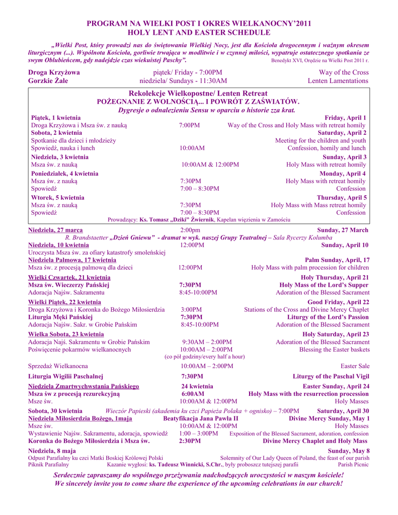 PROGRAM NA WIELKI POST I OKRES WIELKANOCNY’2011 HOLY LENT AND EASTER SCHEDULE „Wielki Post, który prowadzi nas do świętowania Wielkiej Nocy, jest dla Kościoła drogocennym i ważnym okresem liturgicznym (...). Wspólnota Kościoła, gorliwie trwająca w modlitwie i w czynnej miłości, wypatruje ostatecznego spotkania ze swym Oblubieńcem, gdy nadejdzie czas wiekuistej Paschy”. Benedykt XVI, Orędzie na Wielki Post 2011 r. Droga Krzyżowa Gorzkie Żale piątek/ Friday - 7:00PM niedziela/ Sundays - 11:30AM Way of the Cross Lenten Lamentations Rekolekcje Wielkopostne/ Lenten Retreat POŻEGNANIE Z WOLNOŚCIĄ... I POWRÓT Z ZAŚWIATÓW. Dygresje o odnalezieniu Sensu w oparciu o historie zza krat. Piątek, 1 kwietnia Droga Krzyżowa i Msza św. z nauką Sobota, 2 kwietnia Spotkanie dla dzieci i młodzieży Spowiedź, nauka i lunch Niedziela, 3 kwietnia Msza św. z nauką Poniedziałek, 4 kwietnia Msza św. z nauką Spowiedź Wtorek, 5 kwietnia Msza św. z nauką Spowiedź Friday, April 1 Way of the Cross and Holy Mass with retreat homily Saturday, April 2 Meeting for the children and youth 10:00AM Confession, homily and lunch Sunday, April 3 10:00AM & 12:00PM Holy Mass with retreat homily Monday, April 4 7:30PM Holy Mass with retreat homily 7:00 – 8:30PM Confession Thursday, April 5 7:30PM Holy Mass with Mass retreat homily 7:00 – 8:30PM Confession 7:00PM Prowadzący: Ks. Tomasz „Dziki” Źwiernik, Kapelan więzienia w Zamościu Niedziela, 27 marca 2:00pm Sunday, 27 March R. Brandstaetter „Dzień Gniewu” - dramat w wyk. naszej Grupy Teatralnej – Sala Rycerzy Kolumba Niedziela, 10 kwietnia 12:00PM Sunday, April 10 Uroczysta Msza św. za ofiary katastrofy smoleńskiej Niedziela Palmowa, 17 kwietnia Palm Sunday, April, 17 Msza św. z procesją palmową dla dzieci 12:00PM Holy Mass with palm procession for children Wielki Czwartek, 21 kwietnia Msza św. Wieczerzy Pańskiej Adoracja Najśw. Sakramentu Wielki Piątek, 22 kwietnia Droga Krzyżowa i Koronka do Bożego Miłosierdzia Liturgia Męki Pańskiej Adoracja Najśw. Sakr. w Grobie Pańskim Wielka Sobota, 23 kwietnia Adoracja Najś. Sakramentu w Grobie Pańskim Poświęcenie pokarmów wielkanocnych 7:30PM 8:45-10:00PM 3:00PM 7:30PM 8:45-10:00PM 9:30AM – 2:00PM 10:00AM – 2:00PM Holy Thursday, April 21 Holy Mass of the Lord’s Supper Adoration of the Blessed Sacrament Good Friday, April 22 Stations of the Cross and Divine Mercy Chaplet Liturgy of the Lord’s Passion Adoration of the Blessed Sacrament Holy Saturday, April 23 Adoration of the Blessed Sacrament Blessing the Easter baskets (co pół godziny/every half a hour) Sprzedaż Wielkanocna 10:00AM – 2:00PM Liturgia Wigilii Paschalnej Niedziela Zmartwychwstania Pańskiego Msza św z procesją rezurekcyjną Msze św. 7:30PM 24 kwietnia 6:00AM 10:00AM & 12:00PM Easter Sale Liturgy of the Paschal Vigil Easter Sunday, April 24 Holy Mass with the resurrection procession Holy Masses Sobota, 30 kwietnia Wieczór Papieski (akademia ku czci Papieża Polaka + ognisko) – 7:00PM Saturday, April 30 Niedziela Miłosierdzia Bożego, 1maja Beatyfikacja Jana Pawła II Divine Mercy Sunday, May 1 Msze św. 10:00AM & 12:00PM Holy Masses Wystawienie Najśw. Sakramentu, adoracja, spowiedź 1:00 – 3:00PM Exposition of the Blessed Sacrament, adoration, confession Koronka do Bożego Miłosierdzia i Msza św. 2:30PM Divine Mercy Chaplet and Holy Mass Niedziela, 8 maja Sunday, May 8 Odpust Parafialny ku czci Matki Boskiej Królowej Polski Solemnity of Our Lady Queen of Poland, the feast of our parish Piknik Parafialny Kazanie wygłosi: ks. Tadeusz Winnicki, S.Chr., były proboszcz tutejszej parafii Parish Picnic Serdecznie zapraszamy do wspólnego przeżywania nadchodzących uroczystości w naszym kościele! We sincerely invite you to come share the experience of the upcoming celebrations in our church!