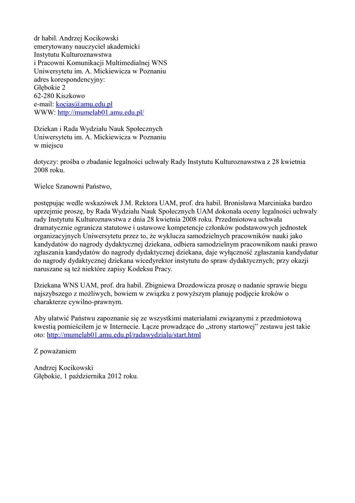 dr habil. Andrzej Kocikowski emerytowany nauczyciel akademicki Instytutu Kulturoznawstwa i Pracowni Komunikacji Multimedialnej WNS Uniwersytetu im. A. Mickiewicza w Poznaniu adres korespondencyjny: Głębokie 2 62-280 Kiszkowo e-mail: [email protected] WWW: http://mumelab01.amu.edu.pl/ Dziekan i Rada Wydziału Nauk Społecznych Uniwersytetu im. A. Mickiewicza w Poznaniu w miejscu dotyczy: prośba o zbadanie legalności uchwały Rady Instytutu Kulturoznawstwa z 28 kwietnia 2008 roku. Wielce Szanowni Państwo, postępując wedle wskazówek J.M. Rektora UAM, prof. dra habil. Bronisława Marciniaka bardzo uprzejmie proszę, by Rada Wydziału Nauk Społecznych UAM dokonała oceny legalności uchwały rady Instytutu Kulturoznawstwa z dnia 28 kwietnia 2008 roku. Przedmiotowa uchwała dramatycznie ogranicza statutowe i ustawowe kompetencje członków podstawowych jednostek organizacyjnych Uniwersytetu przez to, że wyklucza samodzielnych pracowników nauki jako kandydatów do nagrody dydaktycznej dziekana, odbiera samodzielnym pracownikom nauki prawo zgłaszania kandydatów do nagrody dydaktycznej dziekana, daje wyłączność zgłaszania kandydatur do nagrody dydaktycznej dziekana wicedyrektor instytutu do spraw dydaktycznych; przy okazji naruszane są też niektóre zapisy Kodeksu Pracy. Dziekana WNS UAM, prof. dra habil. Zbigniewa Drozdowicza proszę o nadanie sprawie biegu najszybszego z możliwych, bowiem w związku z powyższym planuję podjęcie kroków o charakterze cywilno-prawnym. Aby ułatwić Państwu zapoznanie się ze wszystkimi materiałami związanymi z przedmiotową kwestią pomieściłem je w Internecie. Łącze prowadzące do „strony startowej” zestawu jest takie oto: http://mumelab01.amu.edu.pl/radawydzialu/start.html Z poważaniem Andrzej Kocikowski Głębokie, 1 października 2012 roku.