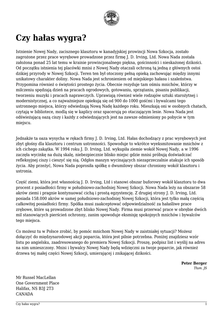 Czy hałas wygra? Istnienie Nowej Nady, zacisznego klasztoru w kanadyjskiej prowincji Nowa Szkocja, zostało zagrożone przez prace wyrębowe prowadzone przez firmę J. D. Irving, Ltd. Nowa Nada została założona ponad 25 lat temu w krainie prowincjonalnego piękna, gościnności i nieskażonej dzikości. Od początku istnienia tej placówki mnisi z Nowej Nady otaczali ochroną tą jedną z głównych ostoi dzikiej przyrody w Nowej Szkocji. Teren ten był otoczony pełną opieką zachowując między innymi unikatowy charakter doliny. Nowa Nada jest schronieniem od miejskiego hałasu i szaleństwa. Przypomina również o świętości prostego życia. Obecnie rezyduje tam ośmiu mnichów, którzy w milczeniu spędzają dzień na pracach ogrodowych, gotowaniu, sprzątaniu, pisaniu publikacji, tworzeniu muzyki i pracach naprawczych. Uprawiają również wiele rodzajów sztuki starożytnej i modernistycznej, a co najważniejsze opiekują się od 900 do 1000 gośćmi i bywalcami tego ustronnego miejsca, którzy odwiedzają Nową Nadę każdego roku. Mieszkają oni w osobnych chatach, czytają w bibliotece, modlą się w kaplicy oraz spacerują po otaczającym lesie. Nowa Nada jest odświeżającą oazą ciszy i każdy z odwiedzających jest na zawsze odmieniony po pobycie w tym miejscu. Jednakże ta oaza wysycha w rękach firmy J. D. Irving, Ltd. Hałas dochodzący z prac wyrębowych jest zbyt głośny dla klasztoru i centrum ustronności. Spowoduje to wkrótce wyeksmitowanie mnichów z ich cichego zakątka. W 1994 roku J. D. Irving, Ltd. wykupiła ziemie wokół Nowej Nady, a w 1996 zaczęła wycinkę na dużą skalę, niebezpiecznie blisko miejsc gdzie mnisi próbują doświadczać refleksyjnej ciszy i cieszyć się nią. Odgłos maszyn wycinających niezaprzeczalnie atakuje ich sposób życia. Aby przeżyć, Nowa Nada poprosiła spółkę o dwumilowy obszar chroniony wokół klasztoru i ustronia. Część ziemi, która jest własnością J. D. Irving, Ltd i stanowi obszar buforowy wokół klasztoru to dwa procent z posiadłości firmy w południowo-zachodniej Nowej Szkocji. Nowa Nada leży na obszarze 58 akrów ziemi i pragnie kontynuować cichą i prostą egzystencję. Z drugiej strony J. D. Irving, Ltd. posiada 158.000 akrów w samej południowo-zachodniej Nowej Szkocji, która jest tylko małą częścią całkowitej posiadłości firmy. Spółka musi zaakceptować odpowiedzialność za hałaśliwe prace zrębowe, które są prowadzone zbyt blisko Nowej Nady. Firma musi przerwać prace w obrębie dwóch mil stanowiących pierścień ochronny, zanim spowoduje eksmisję spokojnych mnichów i bywalców tego miejsca. Co możesz tu w Polsce zrobić, by pomóc mnichom Nowej Nady w zaistniałej sytuacji? Możesz dołączyć do międzynarodowej akcji poparcia, która jest pilnie potrzebna. Poniżej znajdziesz wzór listu po angielsku, zaadresowanego do premiera Nowej Szkocji. Proszę, podpisz list i wyślij na adres na nim umieszczony. Mnisi i bywalcy Nowej Nady będą wdzięczni za twoje poparcie, jak również drzewa tej małej części Nowej Szkocji, umierającej i znikającej dzikości. Peter Berger Tłum. JS Mr Russel MacLellan One Government Place Halifax, NS B3J 2T3 CANADA Czy hałas wygra? 1 Dear Premier MacLellan Upon learning of the plight of the monks at Nova Nada monastery and retreat center we felt compelled to write to publicly express our despair about the issue and our support for the monks and visitors of Nova Nada. The J.D. Irving, Ltd. logging operations are precluding any future retreats of peace and rest from taking place at Nova Nada for members of the public. Nova Nada, the surrounding Birchdale wilderness, the monks and visitors are being immensely hurt by the on-going logging of J.D. Irving, Ltd. I can understand the difficulty of the struggle in which Nova Nada’s Monks are now involved. I give them my full support and join with them in requesting J.D. Irving, Ltd. to provide Nova Nada with a two-mile no-cut buffer zone. I sincerely hope that you have considered all the facts regarding this issue. Especially the relatively miniscule buffer zone that Nova Nada have requested. I urge you to support the plight of Nova Nada and act for the sake of the monks and Nova Scotia’s wilderness. Thank you. Best regards, Czy hałas wygra? 2