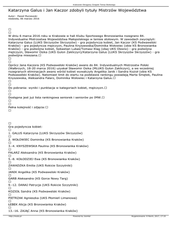 Krakowski Okręgowy Związek Tenisa Stołowego Katarzyna Galus i Jan Kaczor zdobyli tytuły Mistrzów Województwa Autor: Paweł Murzewski niedziela, 06 marzec 2016 W dniu 6 marca 2016 roku w Krakowie w hali Klubu Sportowego Bronowianka rozegrano 84. Indywidualne Mistrzostwa Województwa Małopolskiego w tenisie stołowym. W zawodach zwyciężyli: Katarzyna Galus (LUKS Skrzyszów Skrzyszów) - gra pojedyncza kobiet, Jan Kaczor (KS Podwawelski Kraków) - gra pojedyncza mężczyzn, Paulina Knyszewska/Dominika Wołowiec (obie KS Bronowianka Kraków) - gra podwójna kobiet, Sebastian Lubaś/Tomasz Klag (obaj UKS Olesno) - gra podwójna mężczyzn, Sławomir Osika (UKS Gulon Zakliczyn)/Katarzyna Galus (LUKS Skrzyszów Skrzyszów) - gra podwójna mieszana. Oprócz Jana Kaczora (KS Podwawelski Kraków) awans do 84. Indywidualnych Mistrzostw Polski (Wałbrzych, 18-20 marca 2016) uzyskał Sławomir Osika (MLUKS Gulon Zakliczyn), a we wcześniej rozegranych eliminacjach awans wśród kobiet wywalczyły Angelika Janik i Sandra Kozioł (obie KS Podwawelski Kraków). Natomiast limit do startu na podstawie rankingu posiadają Marta Smętek, Paulina Knyszewska, Aleksandra Falarz, Dominika Wołowiec i Katarzyna Galus. Do pobrania: wyniki i punktacja w kategoriach kobiet, mężczyzn. Dostępna jest już lista rankingowa seniorek i seniorów po IMW. Pełna kolejność i zdjęcia: Gra pojedyncza kobiet: 1. GALUS Katarzyna (LUKS Skrzyszów Skrzyszów) 2. WOŁOWIEC Dominika (KS Bronowianka Kraków) 3.-4. KNYSZEWSKA Paulina (KS Bronowianka Kraków) FALARZ Aleksandra (KS Bronowianka Kraków) 5.-8. KOŁODZIEJ Ewa (KS Bronowianka Kraków) ZAWADZKA Emilia (UKS Rokicie Szczytniki) JANIK Angelika (KS Podwawelski Kraków) GARB Aleksandra (KS Gorce Nowy Targ) 9.-12. DANAJ Patrycja (UKS Rokicie Szczytniki) KOZIOŁ Sandra (KS Podwawelski Kraków) PIETRZAK Agnieszka (UKS Płomień Limanowa) ŁEBEK Alicja (KS Bronowianka Kraków) 13.-16. ZAJĄC Anna (KS Bronowianka Kraków) http://kozts.pl Powered by Joomla! Wygenerowano: 8 March, 2017, 17:19 Krakowski Okręgowy Związek Tenisa Stołowego ŚLIWA Alicja (KS Bronowianka Kraków) GACH Klaudia (KS Gorce Nowy Targ) Gra pojedyncza mężczyzn: 1. KACZOR Jan (KS Podwawelski Kraków) 2. OSIKA Sławomir (MLUKS Gulon Zakliczyn) 3.-4. LIS Daniel (UKS Olesno) MASŁOWSKI Jakub (TKS Opoka Trzebinia) 5.-8. KARMOLIŃSKI Maciej (KS Bronowianka Kraków) KOŁODZIEJ Szymon (KS Bronowianka Kraków) CHYC Tomasz (KS Podwawelski Kraków) KOTARSKI Maciej (KS Bronowianka Kraków) 9.-12. KLAG Tomasz (UKS Olesno) KONSTANTYN Paweł (MKS KSOS Kraków) PODSIADŁO Maciej (MLUKS Gulon Zakliczyn) CELARY Mateusz (UKS Rokicie Szczytniki) 13.-16. GŁĄB Damian (LUKS Skrzyszów Skrzyszów) KĄDZIELA Marek (TKS Opoka Trzebinia) OSTANEK Michał (MKS Skawa Wadowice) LUBAŚ Sebastian (UKS Olesno) 17.-24. STRZAŁKA Marek (KS Podwawelski Kraków) KONIECZNY Tomasz (MLUKS Gulon Zakliczyn) TATARCZUCH Rafał (UKS Olesno) JANIK Tomasz (KS Podwawelski Kraków) ZALEWSKI Krzysztof (UKS Rokicie Szczytniki) KRÓLIKOWSKI Bartosz (KS Gorce Nowy Targ) MALIK Mateusz (MLUKS Gulon Zakliczyn) KLESZCZ Krzesimir (KS Podwawelski Kraków) 25.-32. GARYCKI Adrian (UKS Rokicie Szczytniki) ZAJĄC Jacek (MKS KSOS Kraków) http://kozts.pl Powered by Joomla! Wygenerowano: 8 March, 2017, 17:19 Krakowski Okręgowy Związek Tenisa Stołowego ŁACH Bartłomiej (MKS KSOS Kraków) GALUS Mateusz (LUKS Skrzyszów Skrzyszów) MLECZKO Radosław (LUKS Skrzyszów Skrzyszów) PEREK Nikodem (MKS KSOS Kraków) Gra podwójna kobiet: 1. KNYSZEWSKA Paulina (KS Bronowianka Kraków)/WOŁOWIEC Dominika (KS Bronowianka Kraków) 2. JANIK Angelika (KS Podwawelski Kraków)/KOZIOŁ Sandra (KS Podwawelski Kraków) 3.-4. DANAJ Patrycja (UKS Rokicie Szczytniki)/ZAWADZKA Emilia (UKS Rokicie Szczytniki) GALUS Katarzyna (LUKS Skrzyszów Skrzyszów)/PIETRZAK Agnieszka (UKS Płomień Limanowa) 5.-8. GARB Aleksandra (KS Gorce Nowy Targ)/GACH Klaudia (KS Gorce Nowy Targ) ŁEBEK Alicja (KS Bronowianka Kraków)/KOŁODZIEJ Ewa (KS Bronowianka Kraków) ŚLIWA Alicja (KS Bronowianka Kraków)/ZAJĄC Anna (KS Bronowianka Kraków) Gra podwójna mężczyzn: 1. LUBAŚ Sebastian (UKS Olesno)/KLAG Tomasz (UKS Olesno) 2. OSIKA Sławomir (MLUKS Gulon Zakliczyn)/PODSIADŁO Maciej (MLUKS Gulon Zakliczyn) 3.-4. LIS Daniel (UKS Olesno)/TATARCZUCH Rafał (UKS Olesno) MASŁOWSKI Jakub (TKS Opoka Trzebinia)/KACZOR Jan (KS Podwawelski Kraków) 5.-8. STRZAŁKA Marek (KS Podwawelski Kraków)/GALUS Mateusz (LUKS Skrzyszów Skrzyszów) CELARY Mateusz (UKS Rokicie Szczytniki)/KĄDZIELA Marek (TKS Opoka Trzebinia) CHYC Tomasz (KS Podwawelski Kraków)/JANIK Tomasz (KS Podwawelski Kraków) KOTARSKI Maciej (KS Bronowianka Kraków)/KARMOLIŃSKI Maciej (KS Bronowianka Kraków) 9.-16. KONIECZNY Tomasz (MLUKS Gulon Zakliczyn)/MALIK Mateusz (MLUKS Gulon Zakliczyn) OSTANEK Michał (MKS Skawa Wadowice)/KLESZCZ Krzesimir (KS Podwawelski Kraków) ŁACH Bartłomiej (MKS KSOS Kraków)/GARYCKI Adrian (UKS Rokicie Szczytniki) ZAJĄC Jacek (MKS KSOS Kraków)/PEREK Nikodem (MKS KSOS Kraków) GŁĄB Damian (LUKS Skrzyszów Skrzyszów)/MLECZKO Radosław (LUKS Skrzyszów Skrzyszów) KONSTANTYN Paweł (MKS KSOS Kraków)/ZALEWSKI Krzysztof (UKS Rokicie Szczytniki) http://kozts.pl Powered by Joomla! Wygenerowano: 8 March, 2017, 17:19 Krakowski Okręgowy Związek Tenisa Stołowego Gra podwójna mieszana: 1. OSIKA Sławomir (MLUKS Gulon Zakliczyn)/GALUS Katarzyna (LUKS Skrzyszów Skrzyszów) 2. KOTARSKI Maciej (KS Bronowianka Kraków)/FALARZ Aleksandra (KS Bronowianka Kraków) 3.-4. CHYC Tomasz (KS Podwawelski Kraków)/JANIK Angelika (KS Podwawelski Kraków) KARMOLIŃSKI Maciej (KS Bronowianka Kraków)/KNYSZEWSKA Paulina (KS Bronowianka Kraków) 5.-8. MALIK Mateusz (MLUKS Gulon Zakliczyn)/ŁEBEK Alicja (KS Bronowianka Kraków) KOŁODZIEJ Szymon (KS Bronowianka Kraków)/WOŁOWIEC Dominika (KS Bronowianka Kraków) OSTANEK Michał (MKS Skawa Wadowice)/KOŁODZIEJ Ewa (KS Bronowianka Kraków) LIS Daniel (UKS Olesno)/DANAJ Patrycja (UKS