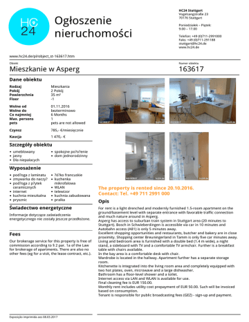 Ogłoszenie nieruchomości HC24 Stuttgart Vogelsangstraße 23 70176 Stuttgart Poniedziałek – Piątek: 9.00 – 17.00 Telefon: +49 (0)711-2991000 Faks: +49 (0)711-291188 [email protected] www.hc24.de www.hc24.de/pl/object_st-163617.htm Obiekt Numer obiektu Mieszkanie w Asperg 163617 Dane obiektu Rodzaj Pokój Powierzchnia Floor Mieszkania 2 Pokój 35 m² -1 Wolne od Wolne do Co najmniej Max. persons pets 01.11.2016 bezterminowo 6 Months 1 pets are not allowed Czynsz 785,- €/miesięcznie Kaucja 1 470,- € Szczegóły obiektu umeblowany jasny Dla niepalacych spokojne po?o?enie dom jednorodzinny Wyposażenie pod?oga z laminatu zmywarka do naczy? pod?oga z p?ytek ceramicznych internet kuchnia mieszkalna prysznic ?ó?ko francuskie kuchenka mikrofalowa WLAN telewizor kuchnia zabudowana pralka Świadectwo energetyczne Informacje dotyczące zaświadczenia energetycznego nie zostały jeszcze przedłożone. Fees Our brokerage service for this property is free of commission according to § 2 par. 1a of the Law for brokerage of apartments. There are also no other fees (eg for a visit, the lease contract, etc.). Exposição imprimida aos 08.03.2017 Powered by TCPDF (www.tcpdf.org) The property is rented since 20.10.2016. Contact: Tel. +49 711 2991 000 Opis For rent is a light drenched and modernly furnished 1.5-room apartment on the ground/basement level with separate entrance with favorable traffic connection and much nature around in Asperg. Asperg has access to suburban train system in Stuttgart area (20 minutes to Stuttgart). Bosch in Schwieberdingen is accessible via car in 10 minutes and Autobahn access (A81) is only 5 minutes away. Excellent shopping opportunities and restaurants, butcher and bakery are in close proximity. Shopping center Breuningerland in Tamm is only five car minutes away. Living and bedroom area is furnished with a double bed (1.4 m wide), a night stand, a sideboard with TV and a comfortable TV armchair. Further is a breakfast table with chairs available. In the bay area is a comfortable desk with chair. Wardrobe is located in the hallway. Apartment further has a separate storage room. Kitchenette is integrated into the living room area and completely equipped with two hot plates, oven, microwave and a large dishwasher. Bathroom has a floor-level shower and a toilet. Internet access via LAN and WLAN is available for use. Final cleaning fee is EUR 150.00. Monthly rent includes utility cost prepayment of EUR 50.00. Such will be invoiced based on consumption. Tenant is responsible for public broadcasting fees (GEZ) - sign-up and payment.
