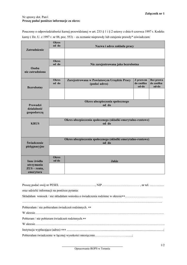 Załącznik nr 1 Nr sprawy dot. Pan/i Proszę podać poniższe informacje za okres: Pouczony o odpowiedzialności karnej przewidzianej w art. 233 § 1 i § 2 ustawy z dnia 6 czerwca 1997 r. Kodeks karny ( Dz. U. z 1997 r. nr 88, poz. 553) – za zeznanie nieprawdy lub zatajenie prawdy* oświadczam: Okres od do Nazwa i adres zakładu pracy Okres od do Nie zarejestrowana jako bezrobotna Zatrudnienie Osoba nie zatrudniona Okres od do Zarejestrowana w Powiatowym Urzędzie Pracy (podać adres) Bezrobotny Bez prawa do zasiłku od-do Okres ubezpieczenia społecznego od do Prowadzi działalność gospodarczą Okres ubezpieczenia społecznego (składki emerytalno-rentowe) od do KRUS Okres ubezpieczenia społecznego (składki emerytalno-rentowe) od do Świadczenie pielęgnacyjne Inne źródła utrzymania ZUS – renta, emerytura Z prawem do zasiłku od-do Okres od do Jakie Proszę podać swój nr PESEL ……………………………., NIP……………………………… , nr tel. ..……........ oraz udzielić informacji na poniższe pytania: Składałam wniosek / nie składałam wniosku o świadczenia rodzinne w okresie ……………………………… …………………………………………………………………………………………………………………….. Pobierałam / nie pobierałam świadczeń rodzinnych. W okresie…………………………………………………………………………………………………………… Pobieram / nie pobieram świadczeń rodzinnych. W okresie……………………………………………………………………………………………………………. Instytucja wypłacająca (adres) .................................................................................................................. .........; Pobierałam świadczenie w łącznej wysokości miesięcznie………………………….......; 1/2 Opracowanie ROPS w Toruniu Pouczony o odpowiedzialności karnej przewidzianej w art. 233 § 1 i § 2 ustawy z dnia 6 czerwca 1997r. Kodeks karny ( Dz. U. z 1997 r. nr 88, poz. 553) – za zeznanie nieprawdy lub zatajenie prawdy* oświadczam, że adres korespondencyjny członków mojej rodziny jest następujący: 1. Kraj:……………………………………………………………………………………………………… ……………………………………………………………………………………… 2. Zagranica:………………………………………………………………………………………………… ……………………………………………………………………………………… Na mocy art. 40 § 4 K.p.a. w przypadku zamieszkania za granicą lub posiadana siedziby za granicą, jeśli nie został ustanowiony pełnomocnik do prowadzenia sprawy w kraju, strona jest zobowiązana wskazać w kraju pełnomocnika do doręczeń. Wskazuję w kraju do doręczeń mojego pełnomocnika w osobie: ……………………………………………………………………………………………………………………… ……………………………………………………………………………………………………………………… …………………………………………………………………………………….. Jestem świadomy, iż zgodnie z § 5 powyższego artykułu w razie niewskazania pełnomocnika do doręczeń przeznaczone dla tej strony pisma pozostawia się w aktach sprawy ze skutkiem doręczenia. Zgodnie z art. 41 § 1 i 2 K.p.a., zobowiązuję się zawiadomić organ administracji publicznej o każdej zmianie mojego adresu oraz adresu mojego pełnomocnika. Jestem świadomy, że w razie zaniedbania obowiązku określonego w art. 41 § 1 doręczenie pisma pod dotychczasowym adresem ma skutek prawny. Miejscowość, data: Podpis: ................................................... ............................................... * art. 233 § 1 Kto składając zeznanie mające służyć za dowód w postępowaniu sądowym lub innym postępowaniu prowadzonym na podstawie ustawy, zeznaje nieprawdę lub zataja prawdę, podlega karze pozbawienia wolności do lat 3. § 2 warunkiem odpowiedzialności jest, aby przyjmujący zeznanie, działając w zakresie swych uprawnień, uprzedził zeznającego o odpowiedzialności karnej za fałszywe zeznania lub odebrał od niego przyrzeczenie. ** Niepotrzebne skreślić *** W przypadku pobierania / składania wniosku o zasiłek rodzinny wypełnić rubryki dotyczące jego wysokości, okresu i miejsca pobierania. OŚWIADCZENIE Oświadczam, iż wyrażam zgodę na gromadzenie i przetwarzanie danych osobowych przez Regionalny Ośrodek Polityki Społecznej w Toruniu, dotyczących mnie i mojej rodziny, w zakresie ustalonym ustawą o świadczeniach rodzinnych ( ustawa z dnia 28 listopada 2003r. o świadczeniach rodzinnych Dz. U. z 2006 r. Nr 139 , poz. 992 z późn. zm. ). Miejscowość, data: Podpis: .............................................. ………………………………….. 2/2 Opracowanie ROPS w Toruniu