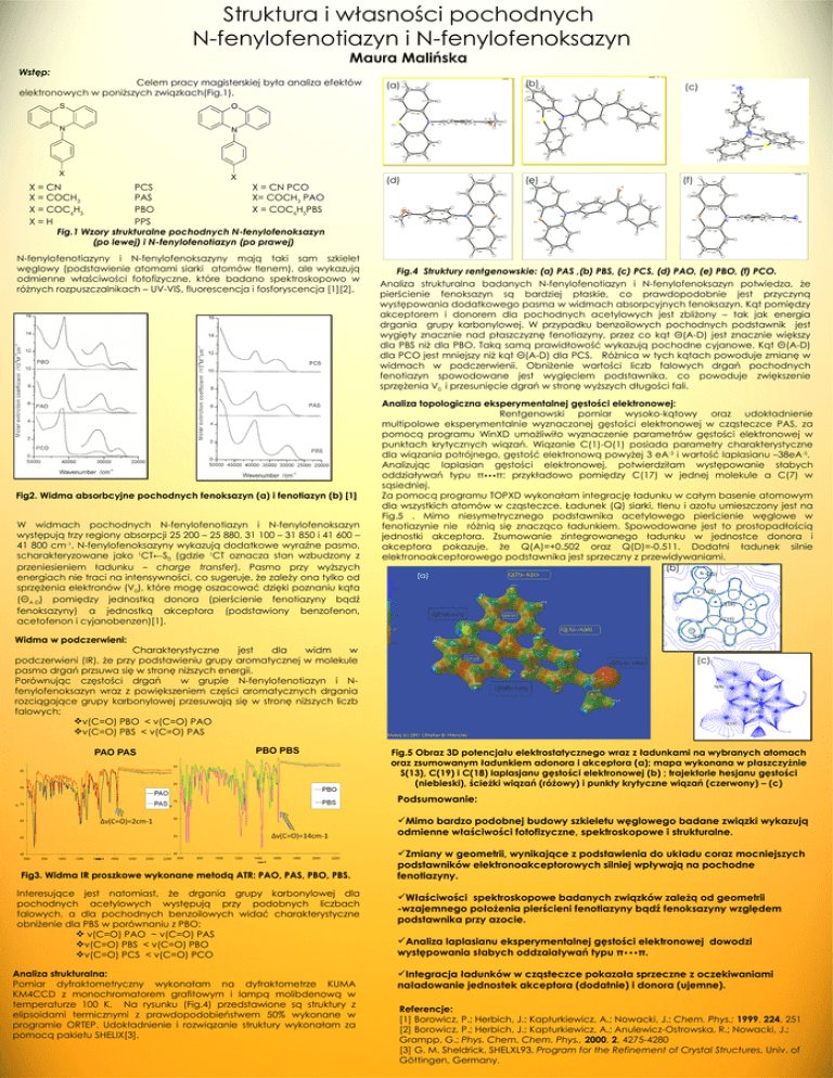 Struktura i własności pochodnych N-fenylofenotiazyn i N-fenylofenoksazyn Maura Malińska Wstęp: Celem pracy magisterskiej była analiza efektów elektronowych w poniższych związkach(Fig.1). S O N N X X X = CN PCS X = CN PCO X = COCH3 PAS X= COCH3 PAO X = COC6H5 PBO X = COC6H5PBS X=H PPS Fig.1 Wzory strukturalne pochodnych N-fenylofenoksazyn (po lewej) i N-fenylofenotiazyn (po prawej) N-fenylofenotiazyny i N-fenylofenoksazyny mają taki sam szkielet węglowy (podstawienie atomami siarki atomów tlenem), ale wykazują odmienne właściwości fotofizyczne, które badano spektroskopowo w różnych rozpuszczalnikach – UV-VIS, fluorescencja i fosforyscencja [1][2]. Fig2. Widma absorbcyjne pochodnych fenoksazyn (a) i fenotiazyn (b) [1] W widmach pochodnych N-fenylofenotiazyn i N-fenylofenoksazyn występują trzy regiony absorpcji 25 200 – 25 880, 31 100 – 31 850 i 41 600 – 41 800 cm-1. N-fenylofenoksazyny wykazują dodatkowe wyraźne pasmo, scharakteryzowane jako 1CT←S0 (gdzie 1CT oznacza stan wzbudzony z przeniesieniem ładunku – charge transfer). Pasmo przy wyższych energiach nie traci na intensywności, co sugeruje, że zależy ona tylko od sprzężenia elektronów (V0), które mogę oszacować dzięki poznaniu kąta (ΘA-D) pomiędzy jednostką donora (pierścienie fenotiazyny bądź fenoksazyny) a jednostką akceptora (podstawiony benzofenon, acetofenon i cyjanobenzen)[1]. (a) (b) (c) (d) (e) (f) Fig.4 Struktury rentgenowskie: (a) PAS ,(b) PBS, (c) PCS, (d) PAO, (e) PBO, (f) PCO. Analiza strukturalna badanych N-fenylofenotiazyn i N-fenylofenoksazyn potwiedza, że pierścienie fenoksazyn są bardziej płaskie, co prawdopodobnie jest przyczyną występowania dodatkowego pasma w widmach absorpcyjnych fenoksazyn. Kąt pomiędzy akceptorem i donorem dla pochodnych acetylowych jest zbliżony – tak jak energia drgania grupy karbonylowej. W przypadku benzoilowych pochodnych podstawnik jest wygięty znacznie nad płaszczyznę fenotiazyny, przez co kąt Θ(A-D) jest znacznie większy dla PBS niż dla PBO. Taką samą prawidłowość wykazują pochodne cyjanowe. Kąt Θ(A-D) dla PCO jest mniejszy niż kąt Θ(A-D) dla PCS. Różnica w tych kątach powoduje zmianę w widmach w podczerwienii. Obniżenie wartości liczb falowych drgań pochodnych fenotiazyn spowodowane jest wygięciem podstawnika, co powoduje zwiększenie sprzężenia V0 i przesunięcie dgrań w stronę wyższych długości fali. Analiza topologiczna eksperymentalnej gęstości elektronowej: Rentgenowski pomiar wysoko-kątowy oraz udokładnienie multipolowe eksperymentalnie wyznaczonej gęstości elektronowej w cząsteczce PAS, za pomocą programu WinXD umożliwiło wyznaczenie parametrów gęstości elektronowej w punktach krytycznych wiązań. Wiązanie C(1)-O(1) posiada parametry charakterystyczne dla wiązania potrójnego, gęstość elektronową powyżej 3 eA-3 i wartość laplasianu –38eA-5. Analizując laplasian gęstości elektronowej, potwierdziłam występowanie słabych oddziaływań typu π•••π: przykładowo pomiędzy C(17) w jednej molekule a C(7) w sąsiedniej. Za pomocą programu TOPXD wykonałam integrację ładunku w całym basenie atomowym dla wszystkich atomów w cząsteczce. Ładunek (Q) siarki, tlenu i azotu umieszczony jest na Fig.5 . Mimo niesymetrycznego podstawnika acetylowego pierścienie węglowe w fenotiazynie nie różnią się znacząco ładunkiem. Spowodowane jest to prostopadłością jednostki akceptora. Zsumowanie zintegrowanego ładunku w jednostce donora i akceptora pokazuje, że Q(A)=+0.502 oraz Q(D)=-0.511. Dodatni ładunek silnie elektronoakceptorowego podstawnika jest sprzeczny z przewidywaniami. (b) (a) Widma w podczerwieni: Charakterystyczne jest dla widm w podczerwieni (IR), że przy podstawieniu grupy aromatycznej w molekule pasmo drgań przsuwa się w stronę niższych energii. Porównując częstości drgań w grupie N-fenylofenotiazyn i Nfenylofenoksazyn wraz z powiększeniem części aromatycznych drgania rozciągające grupy karbonylowej przesuwają się w stronę niższych liczb falowych: ν(C=O) PBO < ν(C=O) PAO ν(C=O) PBS < ν(C=O) PAS (c) Fig.5 Obraz 3D potencjału elektrostatycznego wraz z ładunkami na wybranych atomach oraz zsumowanym ładunkiem adonora i akceptora (a); mapa wykonana w płaszczyżnie S(13), C(19) i C(18) laplasjanu gęstości elektronowej (b) ; trajektorie hesjanu gęstości (niebieski), ścieżki wiązań (różowy) i punkty krytyczne wiązań (czerwony) – (c) Podsumowanie: Mimo bardzo podobnej budowy szkieletu węglowego badane związki wykazują odmienne właściwości fotofizyczne, spektroskopowe i strukturalne. Fig3. Widma IR proszkowe wykonane metodą ATR: PAO, PAS, PBO, PBS. Interesujące jest natomiast, że drgania grupy karbonylowej dla pochodnych acetylowych występują przy podobnych liczbach falowych, a dla pochodnych benzoilowych widać charakterystyczne obniżenie dla PBS w porównaniu z PBO: ν(C=O) PAO ~ ν(C=O) PAS ν(C=O) PBS < ν(C=O) PBO ν(C=O) PCS < ν(C=O) PCO Analiza strukturalna: Pomiar dyfraktometryczny wykonałam na dyfraktometrze KUMA KM4CCD z monochromatorem grafitowym i lampą molibdenową w temperaturze 100 K. Na rysunku (Fig.4) przedstawione są struktury z elipsoidami termicznymi z prawdopodobieństwem 50% wykonane w programie ORTEP. Udokładnienie i rozwiązanie struktury wykonałam za pomocą pakietu SHELIX[3]. Zmiany w geometrii, wynikające z podstawienia do układu coraz mocniejszych podstawników elektronoakceptorowych silniej wpływają na pochodne fenotiazyny. Właściwości spektroskopowe badanych związków zależą od geometrii -wzajemnego położenia pierścieni fenotiazyny bądź fenoksazyny względem podstawnika przy azocie. Analiza laplasianu eksperymentalnej gęstości elektronowej dowodzi występowania słabych oddzaiaływań typu π•••π. Integracja ładunków w cząsteczce pokazała sprzeczne z oczekiwaniami naładowanie jednostek akceptora (dodatnie) i donora (ujemne). Refer