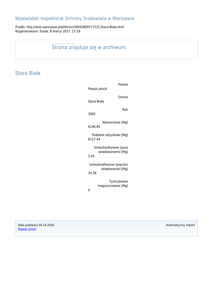 Wojewódzki Inspektorat Ochrony Środowiska w Warszawie Źródło: http://wios.warszawa.pl/pl/form/r26563809777122,Stara-Biala.html Wygenerowano: Środa, 8 marca 2017, 17:19 Strona znajduje się w archiwum. Stara Biała Powiat Powiat płocki Gmina Stara Biała Rok 2005 Wytworzone [Mg] 6146.85 Poddane odzyskowi [Mg] 6117.44 Unieszkodliwione (poza składowaniem) [Mg] 5.05 Unieszkodliwione (poprzez składowanie) [Mg] 24.36 Tymczasowo magazynowane [Mg] 0 Data publikacji 04.10.2016 Rejestr zmian Automatyczny import