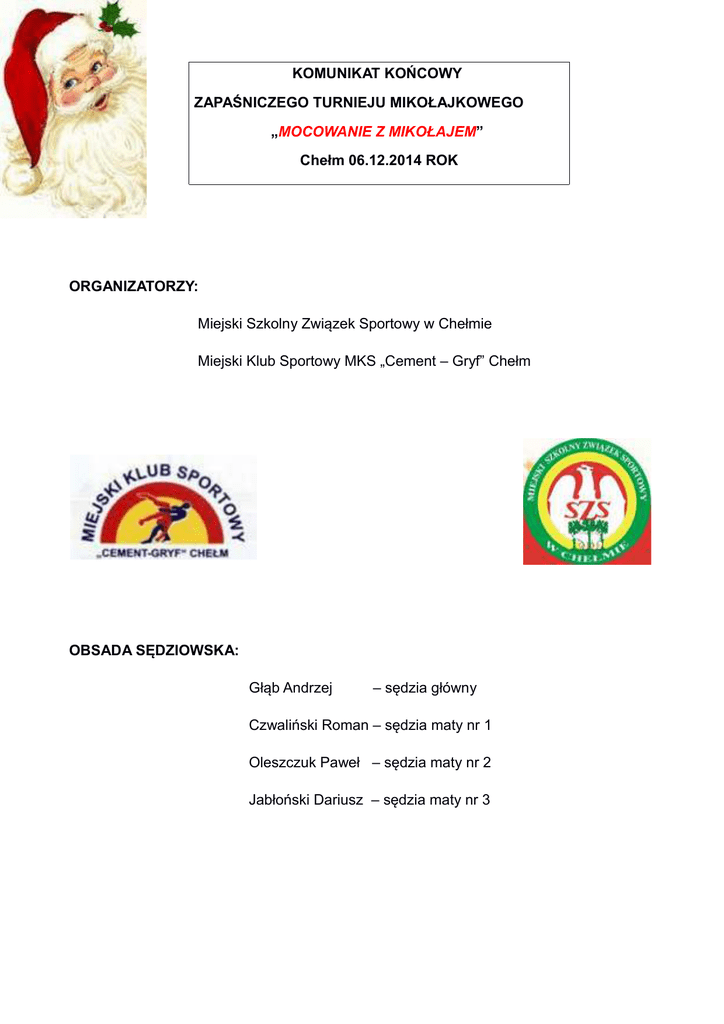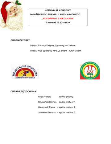 KOMUNIKAT KOŃCOWY ZAPAŚNICZEGO TURNIEJU MIKOŁAJKOWEGO „MOCOWANIE Z MIKOŁAJEM” Chełm 06.12.2014 ROK ORGANIZATORZY: Miejski Szkolny Związek Sportowy w Chełmie Miejski Klub Sportowy MKS „Cement – Gryf” Chełm OBSADA SĘDZIOWSKA: Głąb Andrzej – sędzia główny Czwaliński Roman – sędzia maty nr 1 Oleszczuk Paweł – sędzia maty nr 2 Jabłoński Dariusz – sędzia maty nr 3 ZAPAŚNICZY TURNIEJ MIKOŁAJKOWY „MOCOWANIE Z MIKOŁAJEM” Chełm 06.12.2014 ROK KLASYFIKACJA INDYWIDUALNA DZIECI (CHŁOPCY): • Kat. wagowa do 20 kg I miejsce – Fedec Marcin (Zespół Szkół w Białopolu) II miejsce – Buliński Antoni (Zespół Szkół w Białopolu) III miejsce – Słomka Michał (NSP "RAZEM" w Chełmie) • Kat. wagowa do 25 kg I miejsce – Jabłoński Bartosz (ZSO nr 8 w Chełmie) II miejsce – Kusiak Hubert (Zespół Szkół w Strupinie Dużym) III miejsce – Nafalski Maciej (Zespół Szkół w Strupinie Dużym) III miejsce – Paluch Antoni (Zespół Szkół w Strupinie Dużym) • Kat. wagowa do 28 kg I miejsce – Wójtowicz Adam (Zespół Szkół w Rudzie – Hucie) II miejsce – Kowalczuk Adam (NSP "RAZEM" w Chełmie) III miejsce – Sadowski Kacper (Zespół Szkół w Rudzie – Hucie) III miejsce – Sitarz Kacper (Zespół Szkół w Strupinie Dużym) V miejsce – Zalewski Michał (Zespół Szkół w Rudzie – Hucie) • Kat. wagowa do 30 kg I miejsce – Prończuk Mateusz (ZSO nr 7 w Chełmie) II miejsce – Kaliński Krystian (SP nr 11 w Chełmie) III miejsce – Kamiński Michał (Zespół Szkół w Białopolu) III miejsce – Woźniak Michał (SP nr 8 w Chełmie) V miejsce – Łochnicki Mateusz (Zespół Szkół w Strupinie Dużym) VI miejsce – Tomaszewski Krystian (NSP "ARKA" w Chełmie) • Kat. wagowa do 34 kg I miejsce – Kazanowski Wiktor (SP nr 10 w Chełmie) II miejsce – Piasecki Olaf (SP nr 3 w Chełmie) III miejsce – Gajos Olaf (ZSO nr 7 w Chełmie) III miejsce – Więckiewicz Jakub (NSP "RAZEM" w Chełmie) V miejsce – Kotowski Mateusz (NSP "RAZEM" w Chełmie) • Kat. wagowa do 37 kg I miejsce – Malecha Krystian (ZSO nr 8 w Chełmie) II miejsce – Kowalczuk Michał (NSP "RAZEM" w Chełmie) III miejsce – Gałęza Kacper (NSP "RAZEM" w Chełmie) III miejsce – Krawczyński Michał (SP nr 10 w Chełmie) • Kat. wagowa do 39 kg I miejsce – Truszkowski Szymon (ZSO nr 8 w Chełmie) II miejsce – Wawrzyniak Jakub (NSP "RAZEM" w Chełmie) III miejsce – Nowak Dawid (NSP "RAZEM" w Chełmie) III miejsce – Skóra Eryk (SP nr 2 w Chełmie) V miejsce – Gajos Oskar (ZSO nr 7 w Chełmie) VI miejsce – Kuc Emil (ZSO nr 7 w Chełmie) • Kat. wagowa do 41 kg I miejsce – Wolnicki Daniel (Zespół Szkół w Strupinie Dużym) II miejsce – Sadlej Kacper (Zespół Szkół w Strachosławiu) III miejsce – Mamczarz Szymon (NSP nr 2 Akademia Małego Księcia w Chełmie) III miejsce – Pietrzak Miłosz (Zespół Szkół w Strupinie Dużym) • Kat. wagowa do 43 kg I miejsce – Bataliński Marcin (ZSO nr 7 w Chełmie) II miejsce – Deneka Michał (Zespół Szkół w Rudzie – Hucie) III miejsce – Słoboda Kacper (NSP "RAZEM" w Chełmie) III miejsce – Kamiński Arkadiusz (SP nr 10 w Chełmie) • Kat. wagowa do 45 kg I miejsce – Szymański Daniel (SP nr 3 w Chełmie) II miejsce – Szwalikowski Bartłomiej (Zespół Szkół w Rudzie – Hucie) III miejsce – Hutyra Kacper (SP nr 3 w Chełmie) III miejsce – Gajos Oliwier (ZSO nr 7 w Chełmie) • Kat. wagowa do 47 kg I miejsce – Ćwir Jarosław (ZSO nr 7 w Chełmie) II miejsce – Brzóska Erwin (SP nr 10 w Chełmie) III miejsce – Zawistowski Jakub (ZSO nr 8 w Chełmie) III miejsce – Stelmaszczuk Tomasz (NSP nr2 Akademia Małego Księcia w Chełmie) V miejsce – Kuchta Michał (Zespół Szkół w Rudzie – Hucie) • Kat. wagowa do 50 kg I miejsce – Twardzik Artur (Zespół Szkół w Białopolu) II miejsce – Kozak Miłosz (Zespół Szkół Społecznych w Chełmie) III miejsce – Oborski Jakub (ZSO nr 8 w Chełmie) • Kat. wagowa do 55 kg I miejsce – Zeniuk Kacper (SP nr 10 w Chełmie) II miejsce – Fedec Michał (Zespół Szkół w Białopolu) III miejsce – Kliś Krzysztof (SP nr 3 w Chełmie) • Kat. wagowa do 70 kg I miejsce – Zalewski Szymon (SP nr 10 w Chełmie) II miejsce – Raczek Jakub (SP nr 10 w Chełmie) KLASYFIKACJA INDYWIDUALNA MŁODZICY: • Kat. wagowa do 32 kg I miejsce – Kochoń Szymon (Zespół Szkół w Rudzie – Hucie) II miejsce – Biskupski Sławomir (SP nr 3 w Chełmie) • Kat. wagowa do 35 kg I miejsce – Gilowski Karol (Zespół Szkół w Rudzie – Hucie) II miejsce – Kamiński Bartosz (SP nr 3 w Chełmie) III miejsce – Lodowski Dawid (Zespół Szkół w Rudzie – Hucie) • Kat. wagowa do 38 kg I miejsce – Hałaj Marcin (Publiczne Gimnazjum w Sielcu) II miejsce – Szumiło Mateusz (Zespół Szkół w Strupinie Dużym) III miejsce – Krzyżanowski Łukasz (SP nr 2 w Chełmie) • Kat. wagowa do 42 kg I miejsce – Czwaliński Michał (ZSO nr 8 w Chełmie) II miejsce – Korniszuk Kamil (ZSO nr 1 w Chełmie) III miejsce – Palestrant Sebastian (ZSO nr 7 w Chełmie) • Kat. wagowa do 53 kg I miejsce – Nowaczewski Rafał (Zespół Szkół w Białopolu) II miejsce – Chromik Eryk (NSP nr 2 Akademia Małego Księcia w Chełmie) • Kat. wagowa do 73 kg I miejsce – Grabowiecki Jakub (Zespół Szkół w Stołpiu) II miejsce – Misiec Mateusz (ZSO nr 7 w Chełmie) • Kat. wagowa do 85 kg I miejsce – Szymonowicz Szymon (ZSO nr 1 w Chełmie) II miejsce – Fedec Łukasz (Zespół Szkół w Białopolu) KLASYFIKACJA INDYWIDUALNA DZIECI (DZIEWCZĄT): • Kat. wagowa do 22 kg I miejsce – Kamela Wiktoria (Zespół Szkół w Wierzbicy) II miejsce – Dowierciał Kornelia (Zespół Szkół w Białopolu) III miejsce – Rząd Natalia (Zespół Szkół w Białopolu) • Kat. wagowa do 25 kg I miejsce – Gorczyca Natalia (Zespół Szkół w Wierzbicy) II miejsce – Domańska Roksana (Zespół Szkół w Białopolu) 