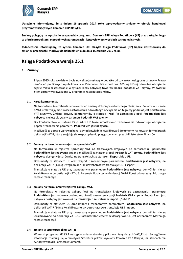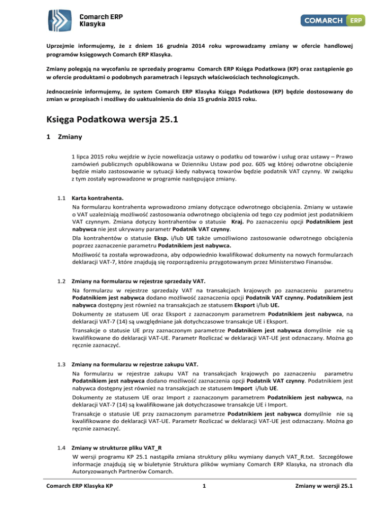 Uprzejmie informujemy, że z dniem 16 grudnia 2014 roku wprowadzamy zmiany w ofercie handlowej programów księgowych Comarch ERP Klasyka. Zmiany polegają na wycofaniu ze sprzedaży programu Comarch ERP Księga Podatkowa (KP) oraz zastąpienie go w ofercie produktami o podobnych parametrach i lepszych właściwościach technologicznych. Jednocześnie informujemy, że system Comarch ERP Klasyka Księga Podatkowa (KP) będzie dostosowany do zmian w przepisach i możliwy do uaktualnienia do dnia 15 grudnia 2015 roku. Księga Podatkowa wersja 25.1 1 Zmiany 1 lipca 2015 roku wejdzie w życie nowelizacja ustawy o podatku od towarów i usług oraz ustawy – Prawo zamówień publicznych opublikowana w Dzienniku Ustaw pod poz. 605 wg której odwrotne obciążenie będzie miało zastosowanie w sytuacji kiedy nabywcą towarów będzie podatnik VAT czynny. W związku z tym zostały wprowadzone w programie następujące zmiany. 1.1 Karta kontrahenta. Na formularzu kontrahenta wprowadzono zmiany dotyczące odwrotnego obciążenia. Zmiany w ustawie o VAT uzależniają możliwość zastosowania odwrotnego obciążenia od tego czy podmiot jest podatnikiem VAT czynnym. Zmiana dotyczy kontrahentów o statusie Kraj. Po zaznaczeniu opcji Podatnikiem jest nabywca nie jest ukrywany parametr Podatnik VAT czynny. Dla kontrahentów o statusie Eksp. i/lub UE także umożliwiono zastosowanie odwrotnego obciążenia poprzez zaznaczenie parametru Podatnikiem jest nabywca. Możliwość ta została wprowadzona, aby odpowiednio kwalifikować dokumenty na nowych formularzach deklaracji VAT-7, które znajdują się rozporządzeniu przygotowanym przez Ministerstwo Finansów. 1.2 Zmiany na formularzu w rejestrze sprzedaży VAT. Na formularzu w rejestrze sprzedaży VAT na transakcjach krajowych po zaznaczeniu parametru Podatnikiem jest nabywca dodano możliwość zaznaczenia opcji Podatnik VAT czynny. Podatnikiem jest nabywca dostępny jest również na transakcjach ze statusem Eksport i/lub UE. Dokumenty ze statusem UE oraz Eksport z zaznaczonym parametrem Podatnikiem jest nabywca, na deklaracji VAT-7 (14) są uwzględniane jak dotychczasowe transakcje UE i Eksport. Transakcje o statusie UE przy zaznaczonym parametrze Podatnikiem jest nabywca domyślnie nie są kwalifikowane do deklaracji VAT-UE. Parametr Rozliczać w deklaracji VAT-UE jest odznaczany. Można go ręcznie zaznaczyć. 1.3 Zmiany na formularzu w rejestrze zakupu VAT. Na formularzu w rejestrze zakupu VAT na transakcjach krajowych po zaznaczeniu parametru Podatnikiem jest nabywca dodano możliwość zaznaczenia opcji Podatnik VAT czynny. Podatnikiem jest nabywca dostępny jest również na transakcjach ze statusem Import i/lub UE. Dokumenty ze statusem UE oraz Import z zaznaczonym parametrem Podatnikiem jest nabywca, na deklaracji VAT-7 (14) są kwalifikowane jak dotychczasowe transakcje UE i Import. Transakcje o statusie UE przy zaznaczonym parametrze Podatnikiem jest nabywca domyślnie nie są kwalifikowane do deklaracji VAT-UE. Parametr Rozliczać w deklaracji VAT-UE jest odznaczany. Można go ręcznie zaznaczyć. 1.4 Zmiany w strukturze pliku VAT_R W wersji programu KP 25.1 nastąpiła zmiana struktury pliku wymiany danych VAT_R.txt. Szczegółowe informacje znajdują się w biuletynie Struktura plików wymiany Comarch ERP Klasyka, na stronach dla Autoryzowanych Partnerów Comarch. Comarch ERP Klasyka KP 1 Zmiany w wersji 25.1 Uwaga: Nowe formularze deklaracji VAT-7 zostaną wprowadzone w kolejnej wersji programu KP. Księga Podatkowa wersja 25.0 1 Instalacja programu u użytkowników KP2014 Użytkownicy programu KP2014 otrzymują płytę CD na dany rok. W celu zainstalowania programu należy: włożyć do napędu dyskietkę (płytę) z programem, poczekać aż pojawi się okienko z Comarch Asystą, wybrać Aktualne wersje, odszukać Księgę Podatkową, kliknąć na link, następnie otworzyć katalog Disk1 i uruchomić program za pomocą pliku instaluj.exe, po uruchomieniu programu zaakceptować warunki gwarancji <Enter>, podać ścieżkę dostępu do pliku aktywacyjnego *.rej (klawisz <F10>), wybrać dysk, na którym zainstalowany był program z poprzedniego roku. Program instalacyjny odczyta z pliku aktywacyjnego wersję, nazwę użytkownika i numer seryjny programu oraz dokona poprawnej instalacji. Po zakończeniu instalacji na dysku, oprócz katalogu z programem KP2014, pojawi się katalog KP2015, zawierający m.in. zbiory: KP2015.EXE - program główny, KP2015.HLP - zbiór wykorzystywany przez funkcję "Help" programu, CONFIG.DAT, OPTIONS.CTL - zbiory konfiguracyjne programu oraz podkatalogi: WZORZEC, w którym zawarte są przykładowe dane. DOKUMENT z przykładowym dokumentem dostępnym z opcji Edytor tekstu Program KP2015 należy uruchomić komendami: CD \KP2015 <Enter> KP2015.EXE <Enter> Program uruchomi się w przykładowej bazie danych WZORZEC. Uwaga: Po zainstalowaniu programu KP2015, oprócz nowego katalogu KP2015 na dysku zostaną katalogi z lat poprzednich KP2014 itd., z których to katalogów należy uruchamiać odpowiednio program Księga Podatkowa, aby mieć dostęp do danych z lat poprzednich. 2 Import danych z programu KP 2014 Użytkownicy programu KP2014 mają możliwość dokonać importu danych o konfiguracji programu oraz "stałych" danych o firmie, takich jak pieczątka firmy, informacje o właścicielach, pracownikach, ewidencja środków trwałych itp. W celu dokonania importu danych z KP2014 należy w programie KP2015 uruchomić Funkcje specjalne, a następnie wybrać Import danych z KP2014. Ukaże się menu zawierające dwie pozycje: Import konfiguracji i Import danych firmy. 2.1 Import konfiguracji Import konfiguracji umożliwia przeniesienie z KP2014 następujących danych: parametrów konfiguracyjnych typu: emulacja polskich liter, szerokie wydruki, ciągłość numeracji w roku, pytanie o identyfikator, parametrów drukarek - przypisanie portów do określonych wydruków, typy drukarek na poszczególnych portach, listy oper