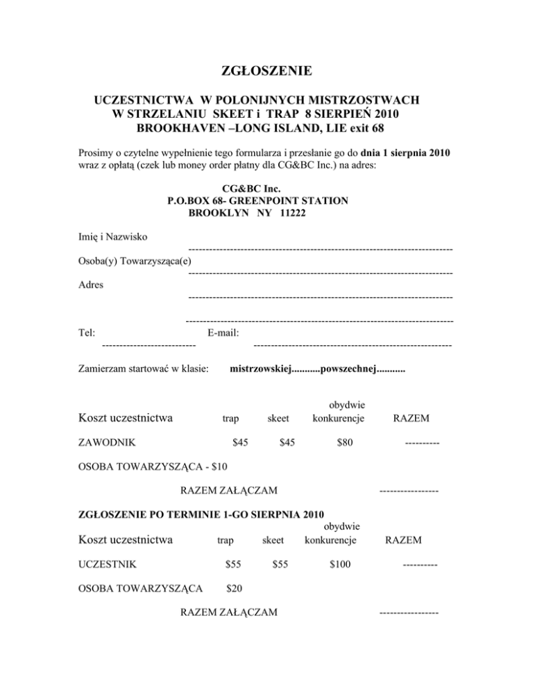 ZGOSZENIE UCZESTNICTWA W POLONIJNYCH MISTRZOSTWACH W STRZELANIU SKEET i TRAP 8 SIERPIE 2010 BROOKHAVEN –LONG ISLAND, LIE exit 68 Prosimy o czytelne wypenienie tego formularza i przesanie go do dnia 1 sierpnia 2010 wraz z opat (czek lub money order patny dla CG&BC Inc.) na adres: CG&BC Inc. P.O.BOX 68- GREENPOINT STATION BROOKLYN NY 11222 Imi i Nazwisko ---------------------------------------------------------------------------Osoba(y) Towarzyszca(e) ---------------------------------------------------------------------------Adres ---------------------------------------------------------------------------- Tel: ----------------------------------------------------------------------------E-mail: ----------------------------------------------------------------------------------- Zamierzam startowa w klasie: Koszt uczestnictwa mistrzowskiej...........powszechnej........... trap ZAWODNIK skeet $45 $45 obydwie konkurencje $80 RAZEM ---------- OSOBA TOWARZYSZ CA - $10 RAZEM ZA CZAM ----------------- ZGOSZENIE PO TERMINIE 1-GO SIERPNIA 2010 obydwie Koszt uczestnictwa trap skeet konkurencje UCZESTNIK $55 OSOBA TOWARZYSZ CA $20 $55 RAZEM ZA CZAM $100 RAZEM ---------- ----------------- REGULAMIN POLONIJNYCH ZAWODOW STRZELECKICH W KONKURENCJI TRAP I SKEET ORGANIZOWANYCH PRZEZ CENTENNIAL GUN & BOW CLUB NY I. TRAP: 1. Kady uczestnik zawodów strzela do 75 rzutków. a. jedna seria 25 rzutków w konkurencji „TRAP” b. jedna seria 50 rzutków w konkurencji „PODWÓJNY TRAP” 2. Rzutek uwaa si za trafiony, jeeli po oddaniu jednego strza u ,odstrzelony zostaje widoczny kawa ek. 3. Kolejno miejsc uczestnikow zawodów ustala si na podstawie iloci uzyskanych punktów (kady rozbity rzutek- 1 punkt). a. w przypadku równej iloci punktów o kolejnoci decyduje lepszy wynik w konkurencji „PODWÓJNY TRAP” b. zwycizc zostaje ten z uczestników, który uzyska najwicej punktów. c.w przypadku uzyskania równej ilci punktów,przez najlepszych dwóch , trzech zawodników, o kolejnoci decyduje dodatkowa seria (25 rzutków „TRAP”) 4. Uczestnicy moga uywa kadej sprawnej broni rutowej a. zaleca si stosowa bro w kalibrach 12,16,20. b. zaleca si stosowa amunicj o gruboci rutu 71/2 do 9. II. SKEET 1. Kady uczestnik tej konkurencji strzela do 75 rzutków w trzech seriach po 25rzutkow kada. 2. Rzutek uwaa si za trafiony, jeeli po oddaniu strza u odstrzelony zostaje widoczny kawa ek. 3. W przypadku niewypa u, niezarepetowania w broni automatycznej zabezpieczenia broni, zawodnik ma prawo do powtórzenia rzutka. 4. W dublecie,w przypadku rozbicia jednym strza em ,dwóch rzutków zaliczony zostaje rzutek odlatujcy strzelajcy dostrzeliwuje rzutek nadlatujcy 5. Kolejno miejsc ustala si na podstawie iloci uzyskanych punktów(kady rozbity rzutek -1 punkt). 6. Wygrywa zawodnik, który uzyska najwyszy wynik. 7. W przypadku uzyskania równej iloci punktów,przez najleprzych dwóch lub wicej zawodników, o kolejnoci decyduje dodatkowa seria, a do wy onienia zwycizcy. 8. O kolejnoci miejsc od 4,5,6, .....decyduje ilo uzyskanych punktów, a przy jednakowym wyniku zwycia lepszy wynik w dubletach. 9. W konkurencji tej mog wzi udzia zawodnicy posiadajcy bro rutow umoliwiajc oddanie dwóch strza ów, oraz dowiadczenie w strzelaniu tej konkurencji. 10. Zaleca si stosowanie amunicji o gruboci rutu 71/2 do 9. III. Przed rozpoczciem zawodów uczestnicy zostan zapoznani z zasadami bezpiecznego obchodzenia si z bronia oraz korzystania z obiektu strzelnicy. Zasad musi by bezpieczestwo ponad wszystko. IV. ZABRANIA SI W TRKACIE TRWANIA ZAWODÓW: 1. Uywania alkoholu! 2. Amunicji MAGNUM, oraz gruboci rutu od 0do 7 3. Poruszania si po obiekcie strzelnicy z broni zaadowan! 4. Bro musi by zamana –w przypadku broni automatycznej zamek musi by otwarty. 5. Kierowania broni ,nawet rozadowanej w kierunku ludzi (lufa zawsze skierowanan w kierunku bezpiecznym). V. Bro adujemy jedynie bdc na stanowisku strzeleckim bezporednio przed oddaniem strzau. Organizator Centennial Gun & Bow Club nie bierze adnej odpowiedzialnoci za skutki niezastosowania si do powyszego regulaminu. KADY Z UCZESTNIKÓW ZAWODÓW ZOBOWIZANY JEST DO ZAPOZNANIA SI Z REGULAMINEM, PRZESTRZEGANIA GO, POD GROB WYKLUCZENIA Z ZAWODÓW. ZAPOZNANIE SIE Z ZASADAMI POTWIERDZAM CZYTELNYM PODPISEM VI. VII. VIII. Imie .......................................... Nazwisko Data ...................................................... ................................ Adres:.................................................................................................................................... ................................................................................................................................................ ( ) Telefon..............................................................................