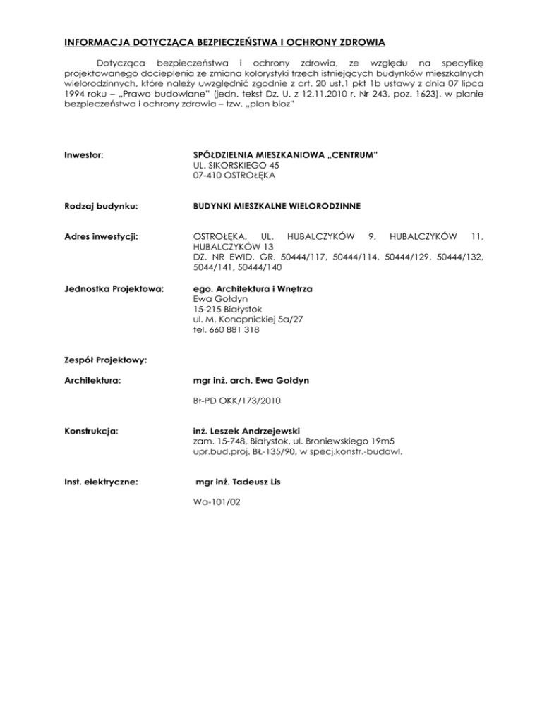 INFORMACJA DOTYCZĄCA BEZPIECZEŃSTWA I OCHRONY ZDROWIA Dotycząca bezpieczeństwa i ochrony zdrowia, ze względu na specyfikę projektowanego docieplenia ze zmiana kolorystyki trzech istniejących budynków mieszkalnych wielorodzinnych, które naleŜy uwzględnić zgodnie z art. 20 ust.1 pkt 1b ustawy z dnia 07 lipca 1994 roku – „Prawo budowlane” (jedn. tekst Dz. U. z 12.11.2010 r. Nr 243, poz. 1623), w planie bezpieczeństwa i ochrony zdrowia – tzw. „plan bioz” Inwestor: SPÓŁDZIELNIA MIESZKANIOWA „CENTRUM” UL. SIKORSKIEGO 45 07-410 OSTROŁĘKA Rodzaj budynku: BUDYNKI MIESZKALNE WIELORODZINNE Adres inwestycji: OSTROŁĘKA, UL. HUBALCZYKÓW 9, HUBALCZYKÓW 11, HUBALCZYKÓW 13 DZ. NR EWID. GR. 50444/117, 50444/114, 50444/129, 50444/132, 5044/141, 50444/140 Jednostka Projektowa: ego. Architektura i Wnętrza Ewa Gołdyn 15-215 Białystok ul. M. Konopnickiej 5a/27 tel. 660 881 318 Zespół Projektowy: Architektura: mgr inŜ. arch. Ewa Gołdyn Bł-PD OKK/173/2010 Konstrukcja: inŜ. Leszek Andrzejewski zam. 15-748, Białystok, ul. Broniewskiego 19m5 upr.bud.proj. BŁ-135/90, w specj.konstr.-budowl. Inst. elektryczne: mgr inŜ. Tadeusz Lis Wa-101/02 I.ZAKRES ROBÓT BUDOWLANYCH 1) Prace ziemne – wykonanie wykopów. Roboty ziemne - przed rozpoczęciem wykonywania robót ziemnych naleŜy określić trasy przebiegu urządzeń podziemnych, w szczególności kabli energetycznych, telefonicznych, przewodów gazowych, instalacji wodociągowej, itp. W razie przypadkowego odkrycia w trakcie wykonywania robót ziemnych, jakichkolwiek nieoznaczonych w dokumentacji przewodów instalacji, o których mowa powyŜej - naleŜy niezwłocznie przerwać roboty do czasu ustalenia pochodzenia tych instalacji i określenia, czy i w jaki sposób moŜliwe jest w tym miejscu dalsze bezpieczne prowadzenie robót. Przy prowadzeniu robót sposobem ręcznym dopuszcza się wykonywanie wykopów szeroko przestrzennych do głębokości nie większej niŜ 2 m, a wąsko przestrzennych do głębokości 1 m, bez dodatkowego zabezpieczenia. Przy wykonywaniu wykopów na, ulicy, w miejscu dostępnym dla ludzi, naleŜy wokół wykopu ustawić poręcze ochronne zaopatrzone w napis: „Osobom postronnym wstęp wzbroniony". Przy wykonywaniu robót ziemnych sprzętem mechanicznym naleŜy wyznaczyć w terenie strefę niebezpieczną minimum 6 m. 2) Wykonanie izolacji przeciwwodnych i przeciwwilgociowych; 3) Prace murarskie 4) Prace pokryciowe; 5) Wstawienie stolarki; 6) Wykonanie izolacji pionowych termicznych; 7) Prace wykończeniowe –obróbki blacharskie itp. II. STAN ISTNIEJĄCY Dojazd na działkę moŜliwy jest bezpośrednio z ul. Hubalczyków. Ukształtowanie terenu w większości płaskie, z lekkim spadkiem w kierunku północnym. Przedmiotowe budynki znajdują się na terenie osiedla zabudowy mieszkaniowej wielorodzinnej. Na przedmiotowych działkach, oprócz budynków objętych opracowaniem, znajdują się trzy zewnętrzne wolnostojące skrzynki kurków gazowych przewidziane do remontu. Teren nie jest ogrodzony, ciągi piesze wykonane są z płyt betonowych oraz z betonowej kostki brukowej - polbruku. Przedmiotowe budynki stanowią jedną nieruchomość, posiadają bezpośrednio ze sobą sąsiadujące oddylatowane ściany szczytowe. Dodatkowo budynek przy ul. Hubalczyków 13 sąsiaduje bezpośrednio poprzez zdylatowaną ścianę szczytową z budynkiem mieszkalnym wielorodzinnym przy ul. Grota Roweckiego. Wejścia główne do klatek schodowych w przedmiotowych budynkach usytuowane są od strony ul. Hubalczyków – od strony południowo-wschodniej i wschodniej w budynku przy ul. Hubalczyków 9 i 11 oraz od strony północnej w budynku przy ul. Hubalczyków 13. Prace projektowe nie przewidują zmian w istniejącym zagospodarowaniu terenu – bez zmian. III. PRZEWIDYWANE ZAGROśENIA REALIZACJI ROBÓT BUDOWALNYCH. BEZPIECZEŃSTWA I ZDROWIA PRZY Przy realizacji budynku zagroŜenie moŜe wystąpić przy pracach w wykopach oraz przy wykonywaniu docieplenia oraz wykończenia elewacji. Brygady budowlane będą posiadały odpowiednie przeszkolenie oraz będą nadzorowane przez osoby posiadające uprawnienia budowlane wykonawcze w stosownym zakresie. Wykonanie elewacji wymaga szczególnej ostroŜności, dlatego zatrudnieni robotnicy powinni stanowić zgrany zespół o wysokich umiejętnościach i doświadczeniu. Innych zagroŜeń się nie przewiduje. Ryzyko poraŜenia prądem elektrycznym podczas montaŜu projektowanych instalacji elektrycznych. Ryzyko poraŜenia prądem elektrycznym przy podłączaniu kabli i przewodów. PRACE NA WYSOKOŚCI Prace na wysokości powinny być organizowane i wykonywane w sposób niezmuszający pracownika do wychylania się poza poręcz balustrady lub obrys urządzenia, na którym stoi. Przy pracach na drabinach, klamrach, rusztowaniach i innych podwieszeniach na wysokości do 2 m nad poziomem podłogi lub ziemi, naleŜy zapewnić, aby: - drabiny, klamry, pomosty i inne urządzenia były stabilne i zabezpieczone przed zmianą połoŜenia oraz posiadały odpowiednią wytrzymałość na przewidywane obciąŜenie. - powierzchnia pomostu powinna być wystarczająca dla pracowników, narzędzi i niezbędnych materiałów. Podłoga powinna być pozioma i równa, trwale umocowana do elementów konstrukcyjnych pomostu. - w widocznym miejscu pomostu powinny być umieszczone czytelne informacje o wielkości dopuszczalnego obciąŜenia. Przy pracach wykonywanych na rusztowaniach na wysokości powyŜej 2 m od otaczającego poziomu podłogi lub terenu zewnętrznego oraz na podestach ruchomych wiszących naleŜy w szczególności: - zapewnić bezpieczeństwo przy komunikacji pionowej i dojścia do stanowiska pracy. - zapewnić stabilność rusztowań i odpowiednia ich wytrzymałość na przewidywane obciąŜenie. Dokonać odbioru technicznego rusztowania przed rozpoczęciem jego uŜytkowania (z wpisem tego faktu do dziennika budowy). Przy ustawianiu lub rozbiórce rusztowań oraz przy pracach na drabinach i 